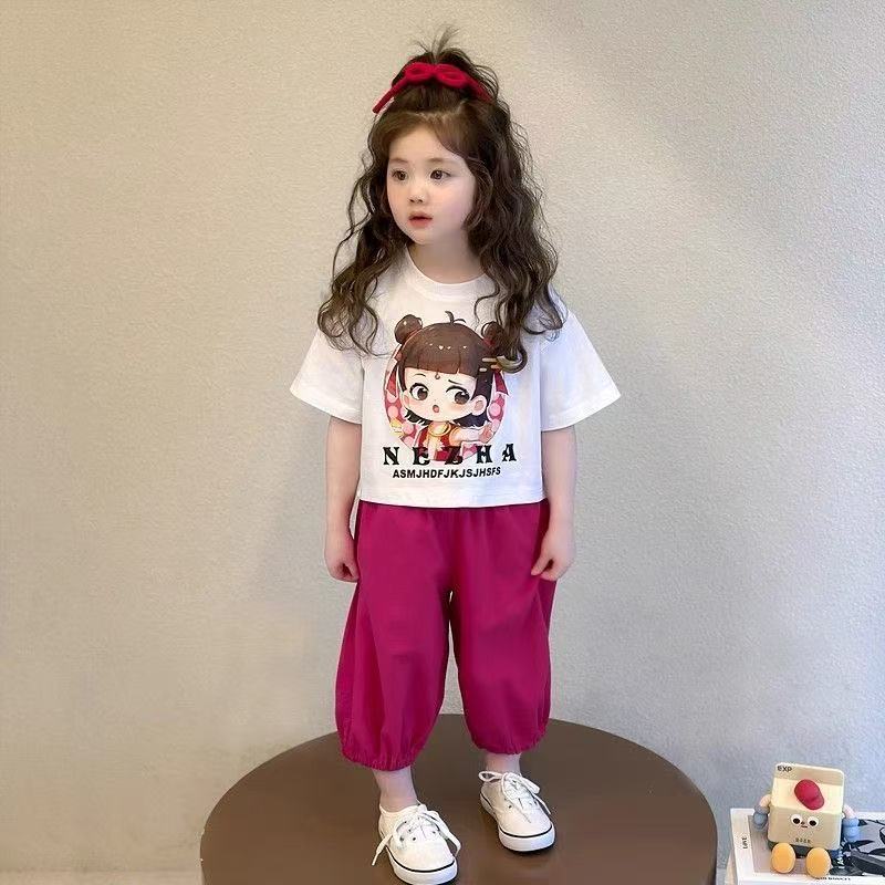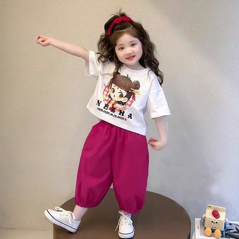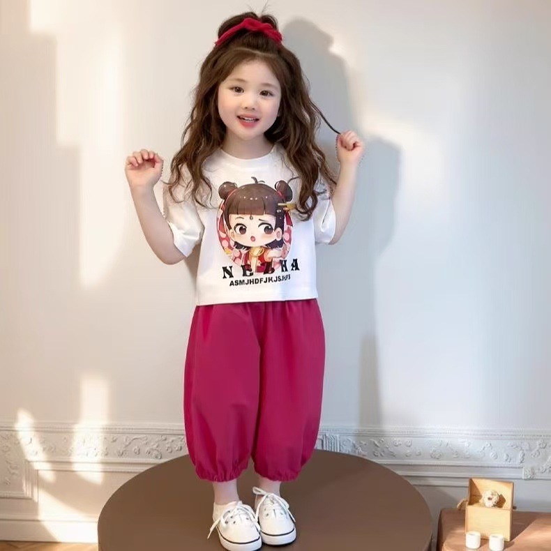 여자 아동 스포츠 정장 여름 2025 새로운 여자 아기 Nezha 반팔 여름 옷 어린 소녀 얇은 투피스 세트