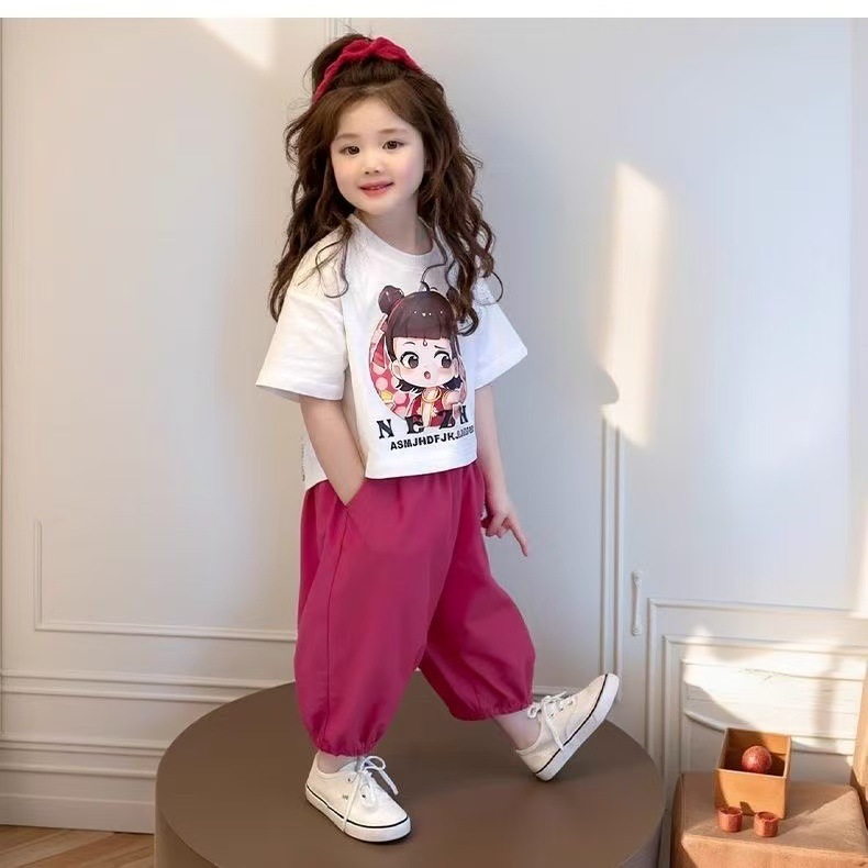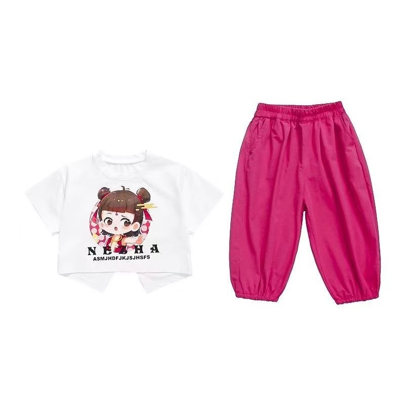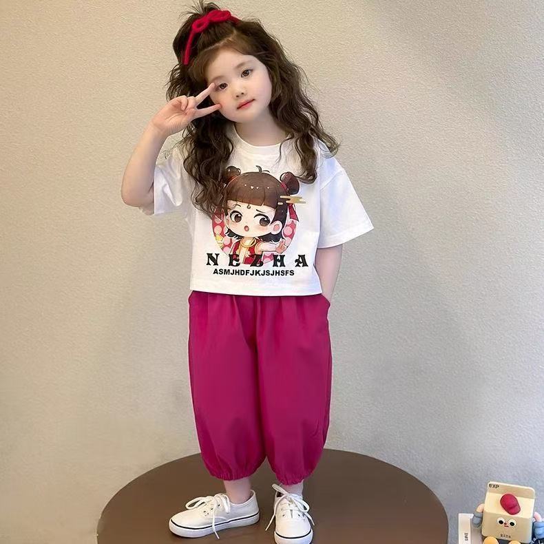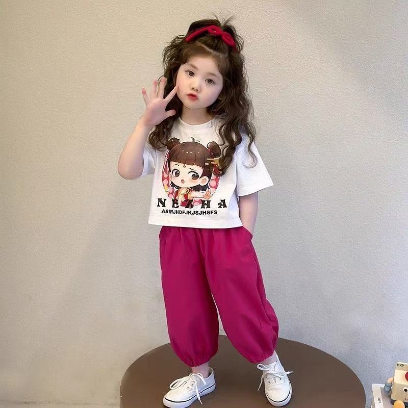 여자 아동 스포츠 정장 여름 2025 새로운 여자 아기 Nezha 반팔 여름 옷 어린 소녀 얇은 투피스 세트스토어 가기