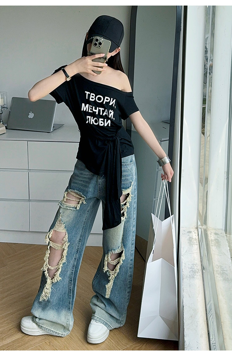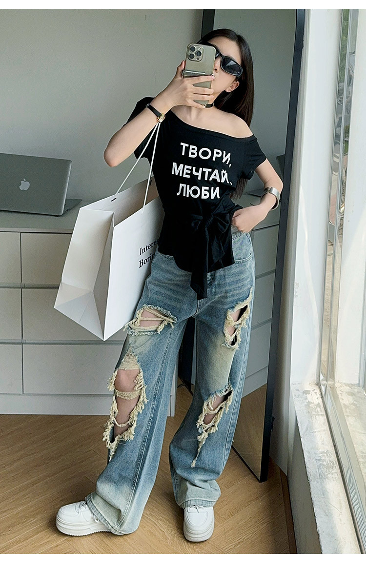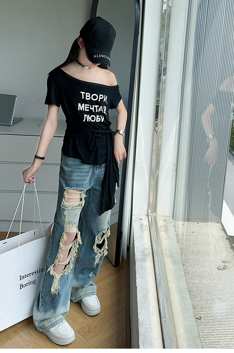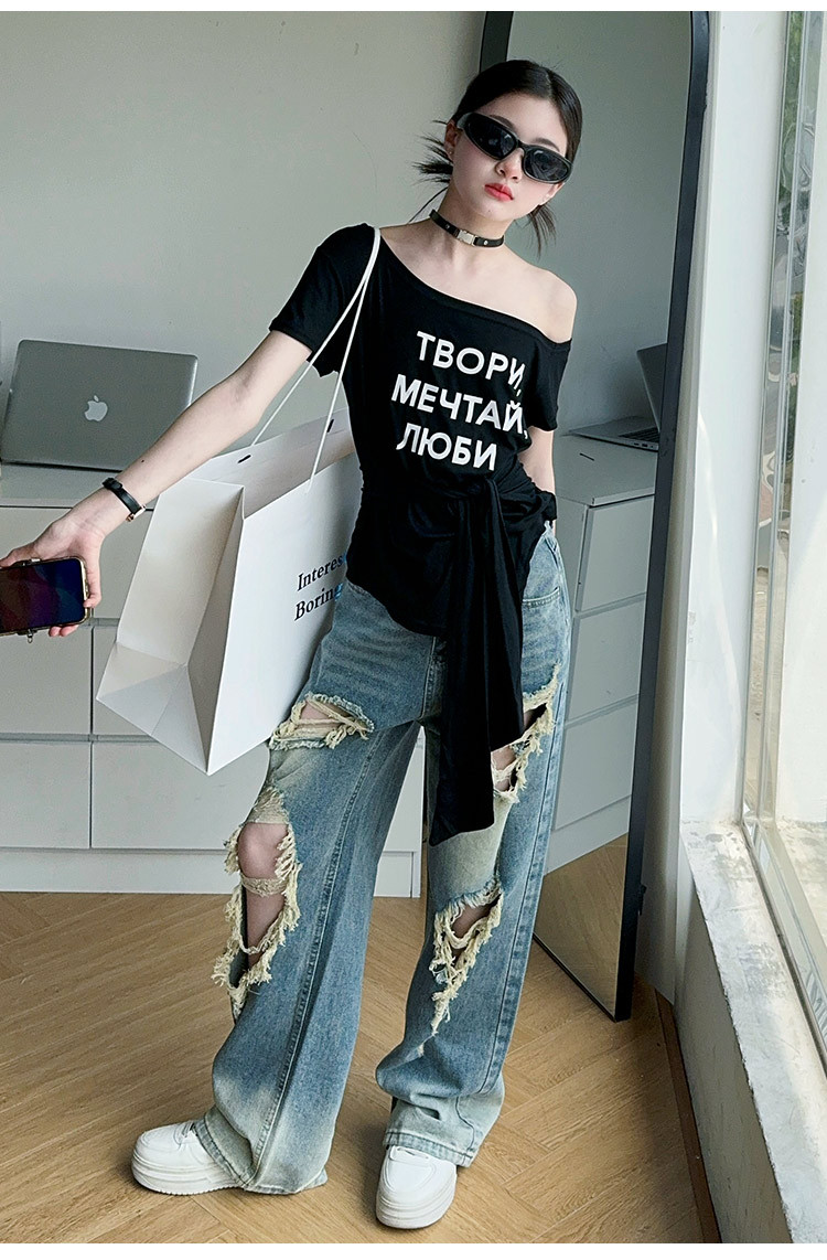소녀 2025 스파이스 레터 인쇄 슬란트 어깨 반팔 티셔츠 여름 디자인 센스 싱글 핏 타이트 웨이스트 라인 어깨 탑스토어 가기