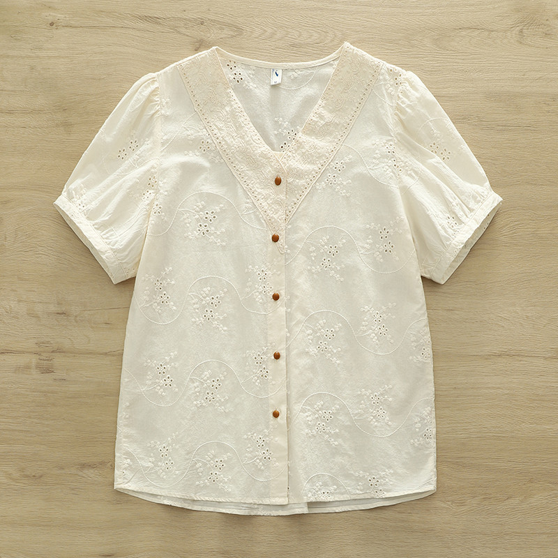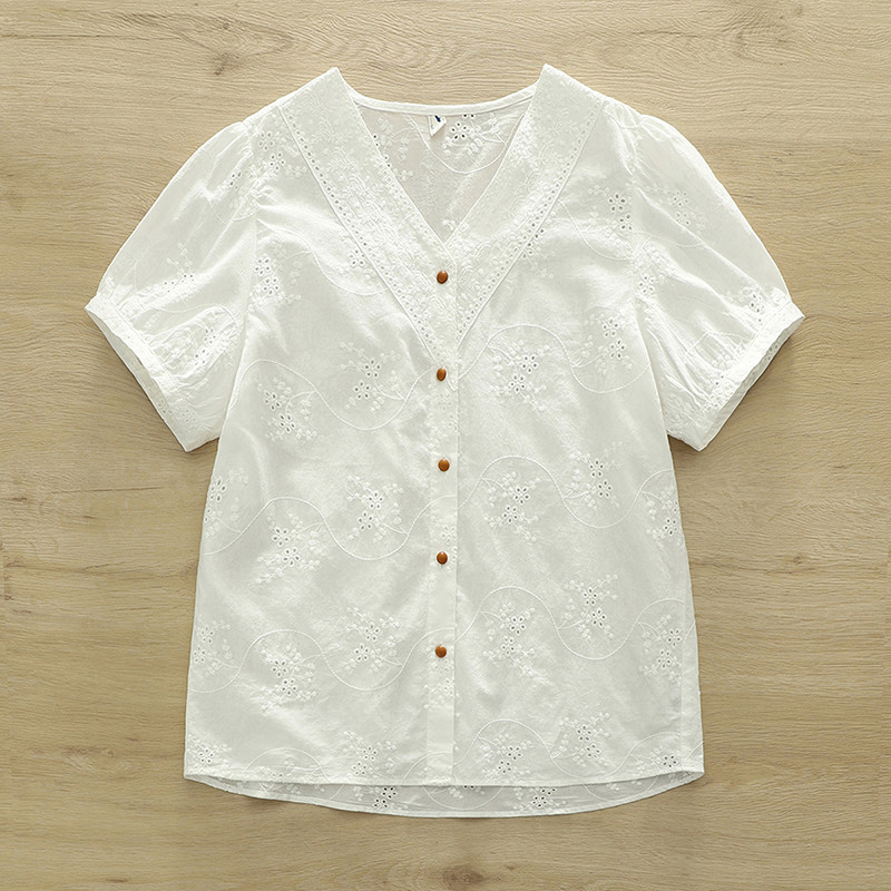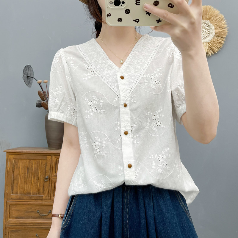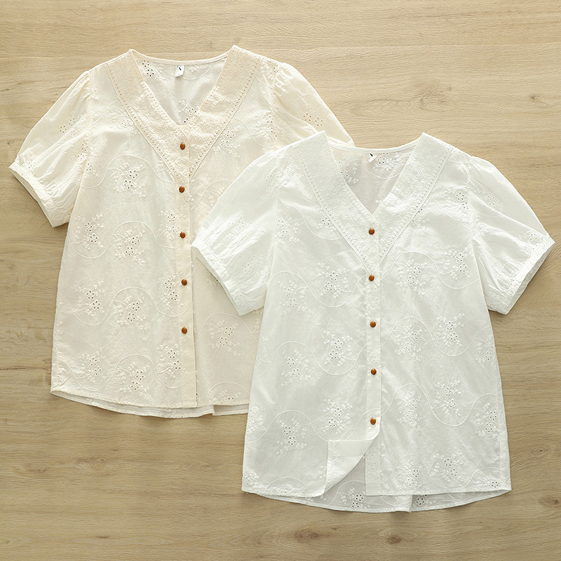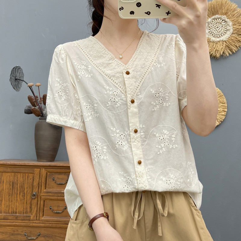 2025 여름 새로운 V 넥 자수 레이스 숙녀 카디건 반팔 셔츠 탑 도매스토어 가기