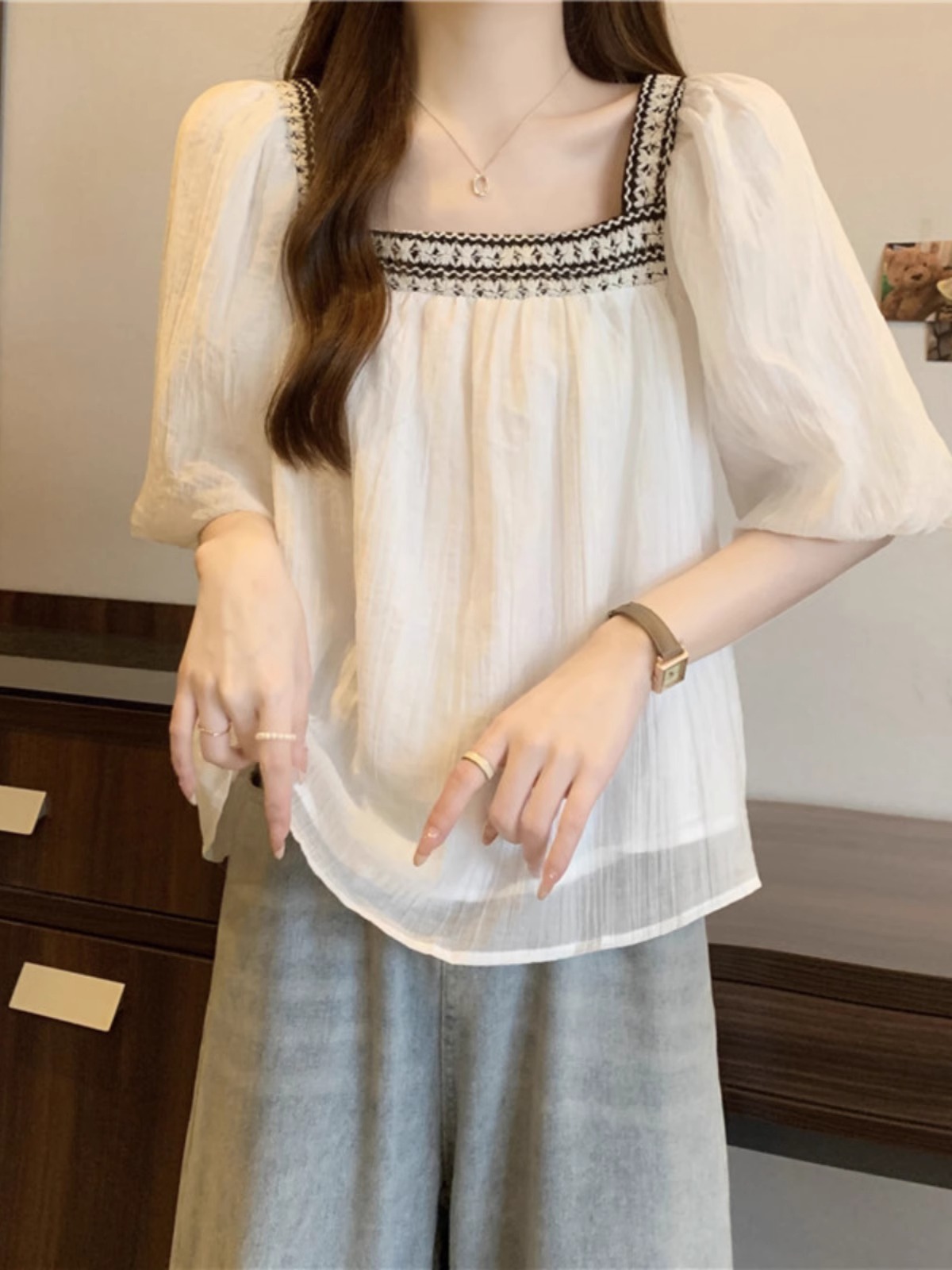 플러스 사이즈 프렌치 퍼프 슬리브 쉬폰 짧은 소매 셔츠 여성용 여름 통통녀 벨리 커버 슬리밍 인형 셔츠 탑 A3825스토어 가기