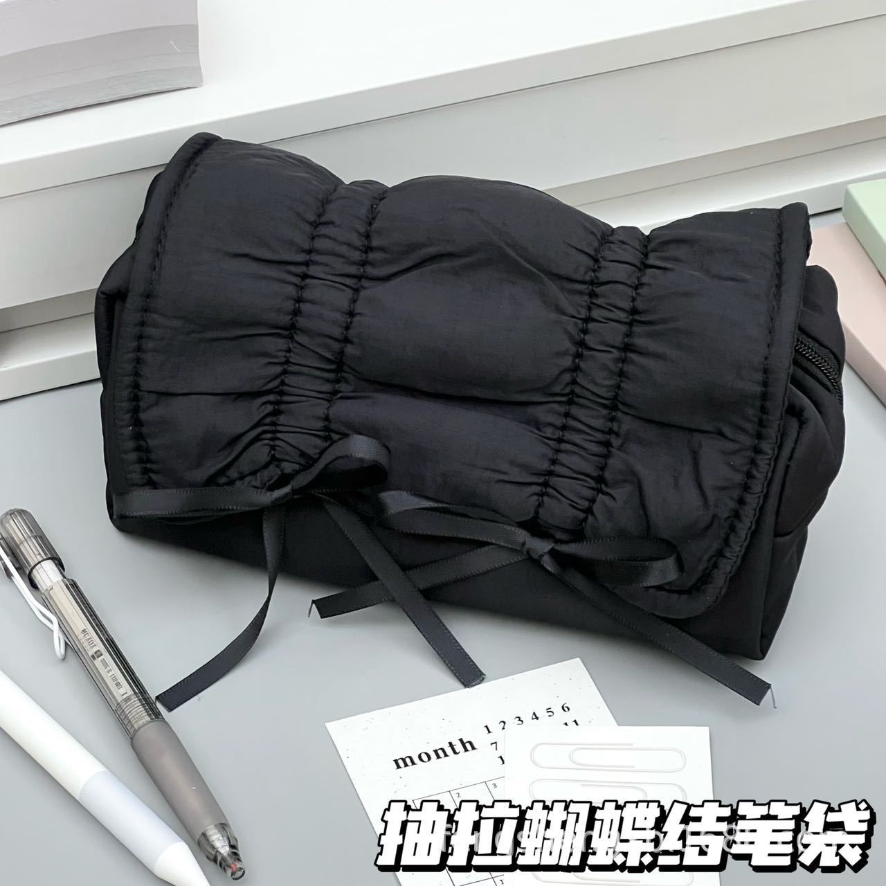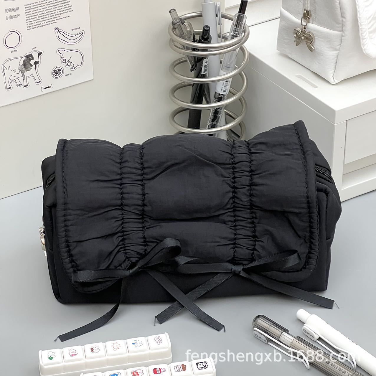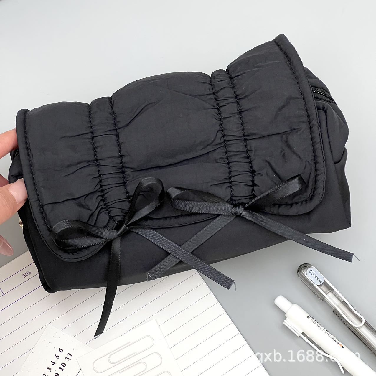 Ins 고급스러운 스타일 순수한 검정색 부드러운 당기는 활 연필 가방 대용량 학생 문구 보관 가방스토어 가기