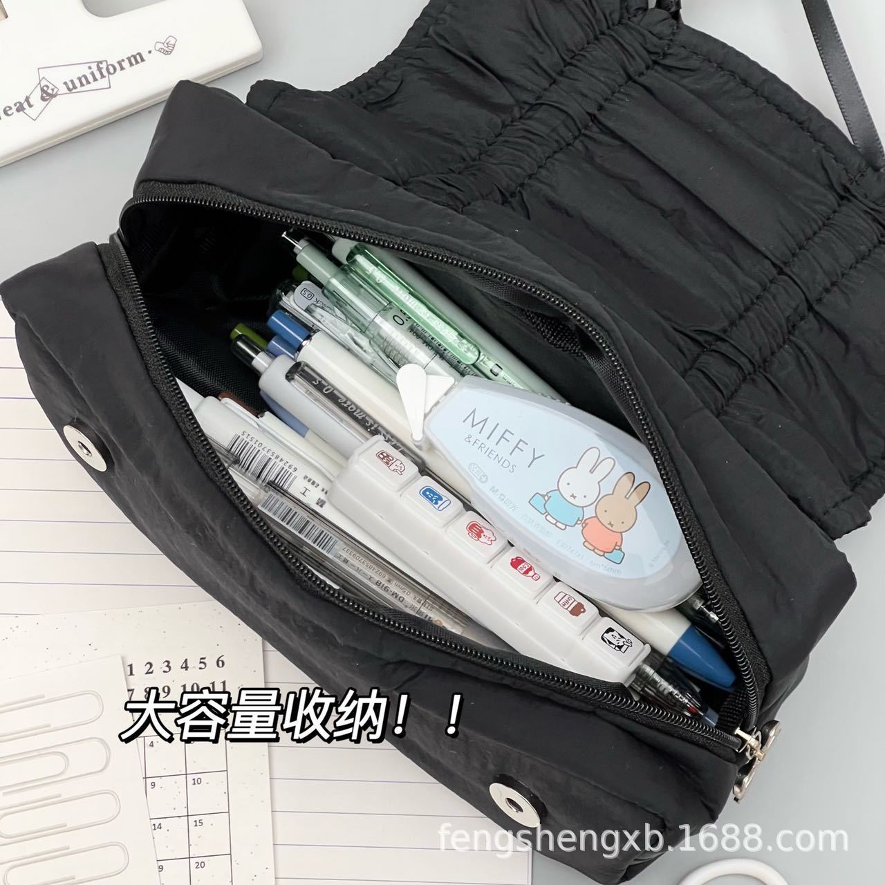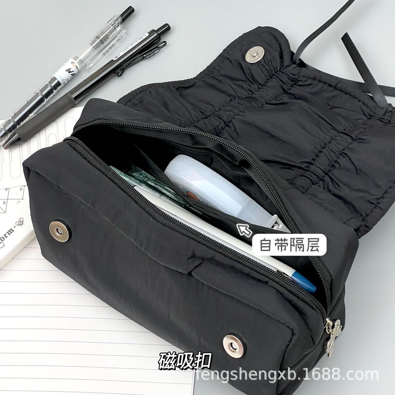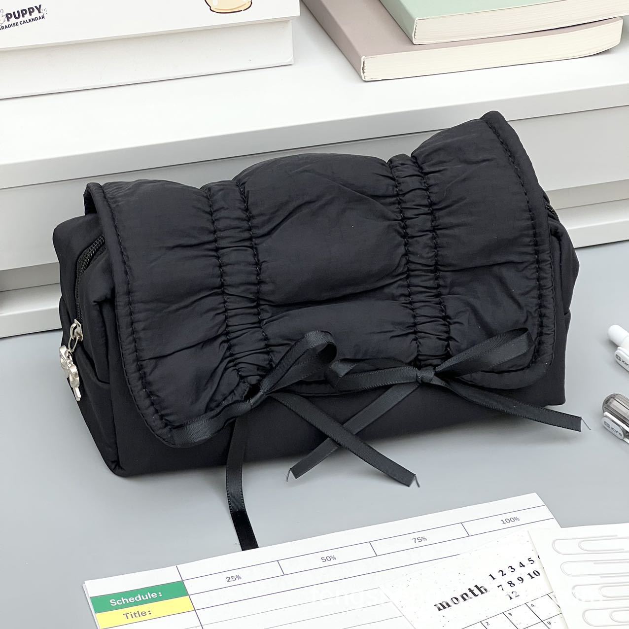 Ins 고급스러운 스타일 순수한 검정색 부드러운 당기는 활 연필 가방 대용량 학생 문구 보관 가방