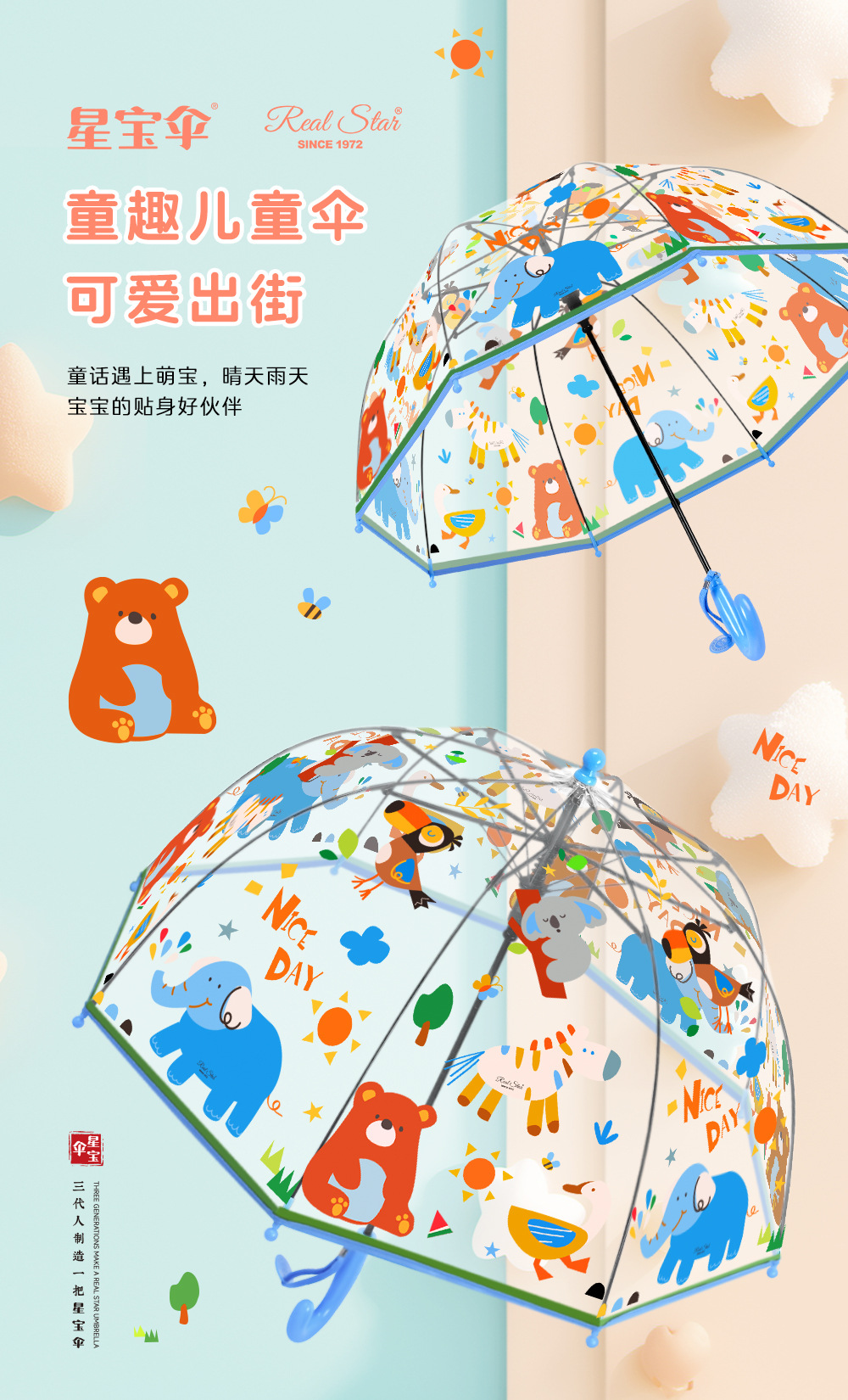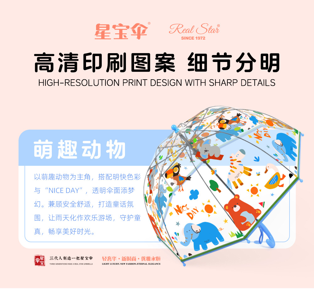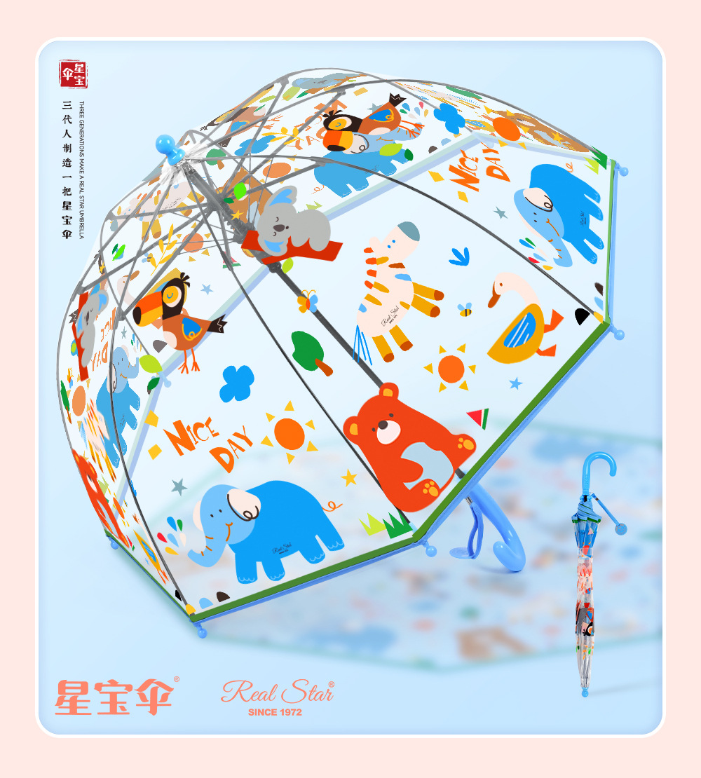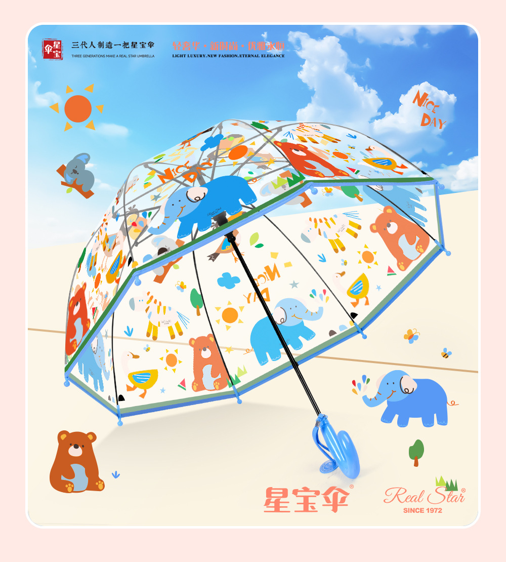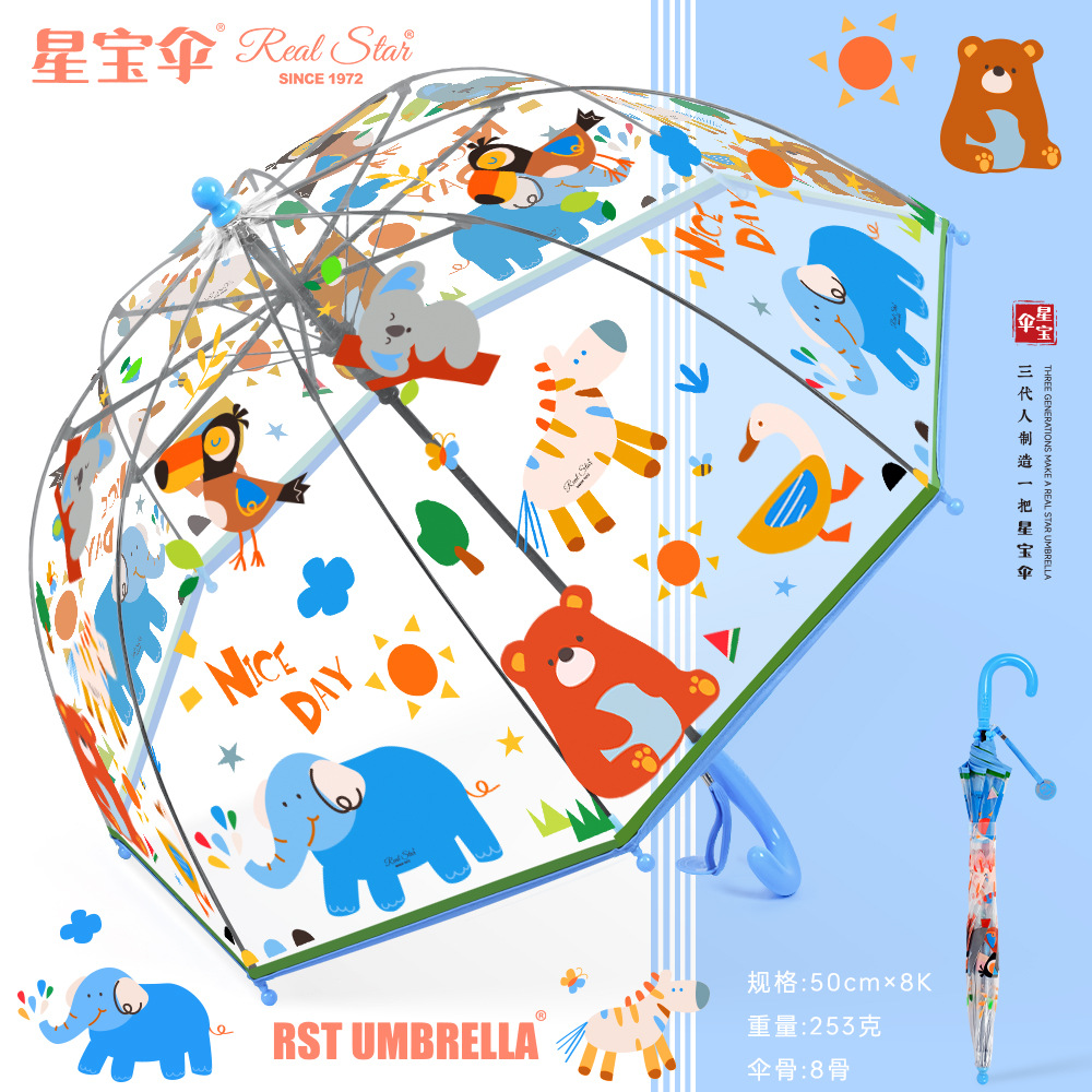 국경 간 인기 판매 어린이 우산 스트레이트 핸들 긴 우산 얼룩말 자동 열기 귀여운 코끼리 만화 패턴 아기 우산 투명스토어 가기