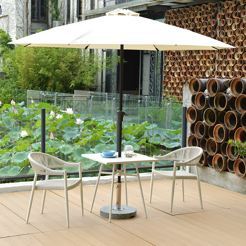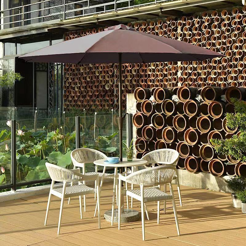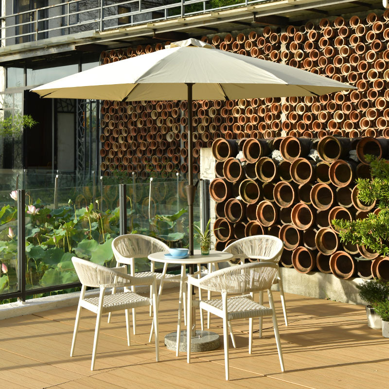 • [테이블, 의자, 우산 조합] 이중 상판 인조목 우산 2.7m개 + 팔걸이 없는 테슬린 메쉬 의자 3개 + 80CM 흰색 물잔물결 원형 테이블 1개
