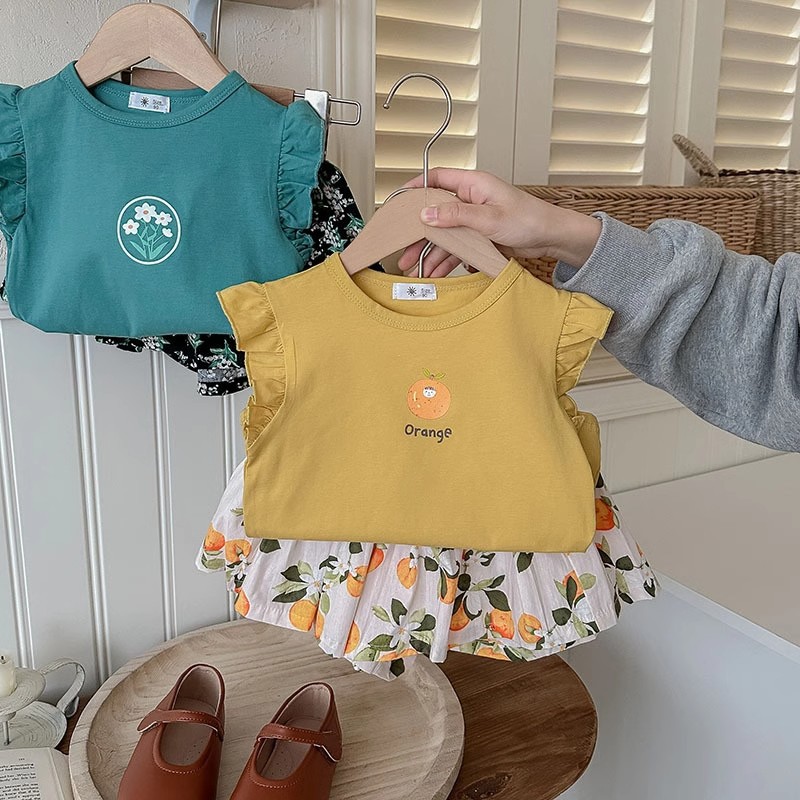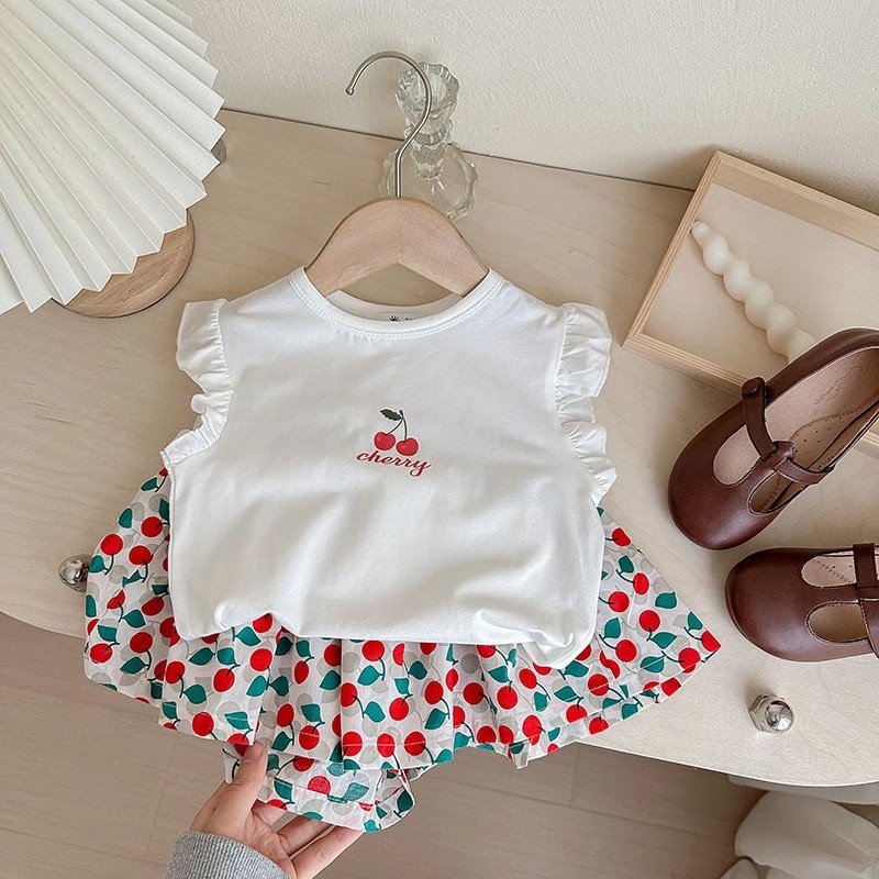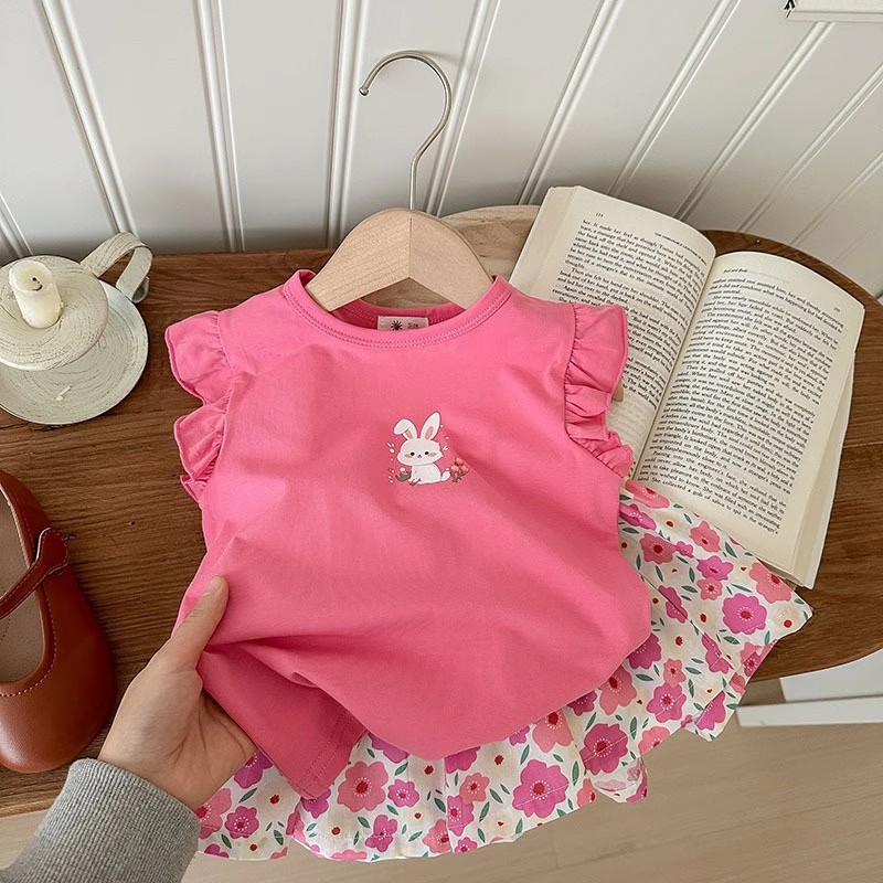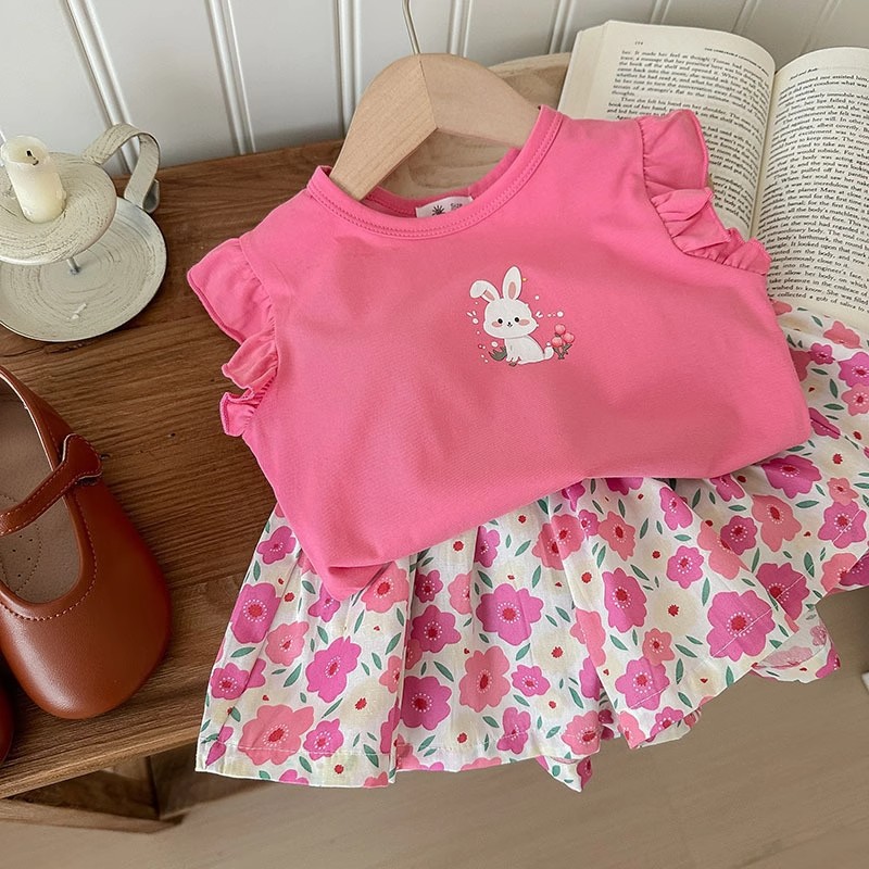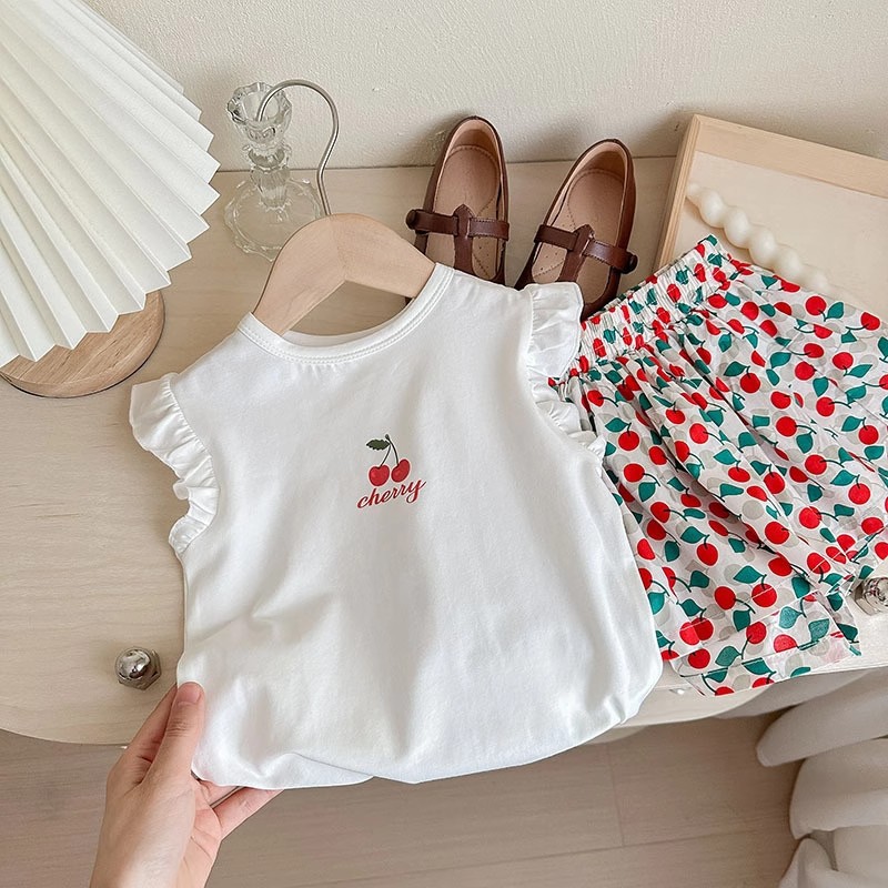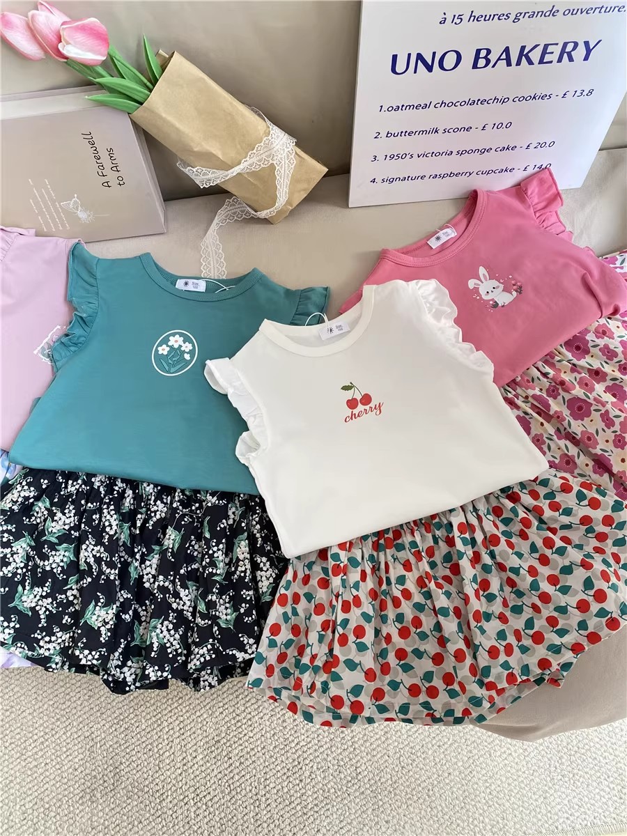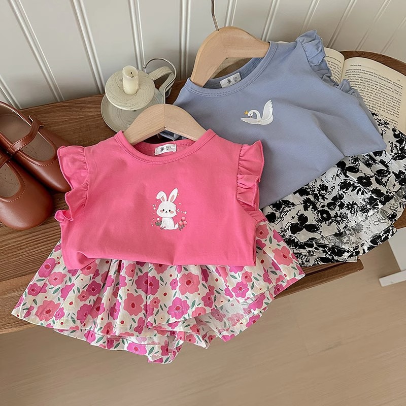 만화 비행 소매 조끼 꽃 반바지 두 조각 세트 간단한 여름 새로운 소녀 서양 스타일 만화 동물 세트스토어 가기