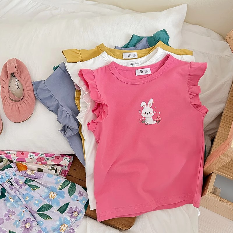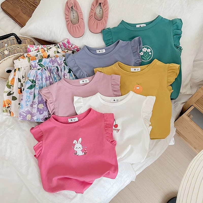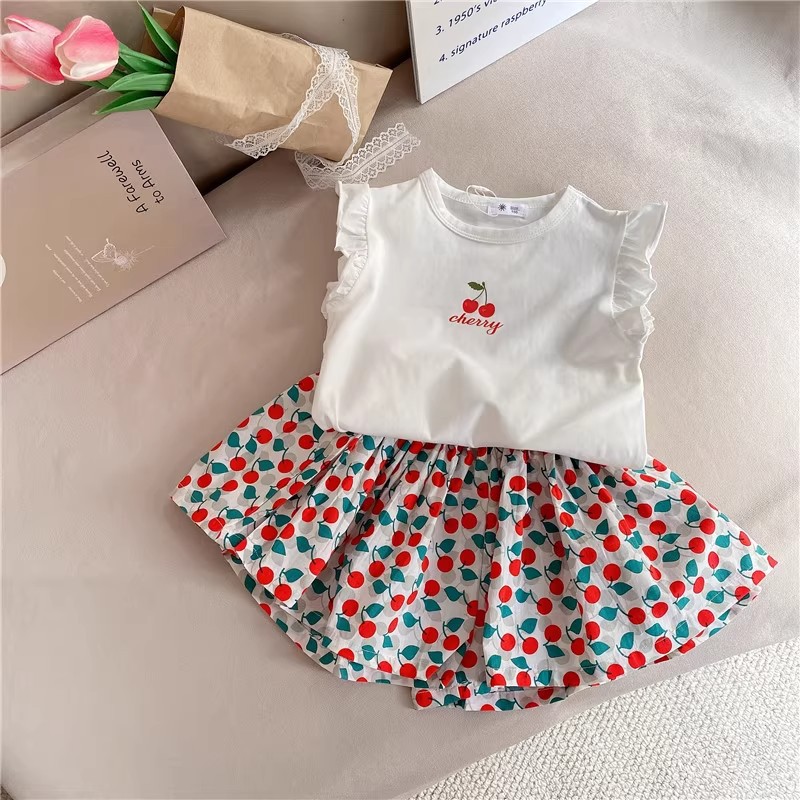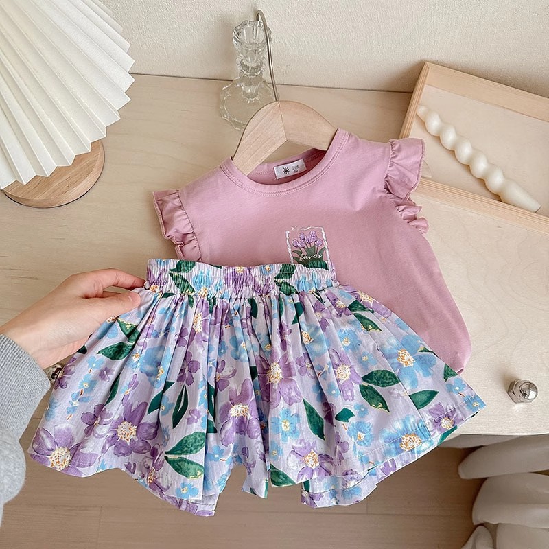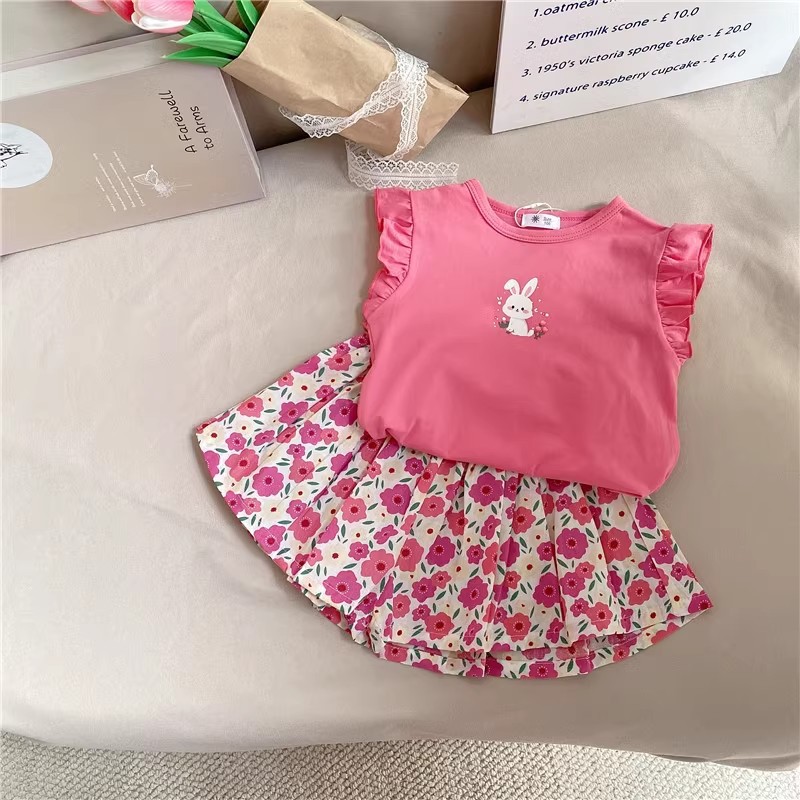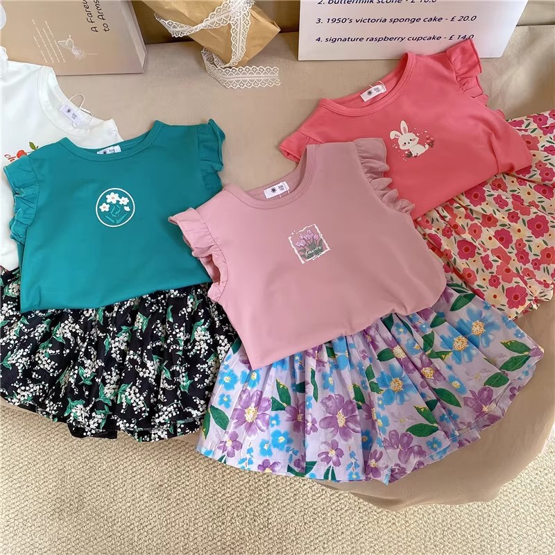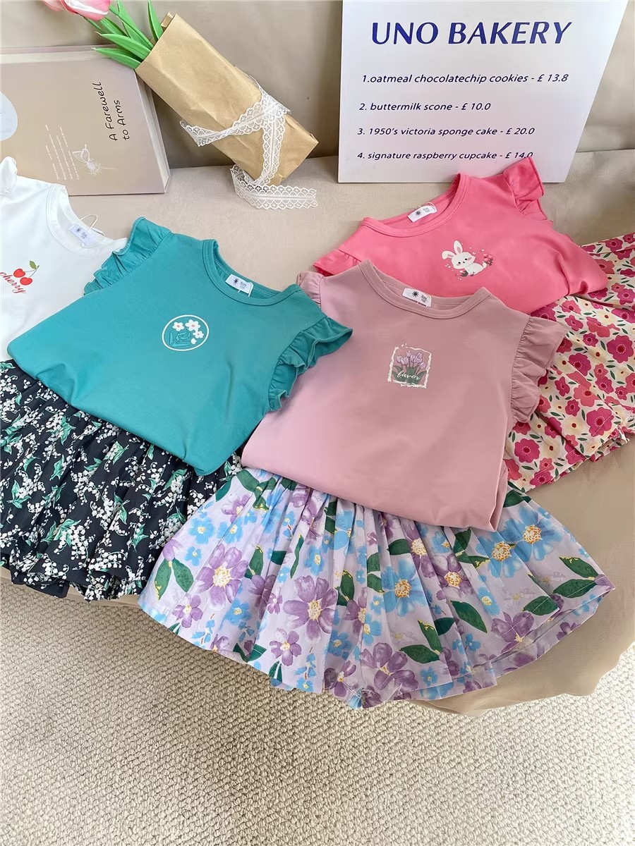 만화 비행 소매 조끼 꽃 반바지 두 조각 세트 간단한 여름 새로운 소녀 서양 스타일 만화 동물 세트스토어 가기
