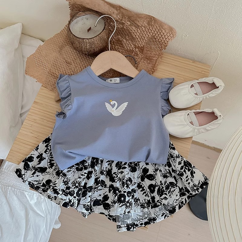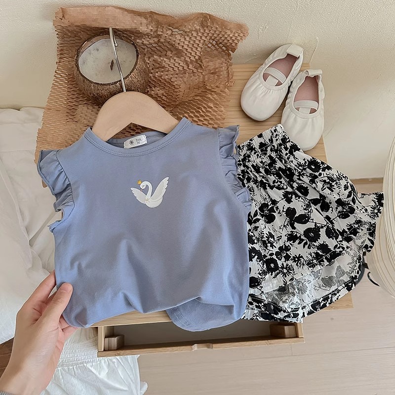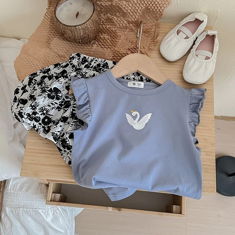 만화 비행 소매 조끼 꽃 반바지 두 조각 세트 간단한 여름 새로운 소녀 서양 스타일 만화 동물 세트