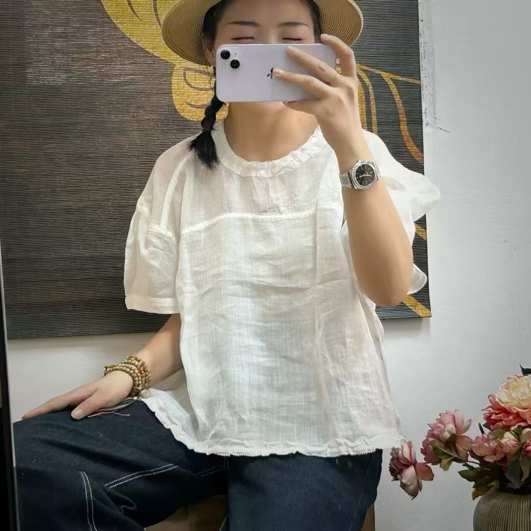2025 년 여름 새로운 바느질 꽃 꽃잎 칼라 소매 예술적 올 매치 풀오버 티셔츠 슬리브 심플 탑스토어 가기