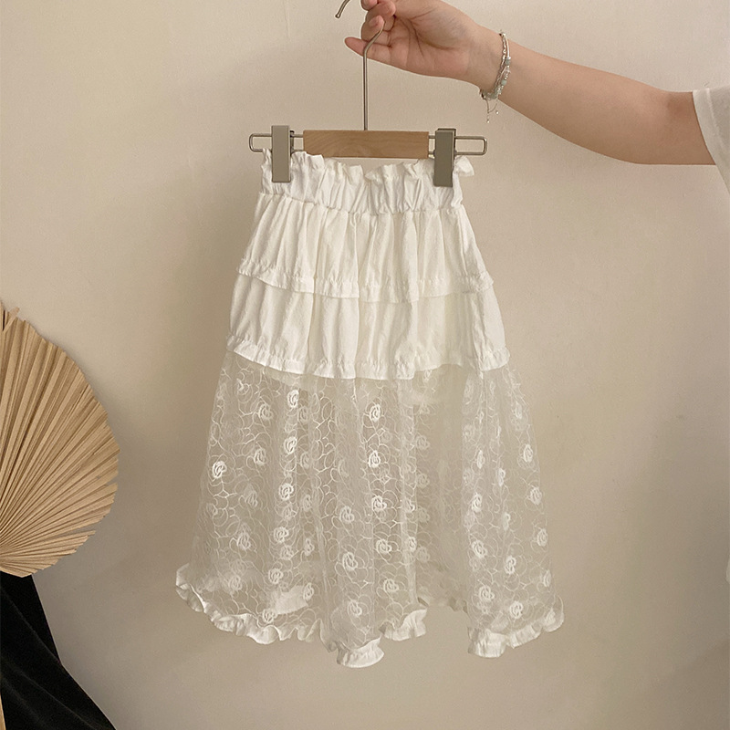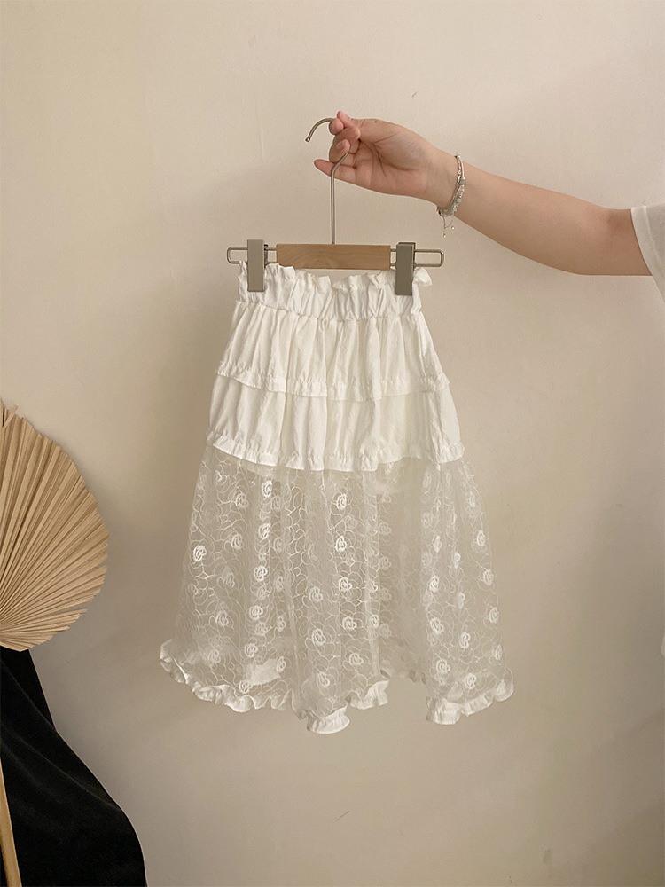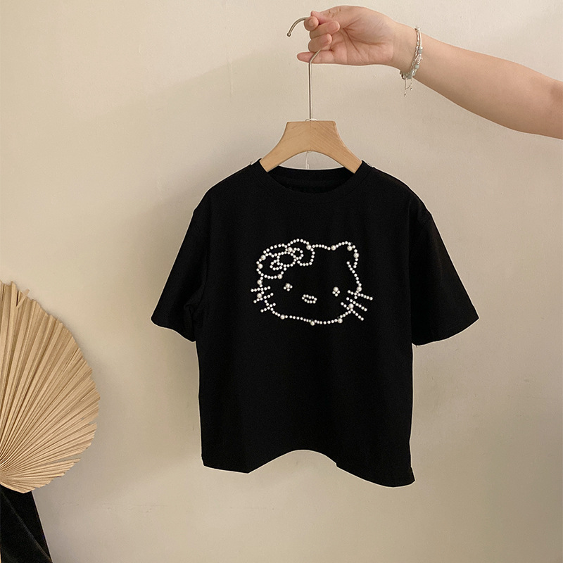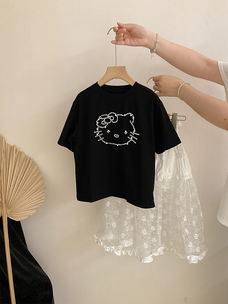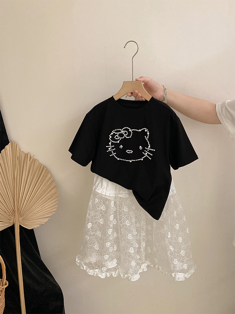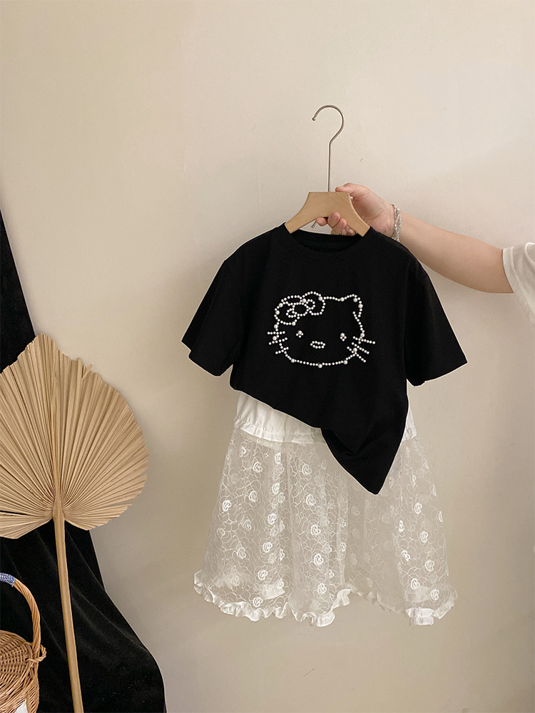 여자 여름 2025 새로운 만화 진주 고양이 반팔 탑 올 매치 플라워 레이스 스커트 투피스 세트