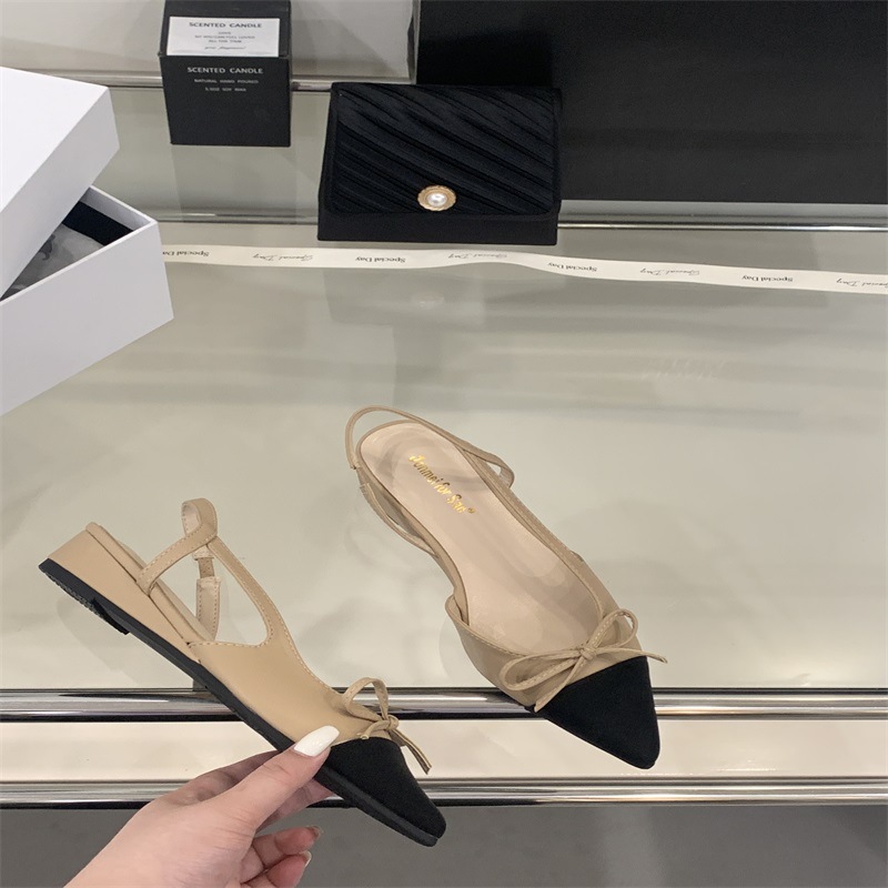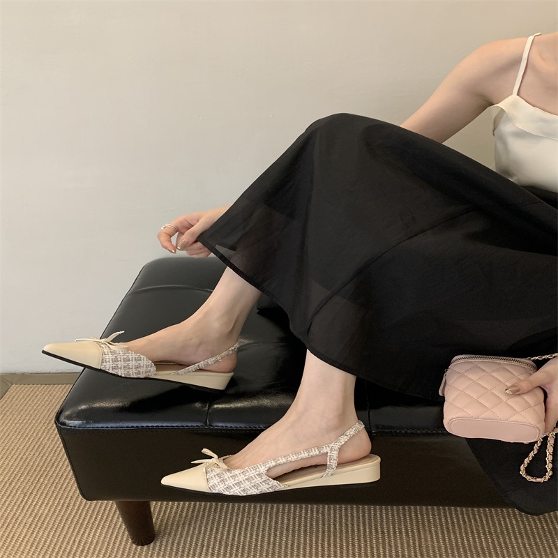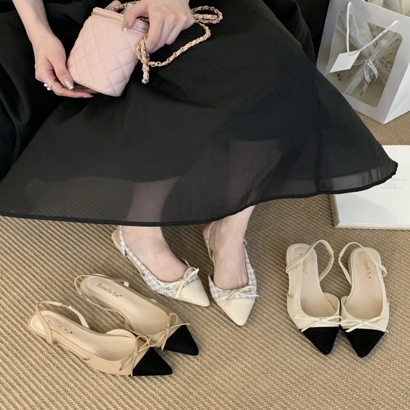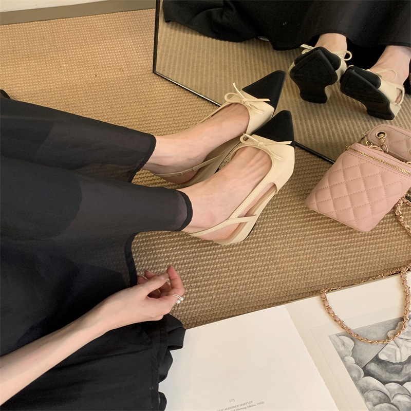 2025 여름 여성용 바오터우 샌들, 새로운 스타일, 프렌치 스타일, 리본, 두꺼운 굽, 뾰족한 발가락, 뒷부분이 빈 신발스토어 가기
