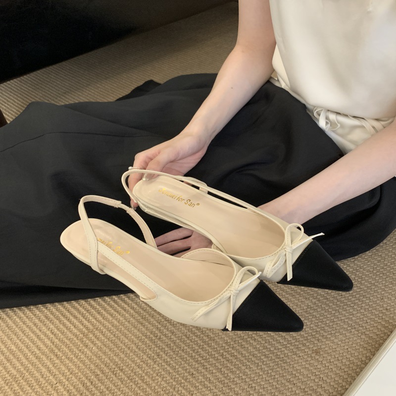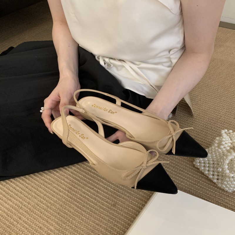 2025 여름 여성용 바오터우 샌들, 새로운 스타일, 프렌치 스타일, 리본, 두꺼운 굽, 뾰족한 발가락, 뒷부분이 빈 신발