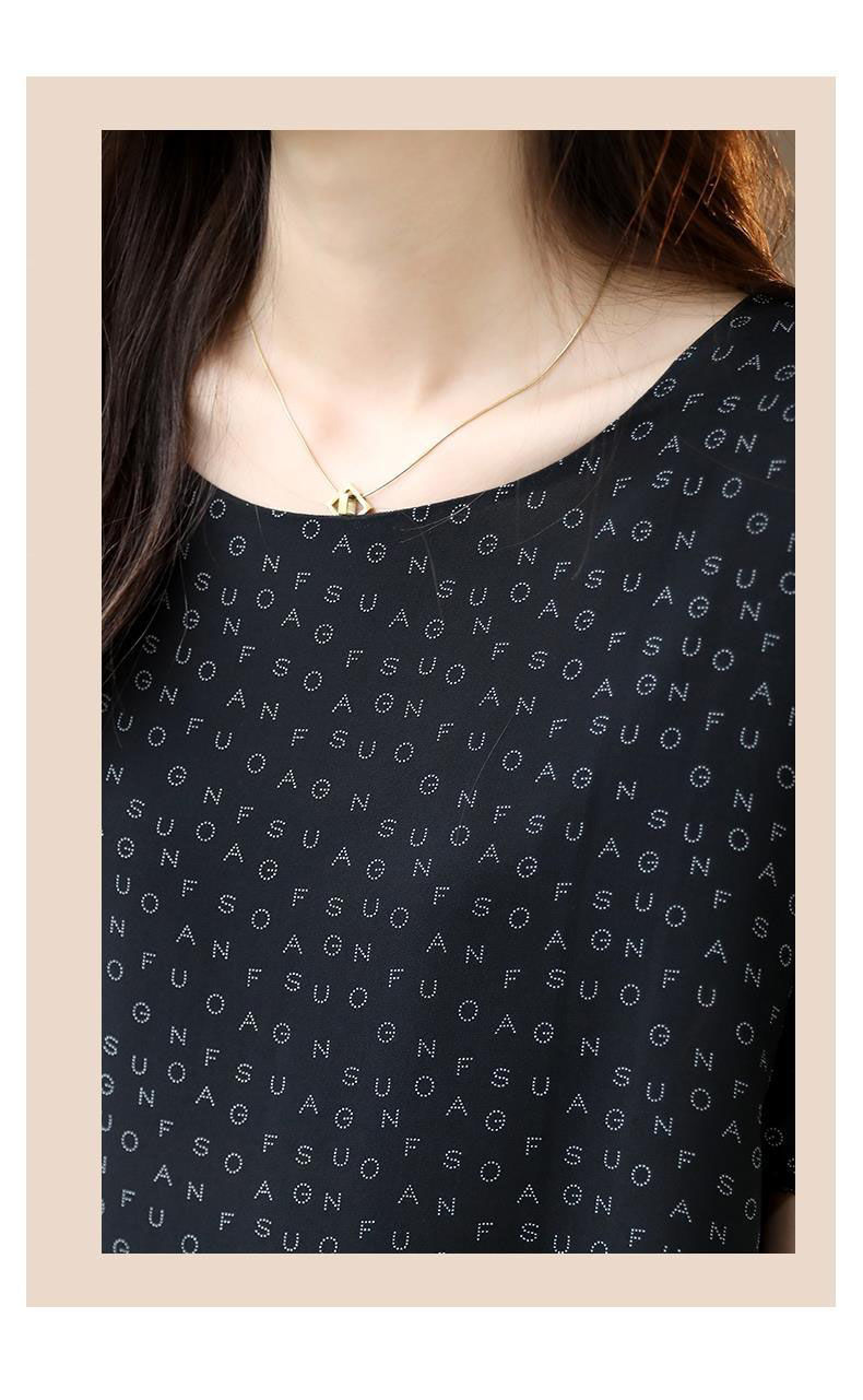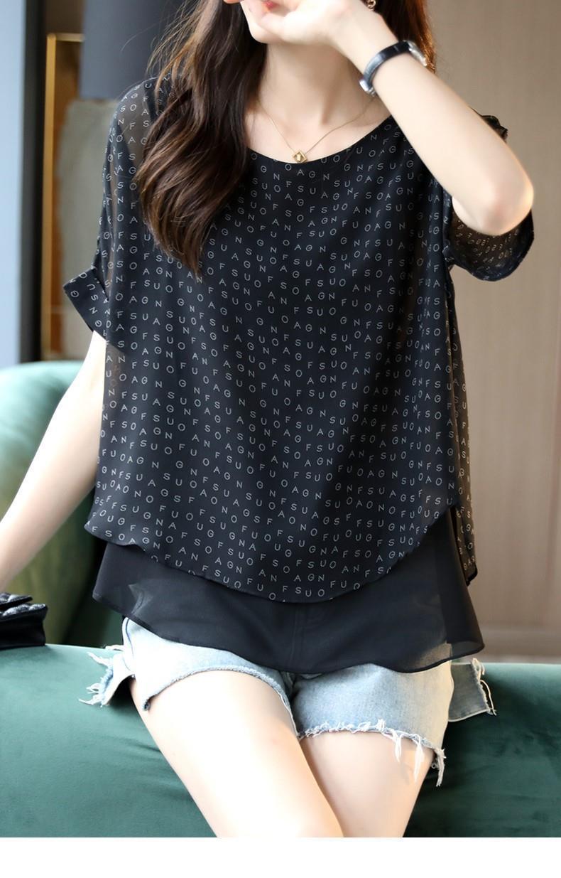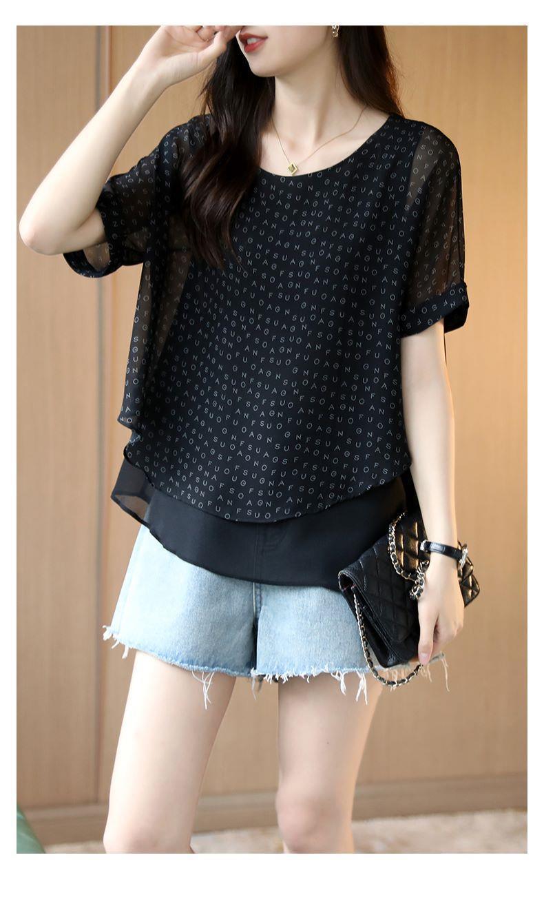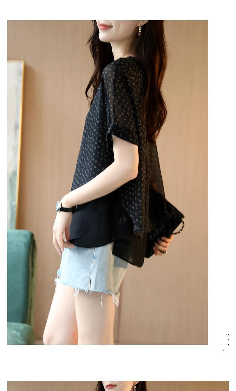 루즈한 반팔 쉬폰 셔츠 2025 여름 신작 여성용 블랙 레터 프린트 얇은 셔츠 배 커버 탑