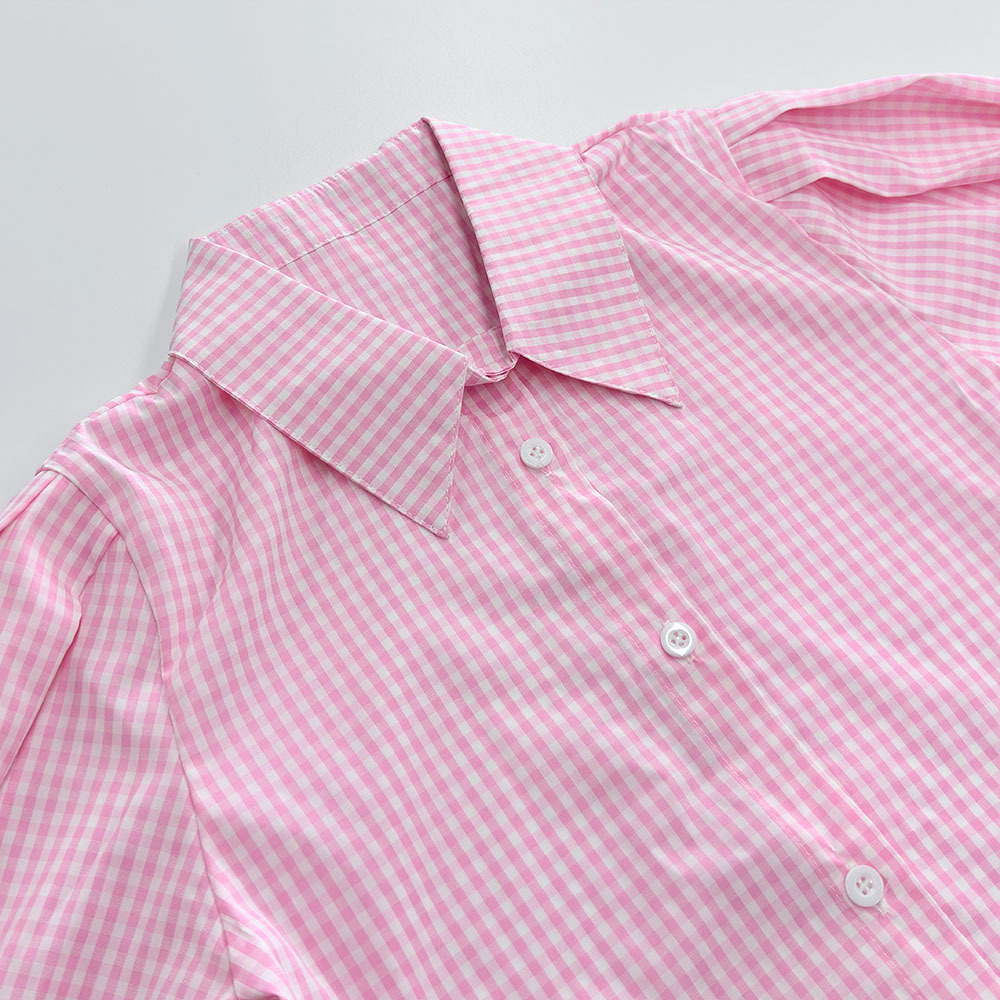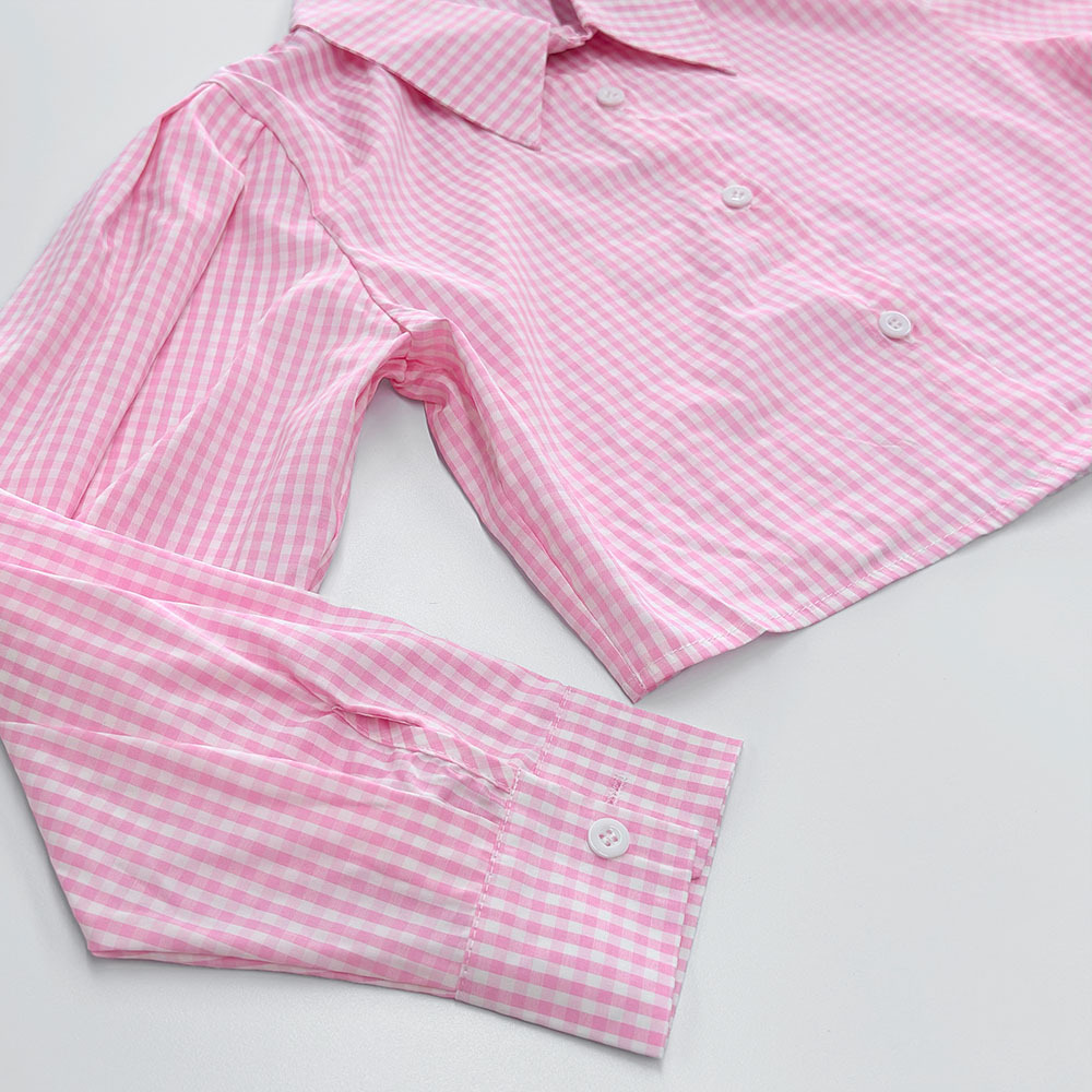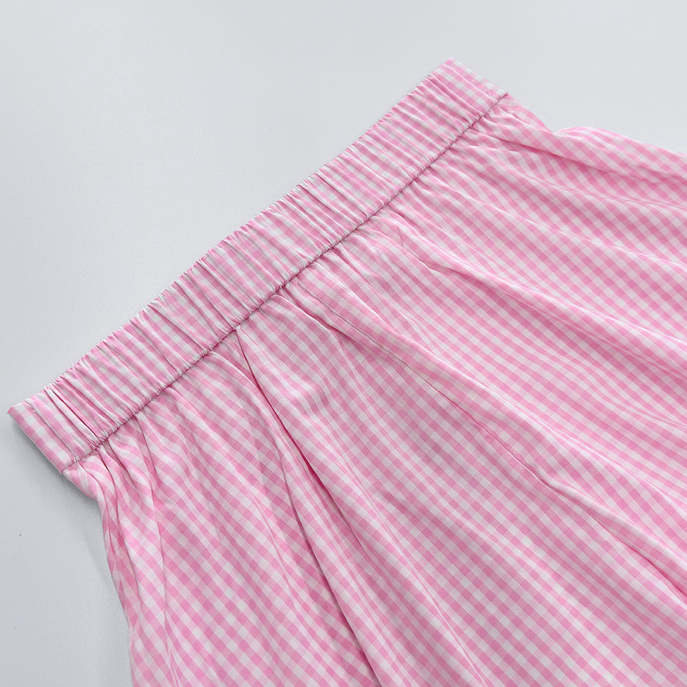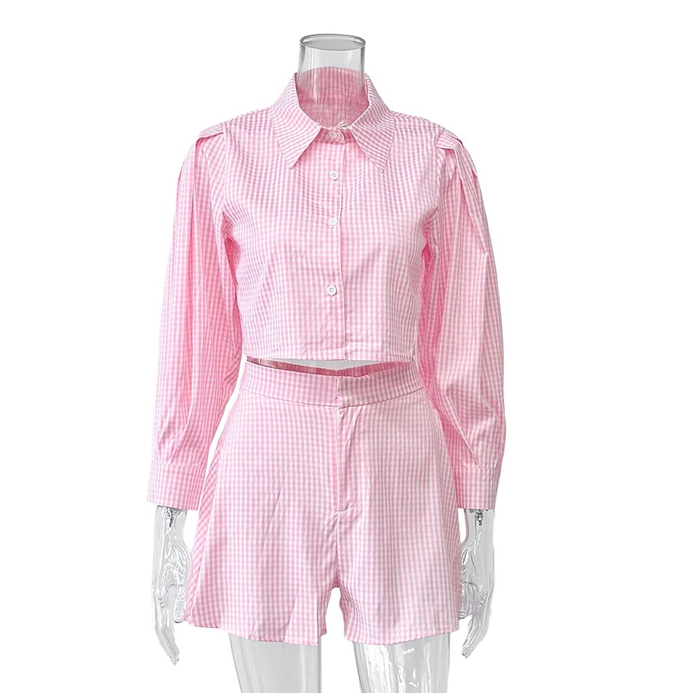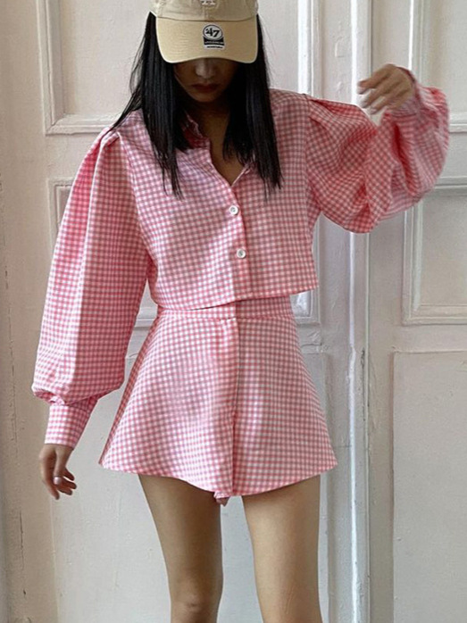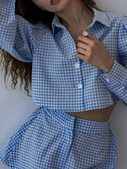 유럽과 미국의 새로운 2025 봄 캐주얼 달콤한 스타일 격자 무늬 긴 소매 셔츠 반바지 느슨한 세트 여성 국경 도매스토어 가기