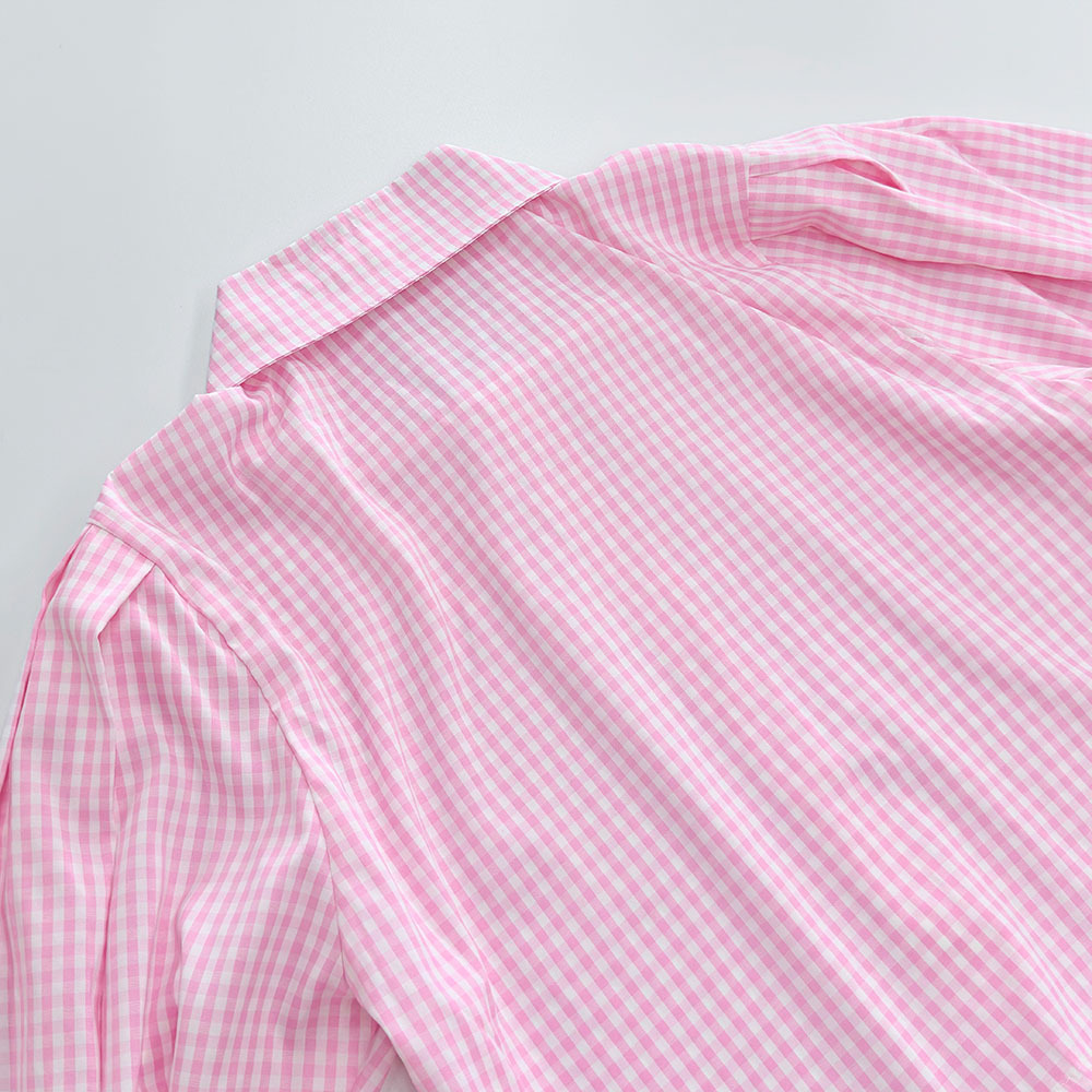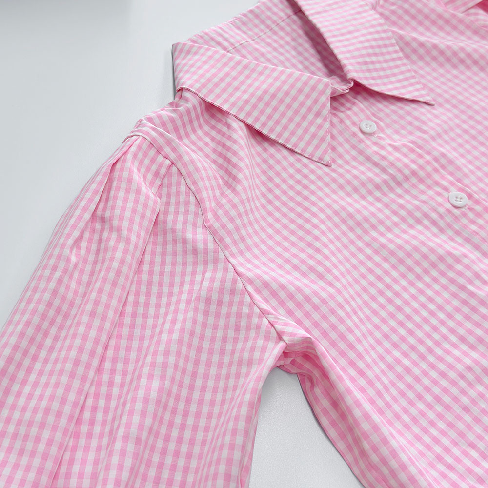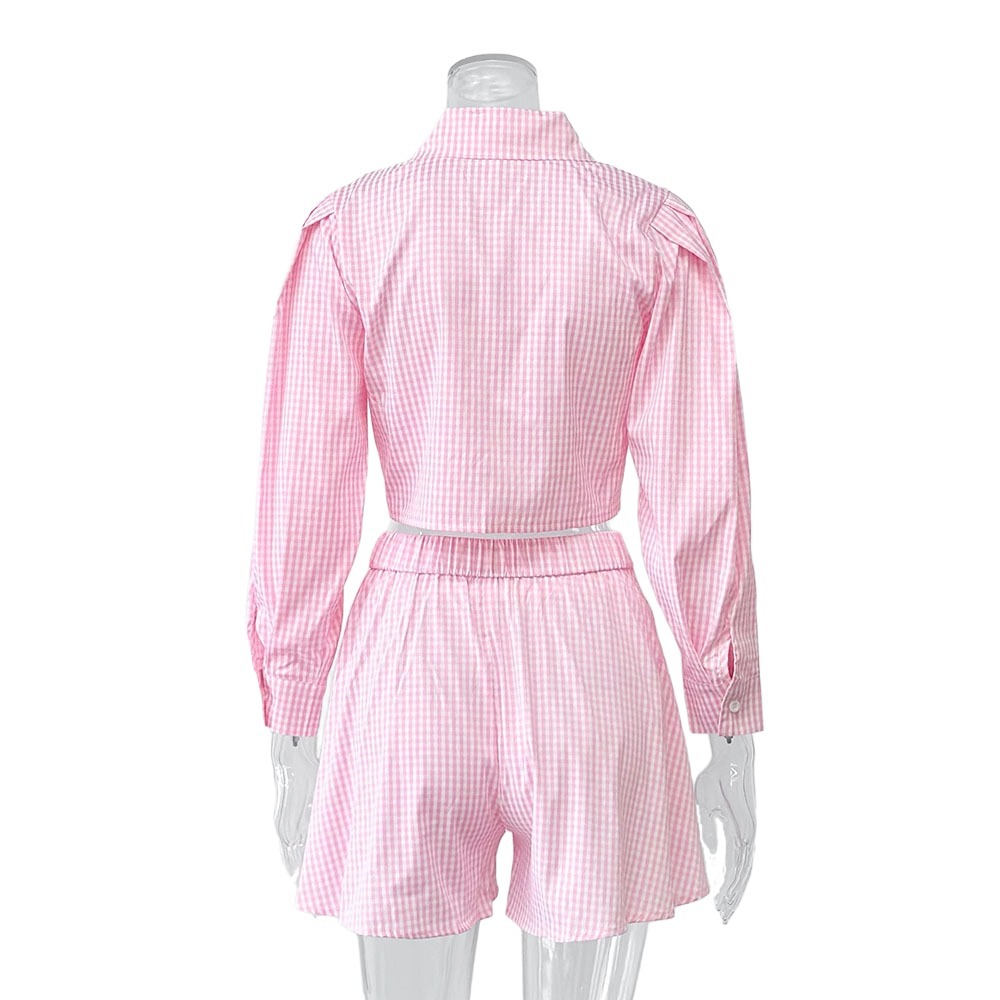유럽과 미국의 새로운 2025 봄 캐주얼 달콤한 스타일 격자 무늬 긴 소매 셔츠 반바지 느슨한 세트 여성 국경 도매