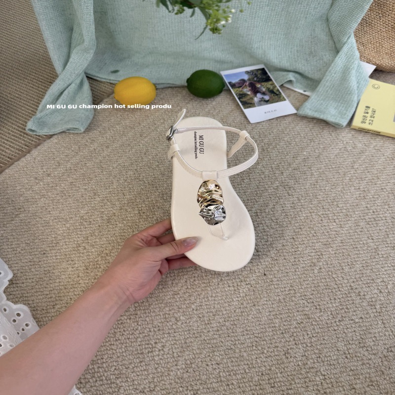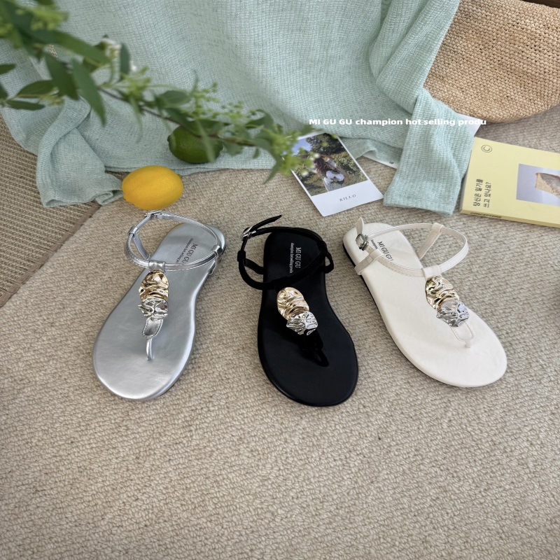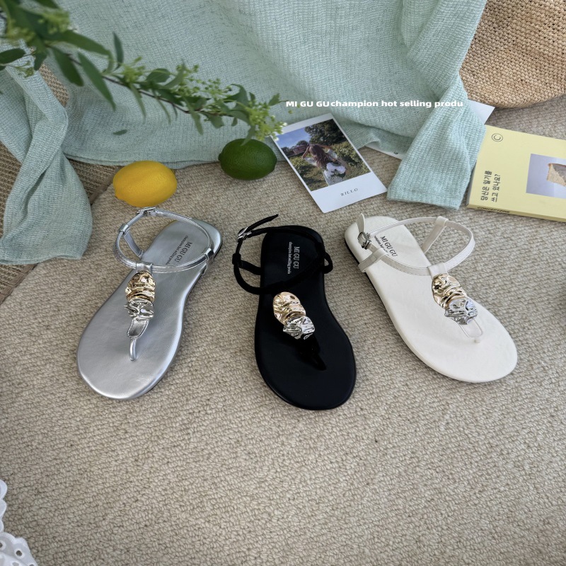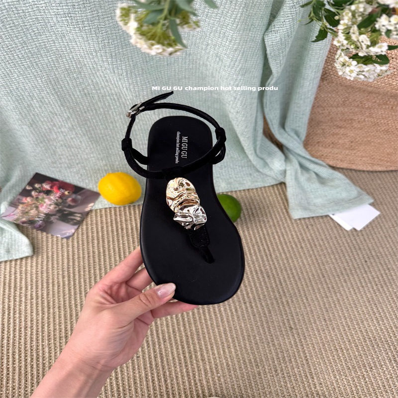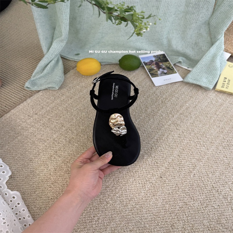프랑스 스타일 디자인 금속 버클 통 플랫 샌들 여성 여름 휴가 스타일 스커트 샌들 2025 플립 플롭