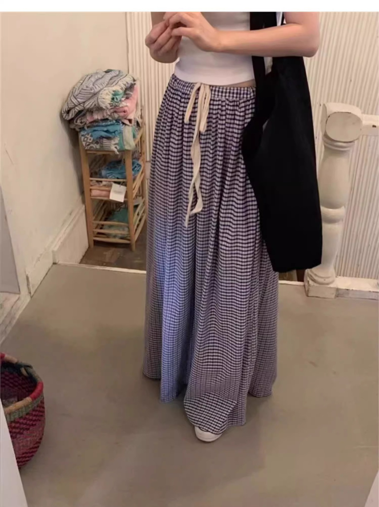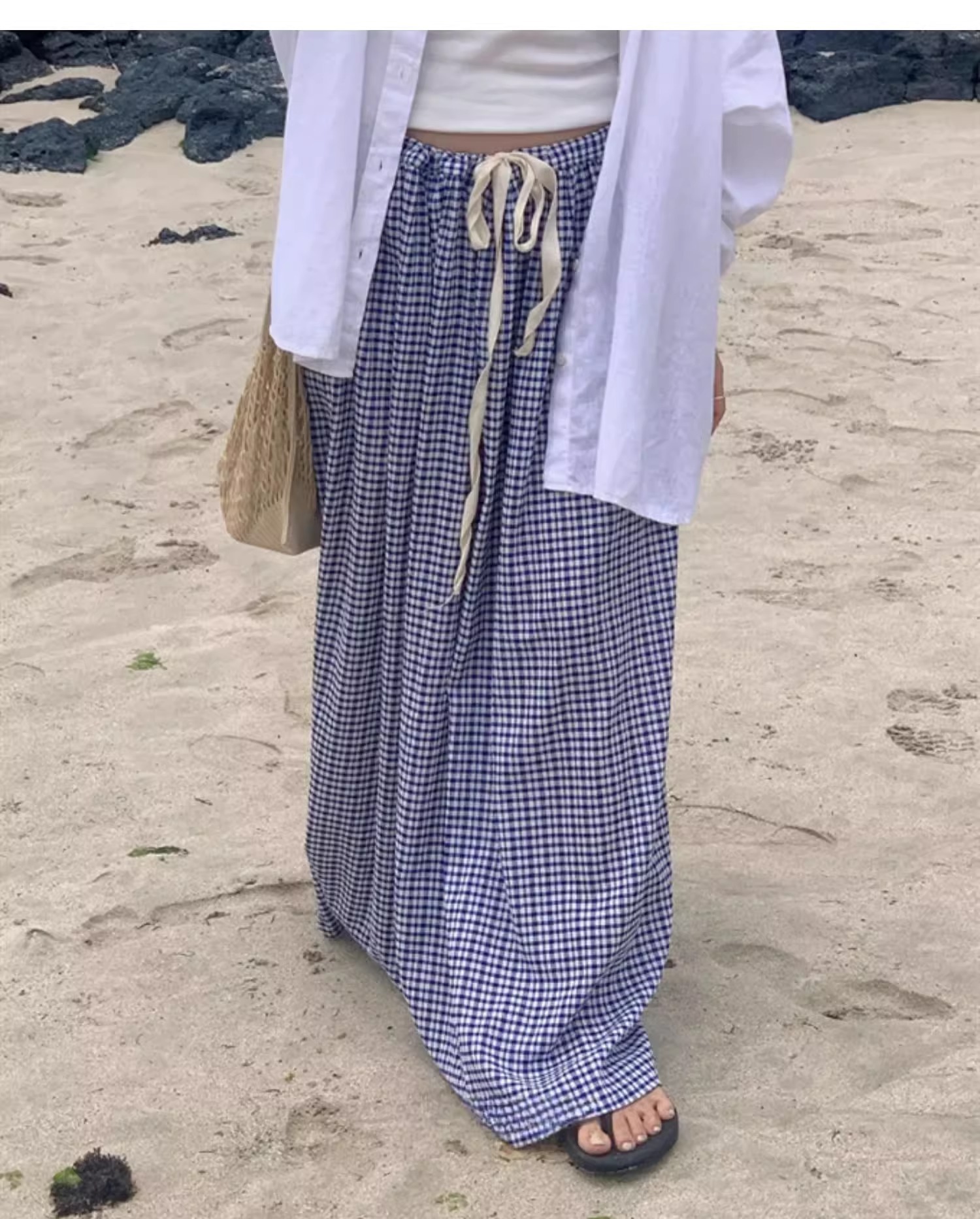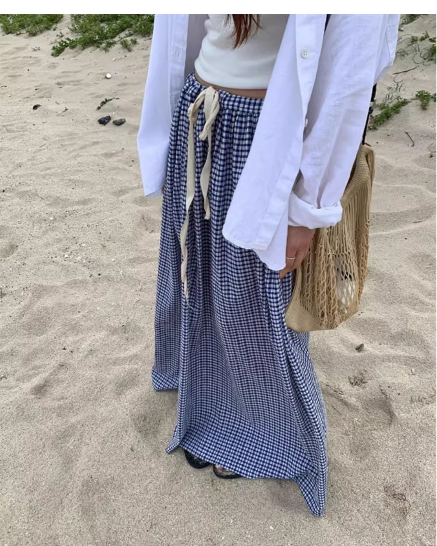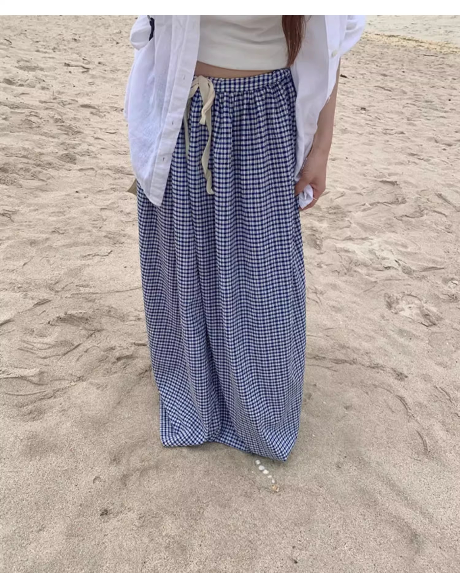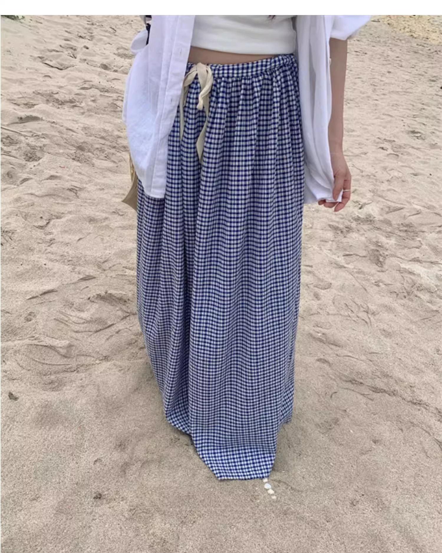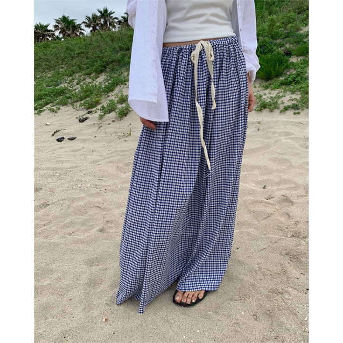 여름 여성용 체크 무늬 드로스트링 스커트 프렌치 니치 하이웨이스트 드레이프 루즈 슬리밍 바닥 길이 A라인 스커트 인 트렌드스토어 가기