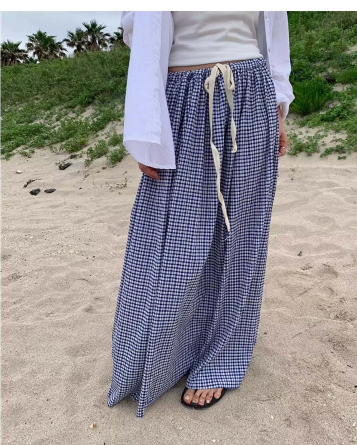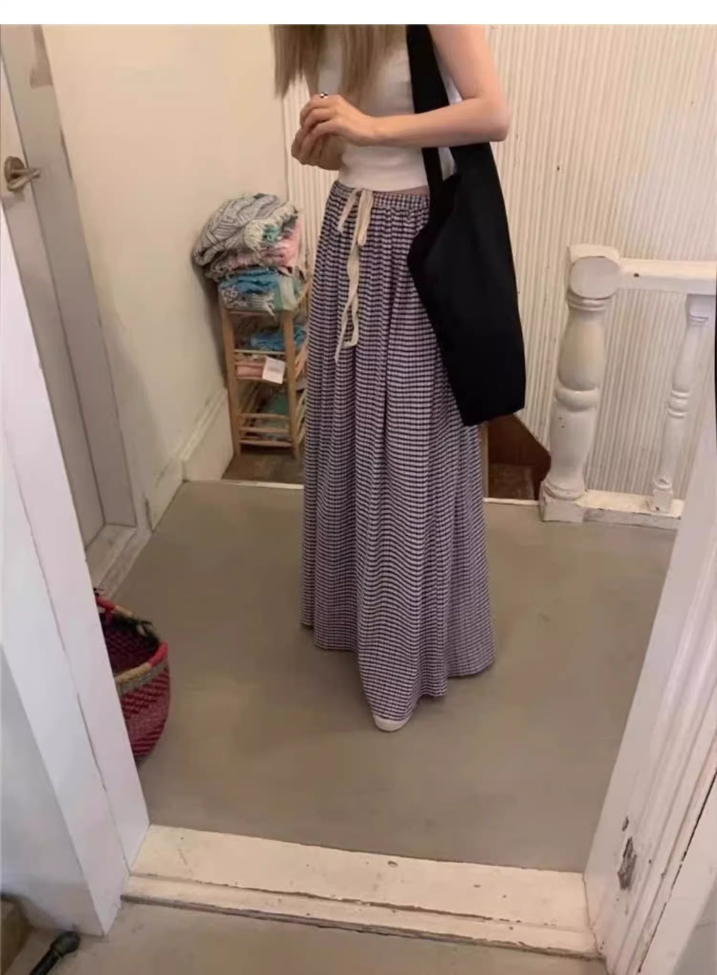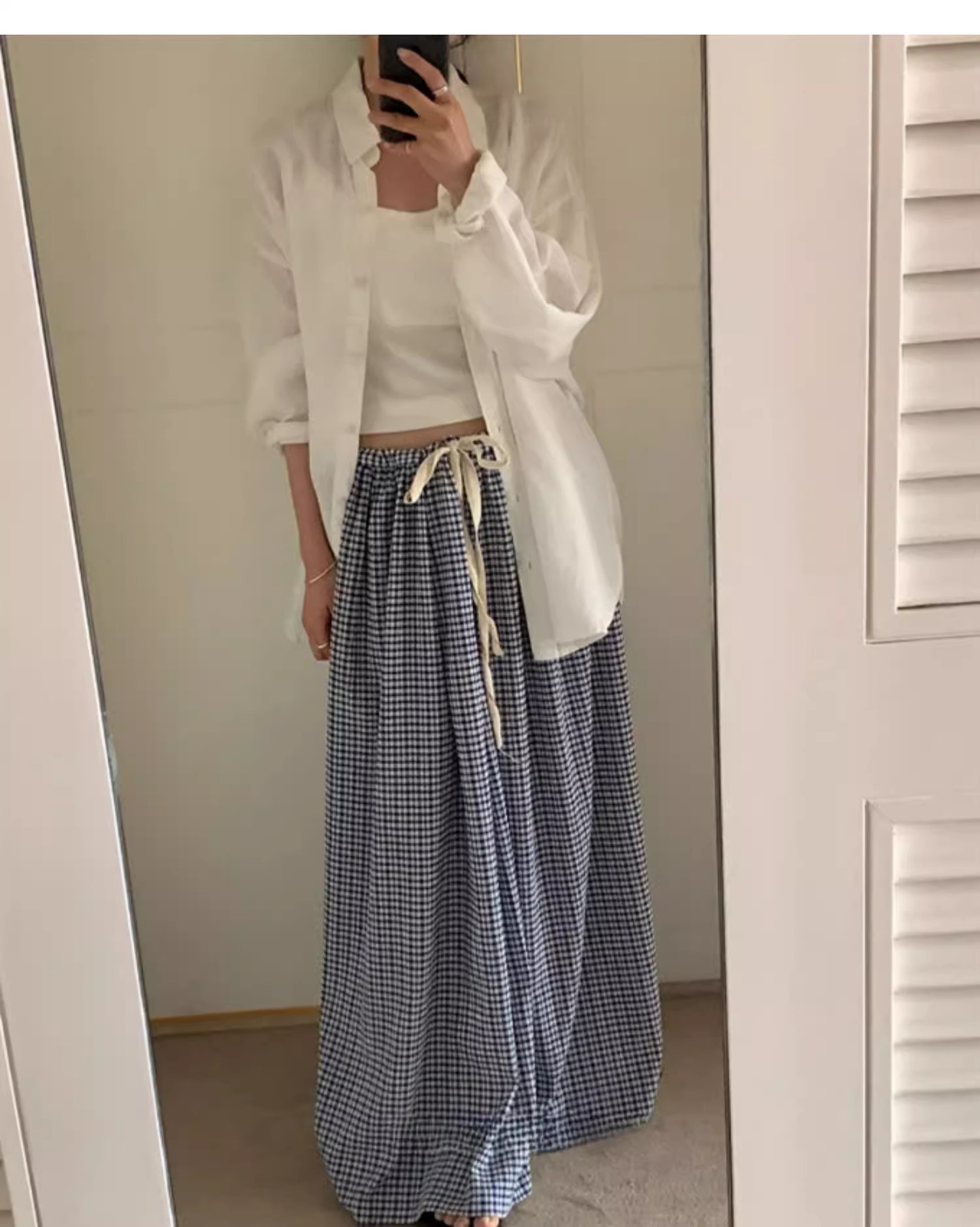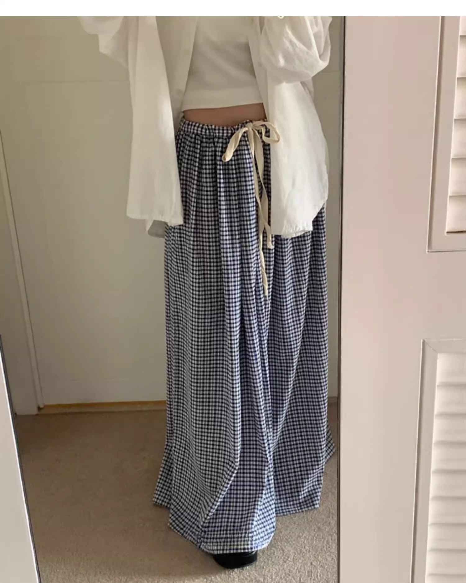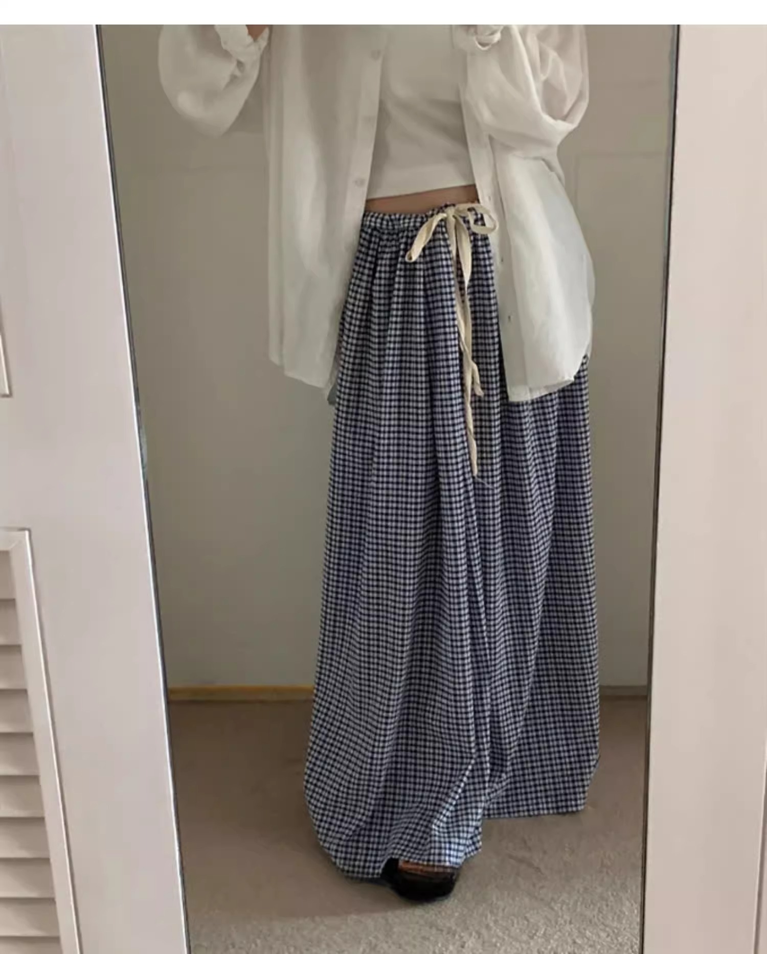 여름 여성용 체크 무늬 드로스트링 스커트 프렌치 니치 하이웨이스트 드레이프 루즈 슬리밍 바닥 길이 A라인 스커트 인 트렌드스토어 가기