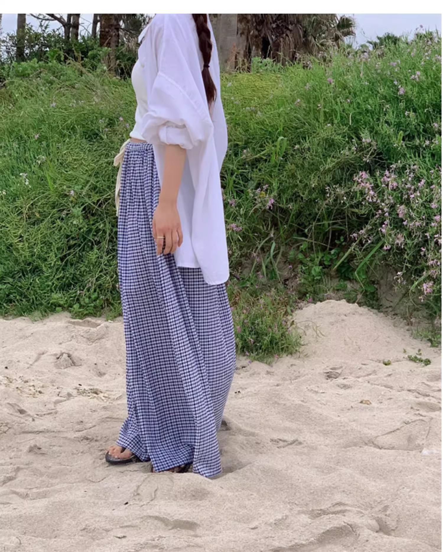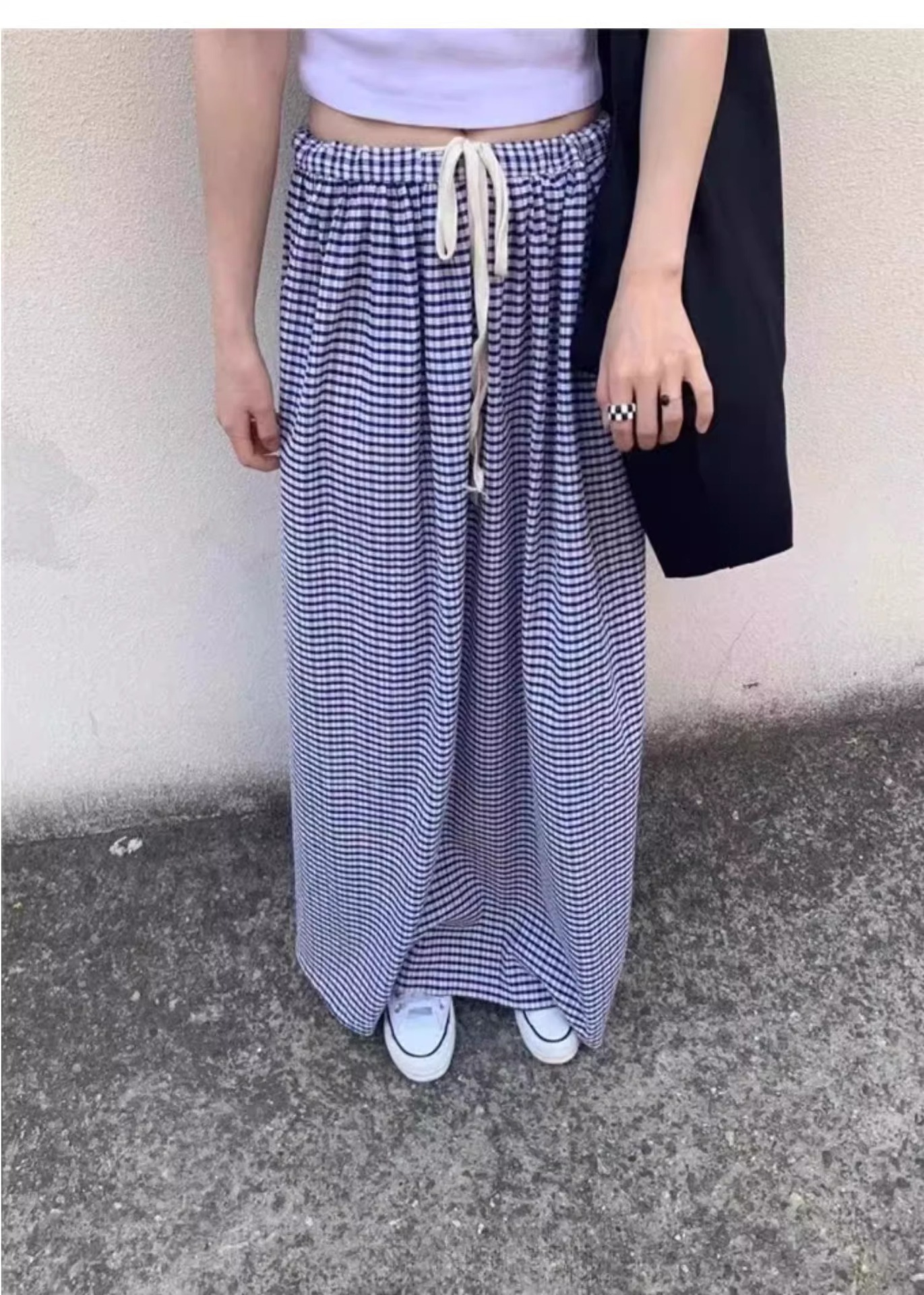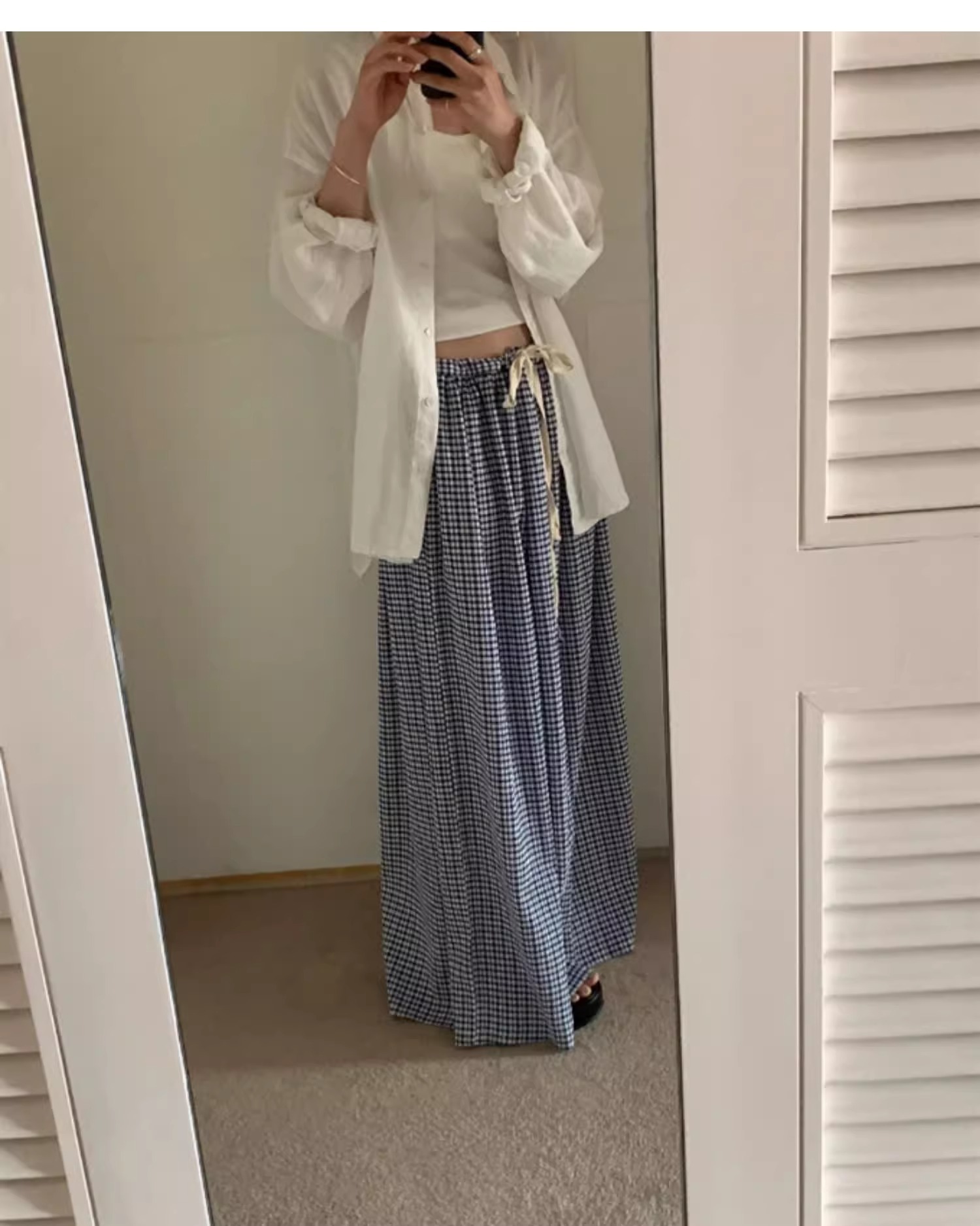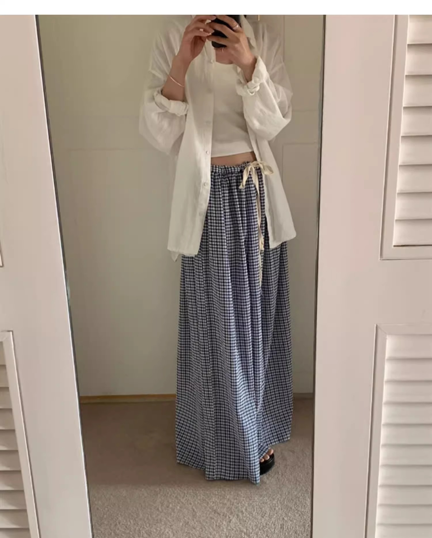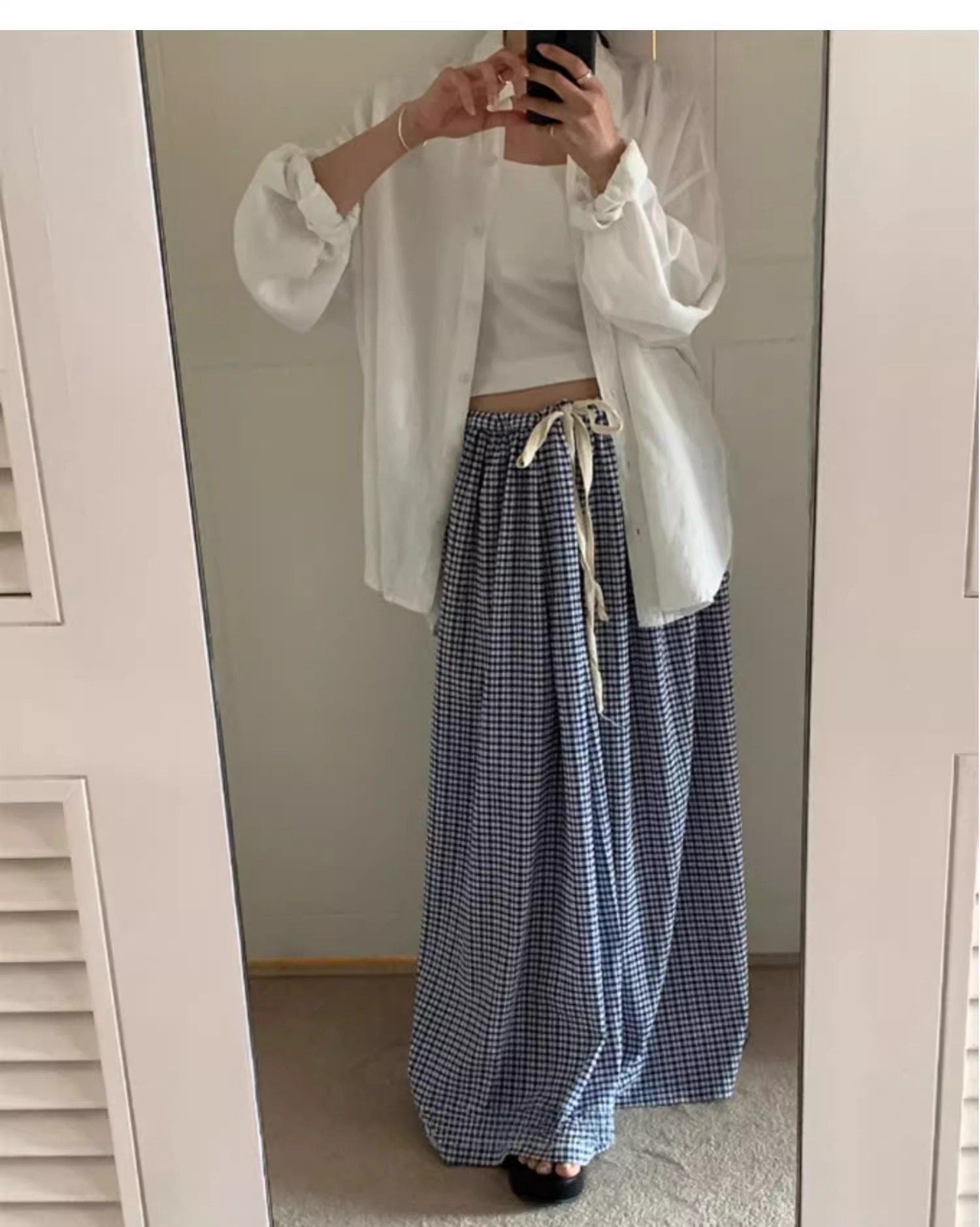 여름 여성용 체크 무늬 드로스트링 스커트 프렌치 니치 하이웨이스트 드레이프 루즈 슬리밍 바닥 길이 A라인 스커트 인 트렌드스토어 가기