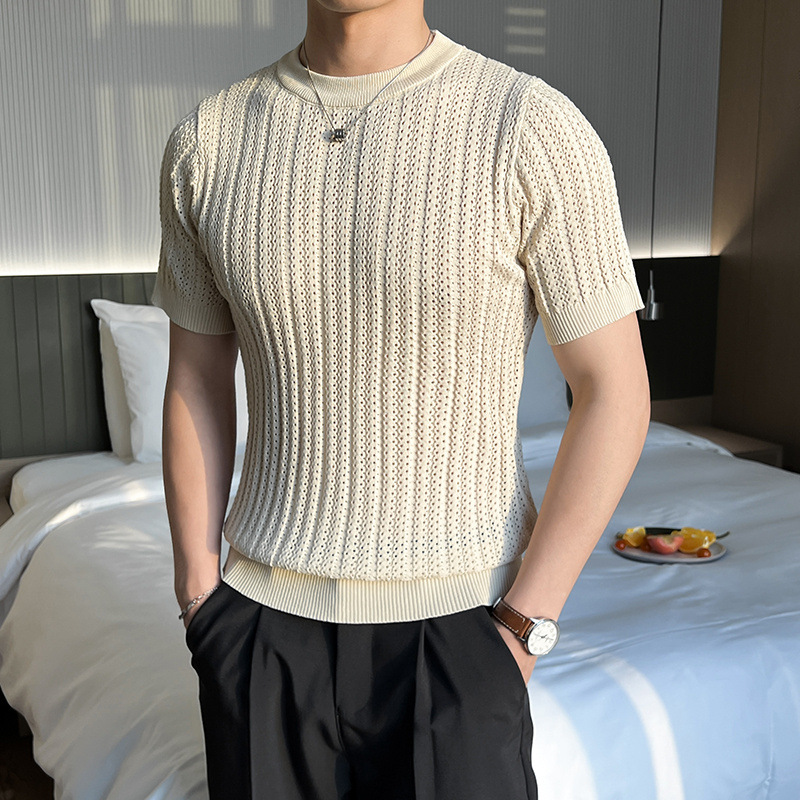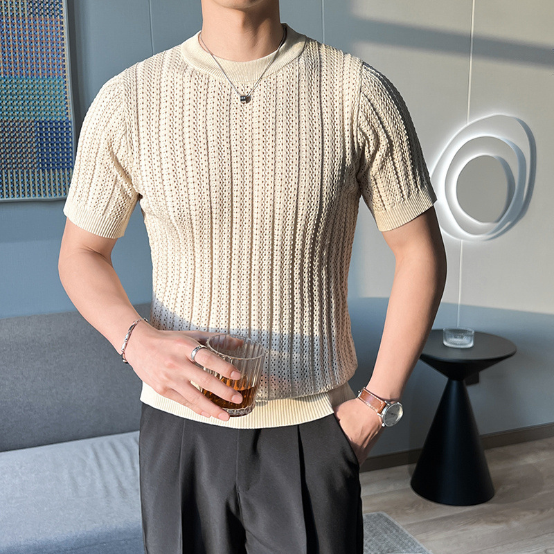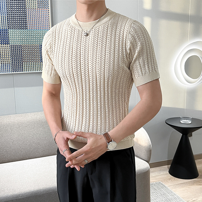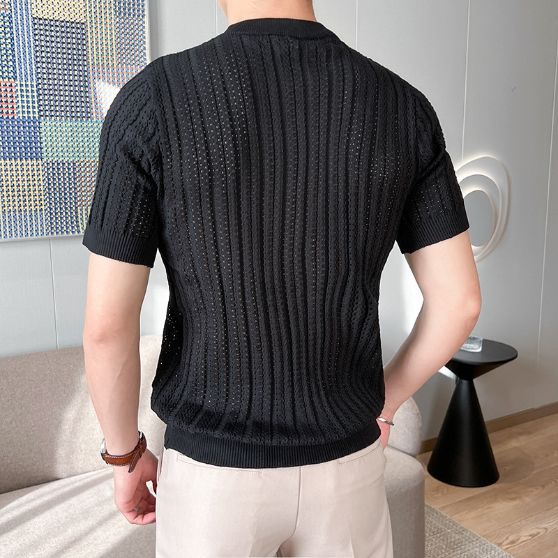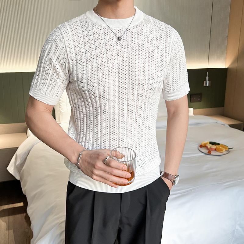 가벼운 성숙한 얼음 쿨 실크 니트웨어 유행 남성 디자인 작은 높은 목 짧은 소매 쿨 얇은 통기성 슬림 핏 중간 목 티셔츠