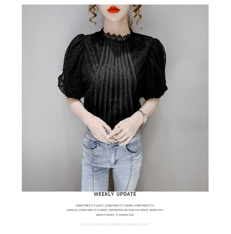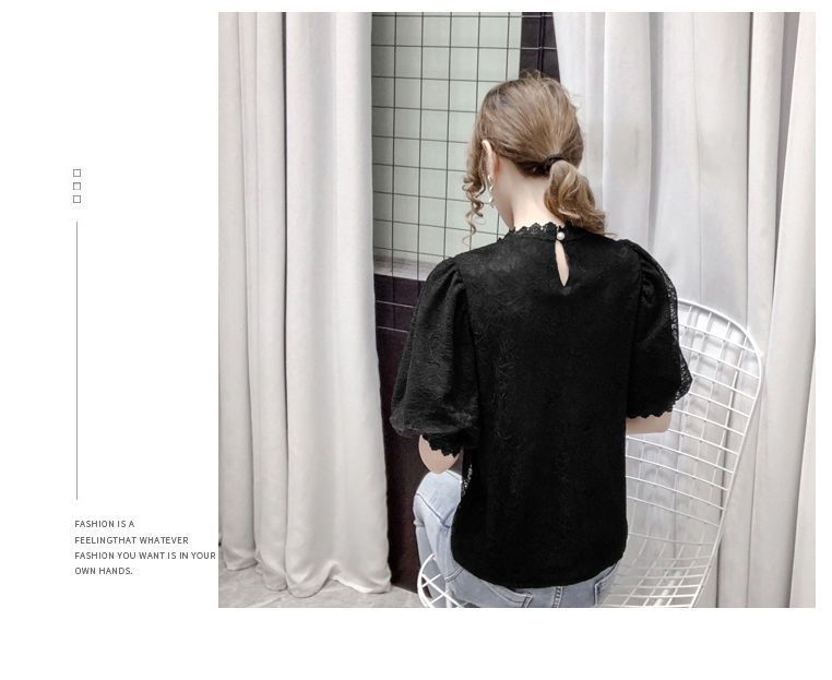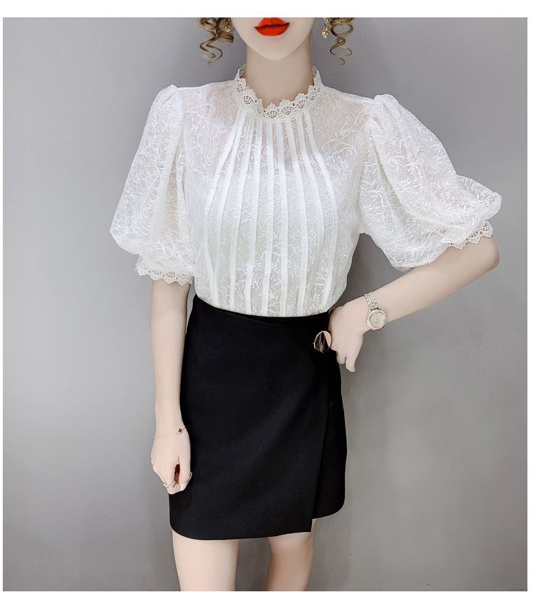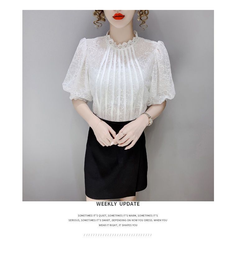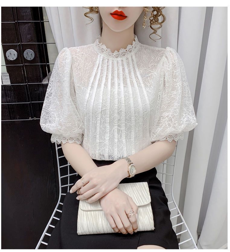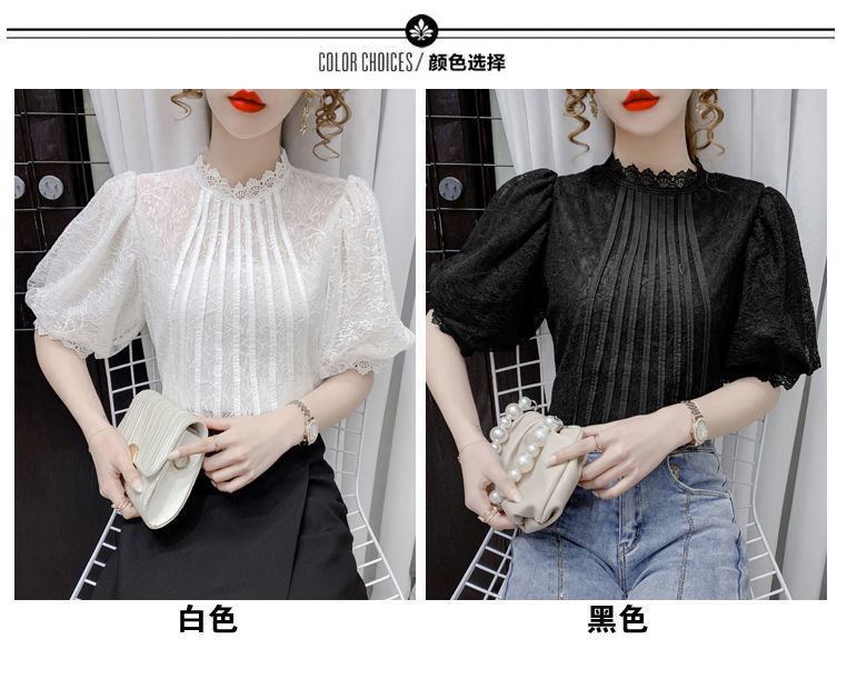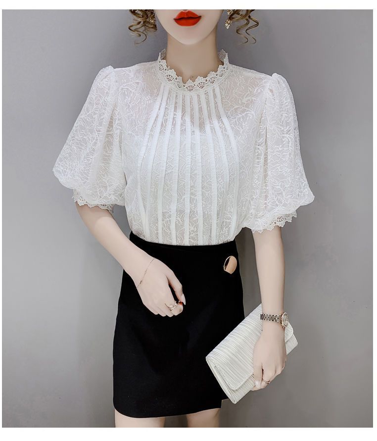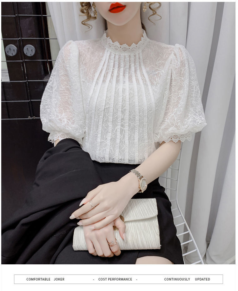 화이트 여성 탑 2025 여름 새 스타일 버블 반팔 쉬폰 셔츠 얇은 셔츠 여성을위한 세련된 레이스 셔츠