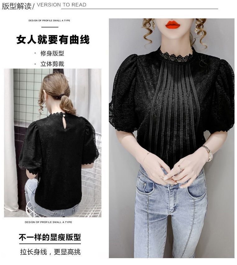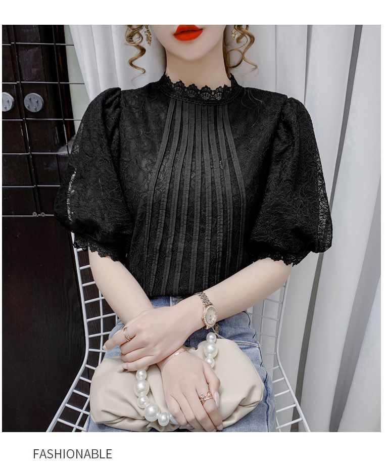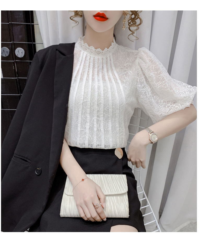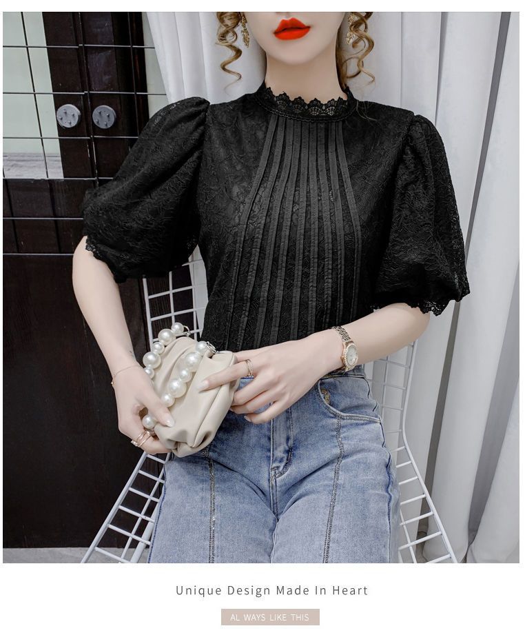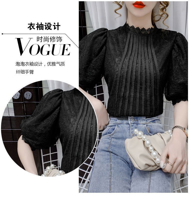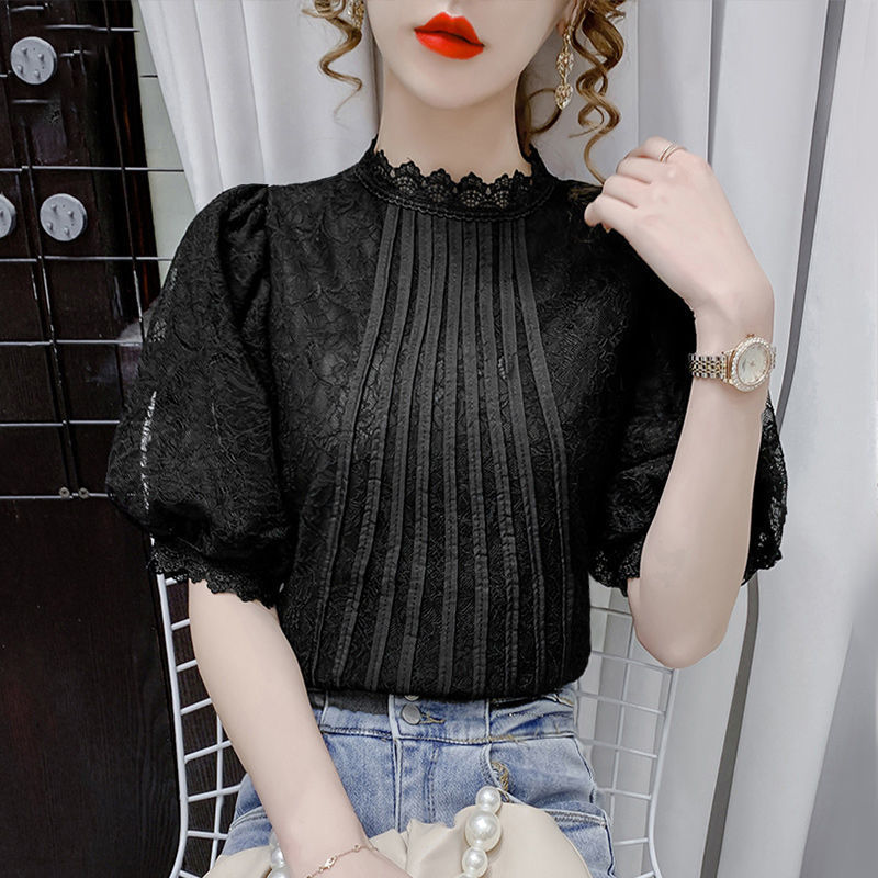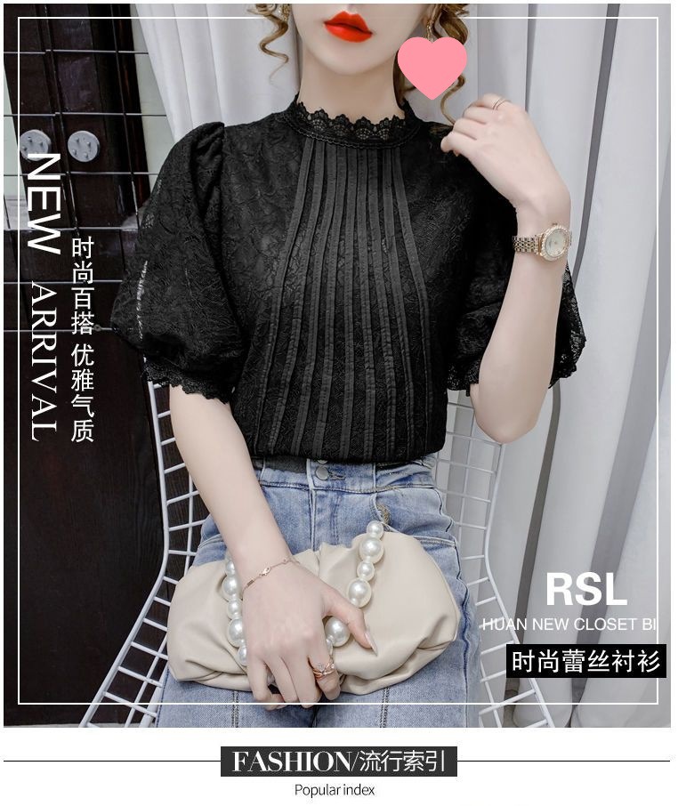 화이트 여성 탑 2025 여름 새 스타일 버블 반팔 쉬폰 셔츠 얇은 셔츠 여성을위한 세련된 레이스 셔츠