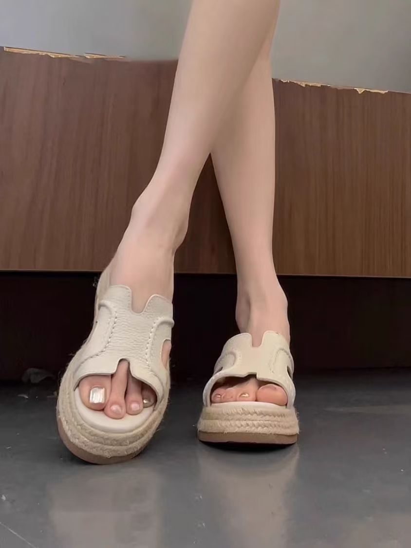 밀짚 플랫폼 신발, 두꺼운 밑창 하이힐 샌들, 여성 여름 아우터 슬리퍼