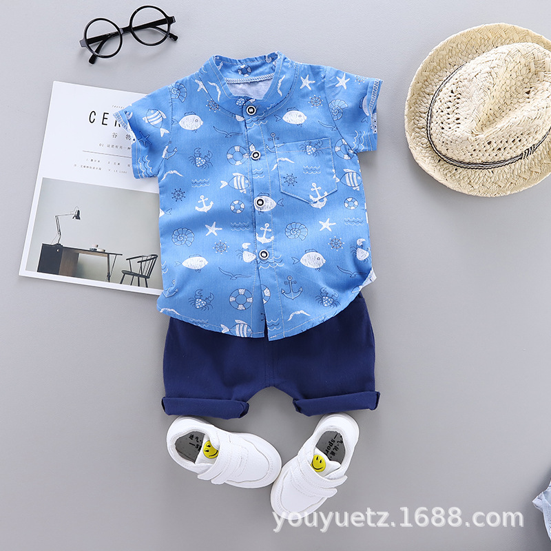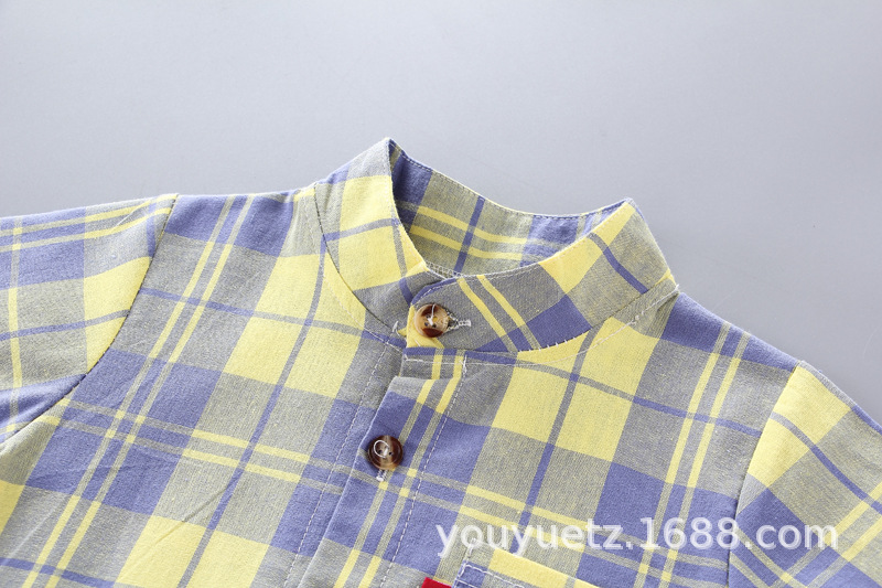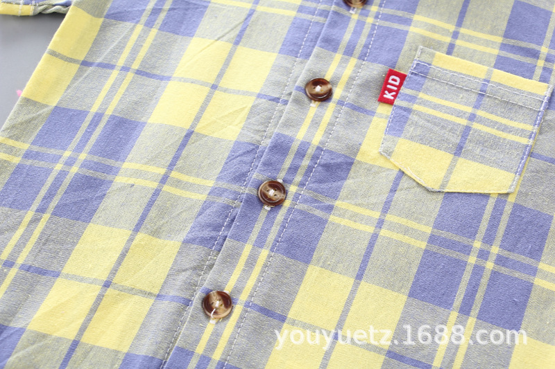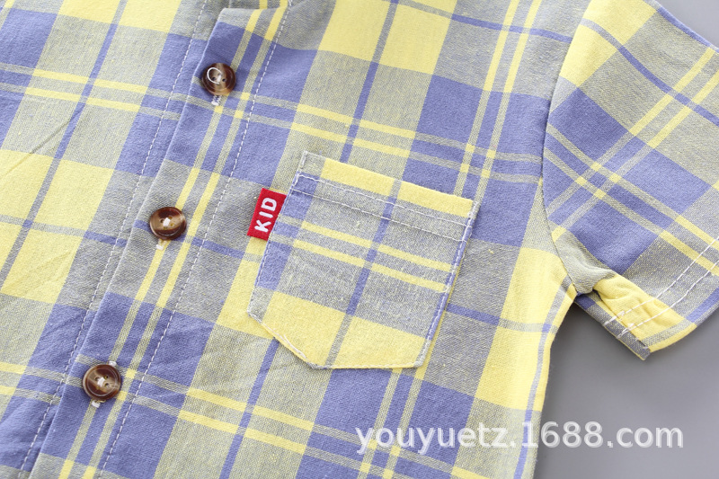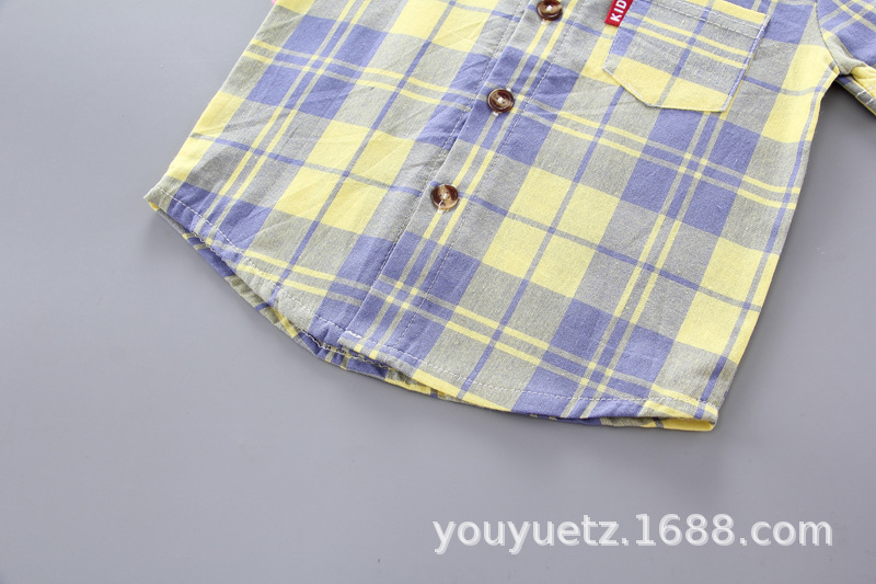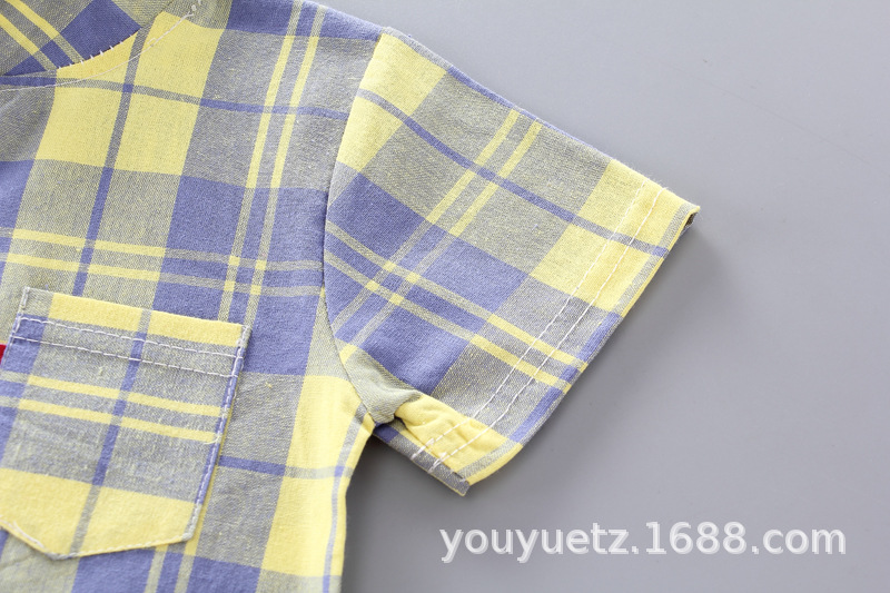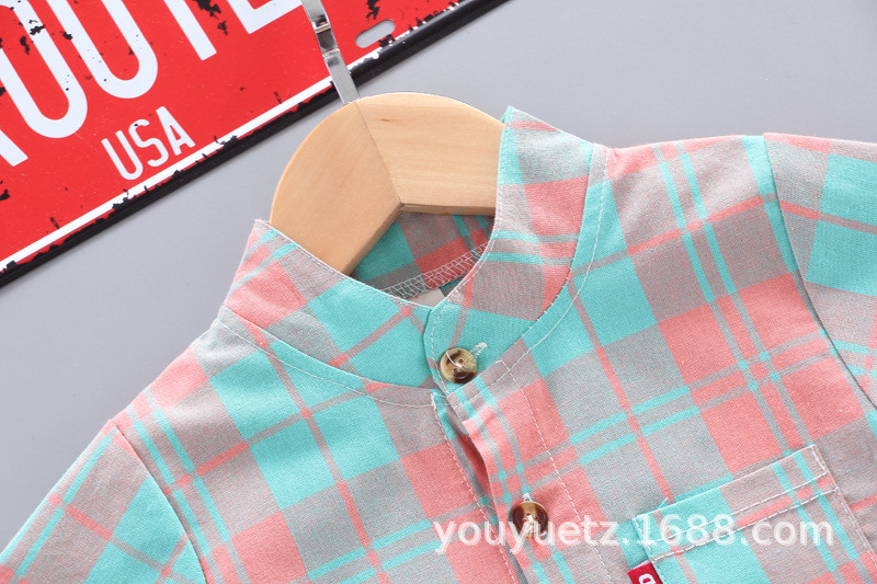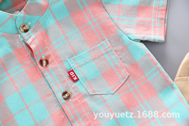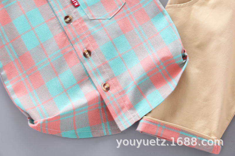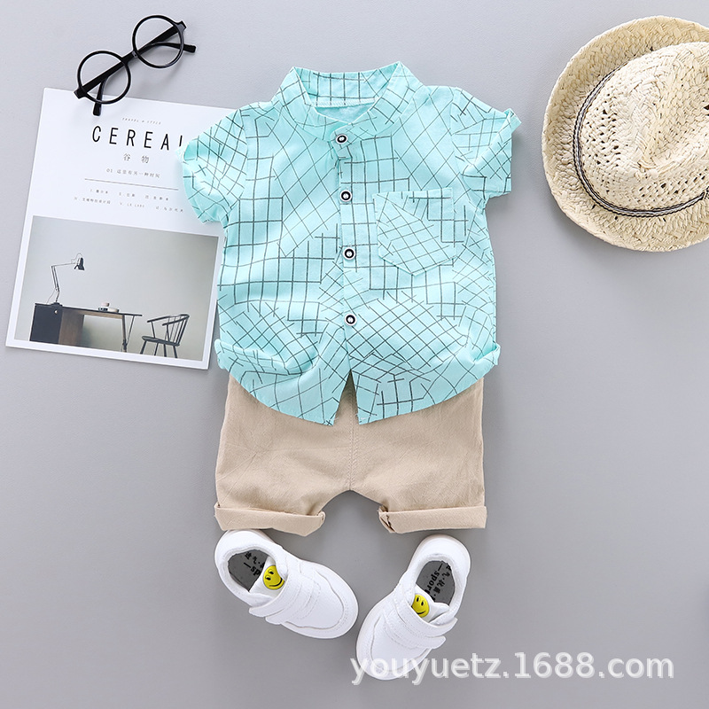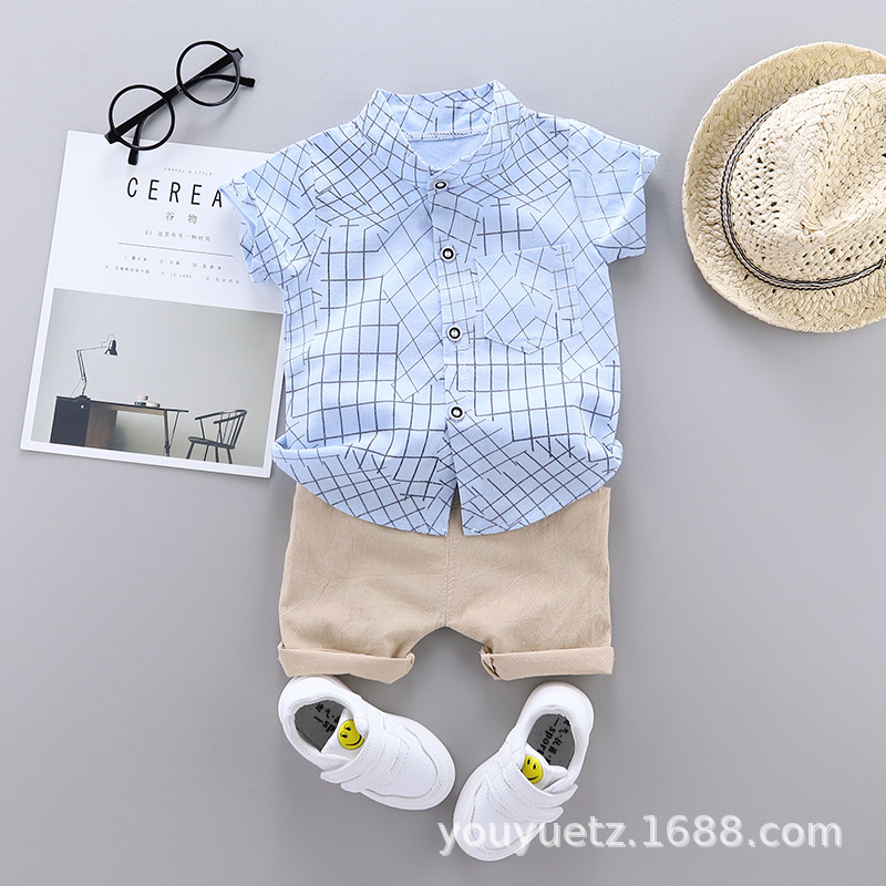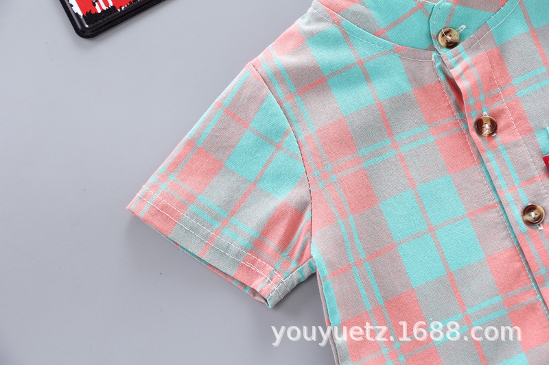 대외 무역 아동복 여름 세트 패션 소년 소녀를위한 캐주얼 한국식 격자 무늬 칼라 셔츠 반팔 투피스 유행 세트스토어 가기