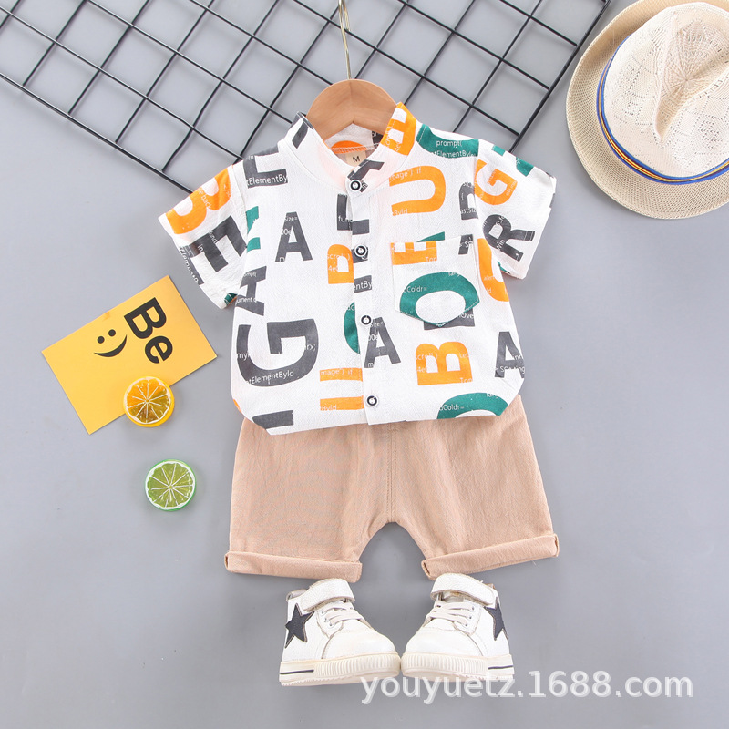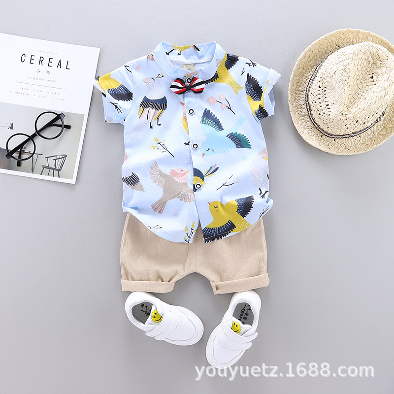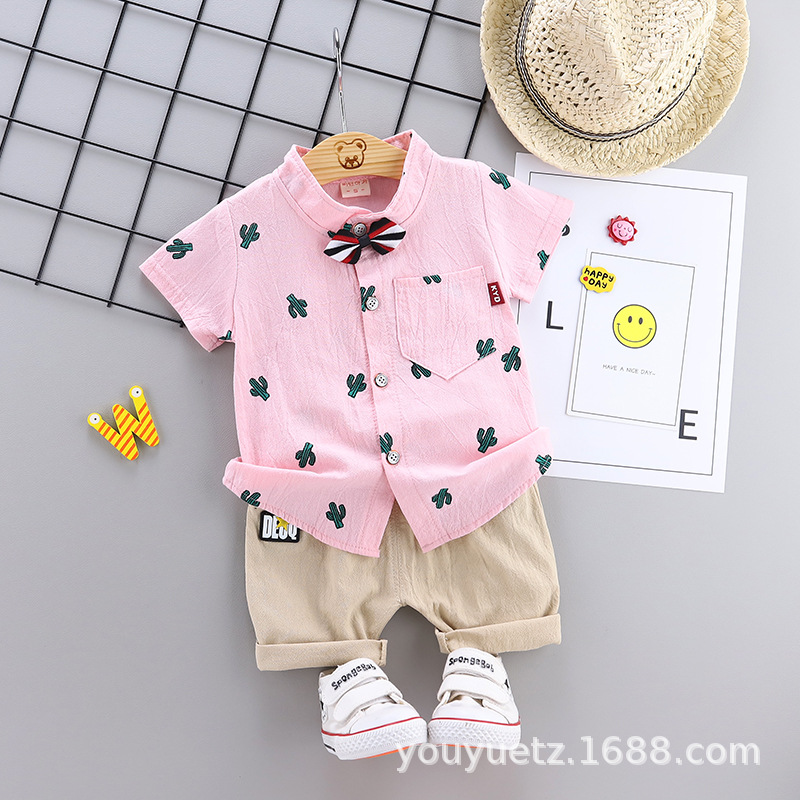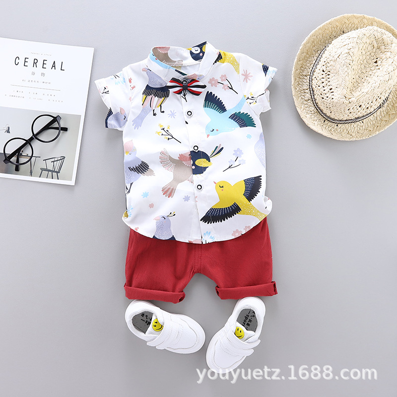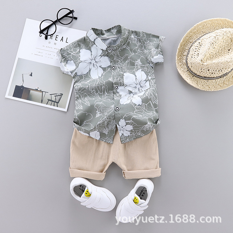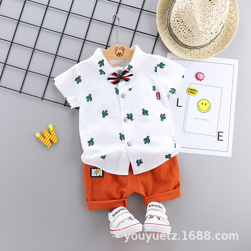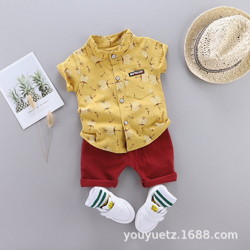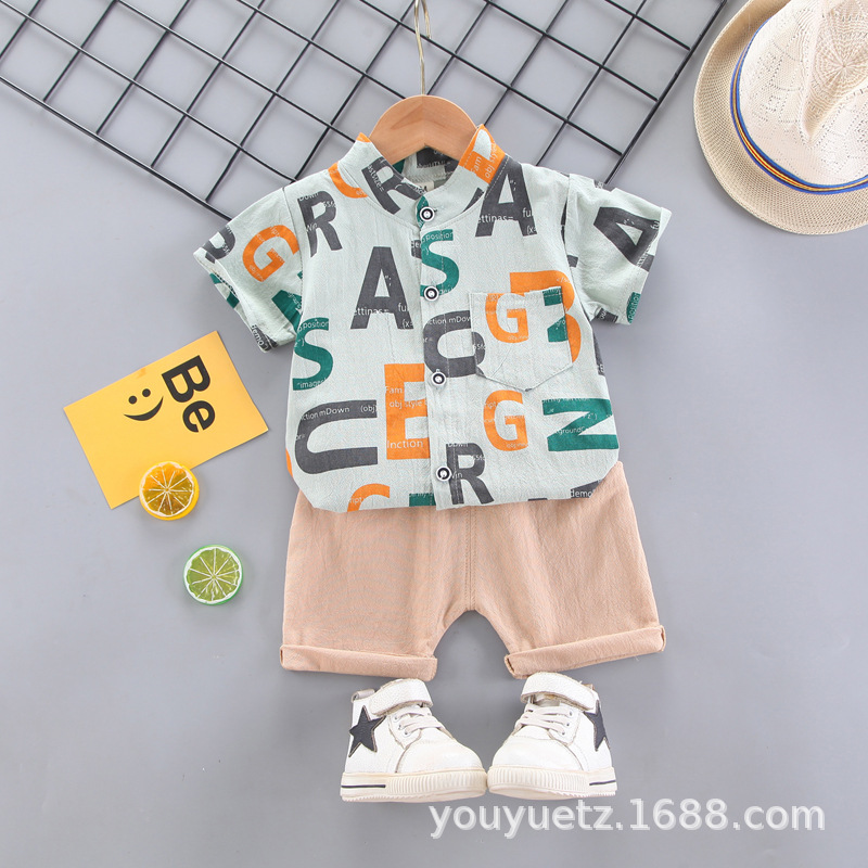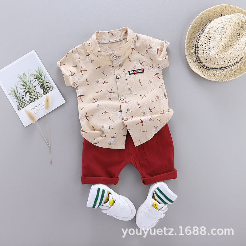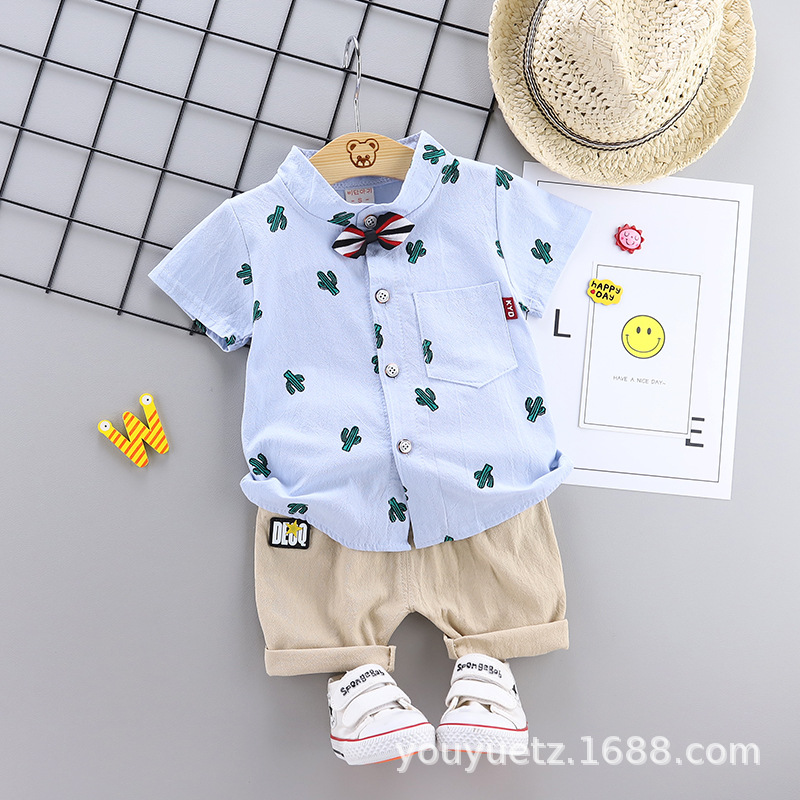 대외 무역 아동복 여름 세트 패션 소년 소녀를위한 캐주얼 한국식 격자 무늬 칼라 셔츠 반팔 투피스 유행 세트스토어 가기