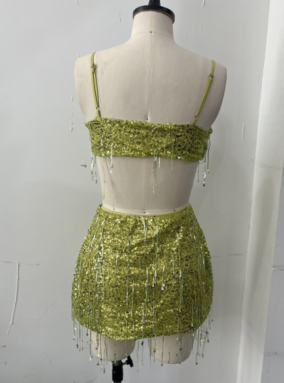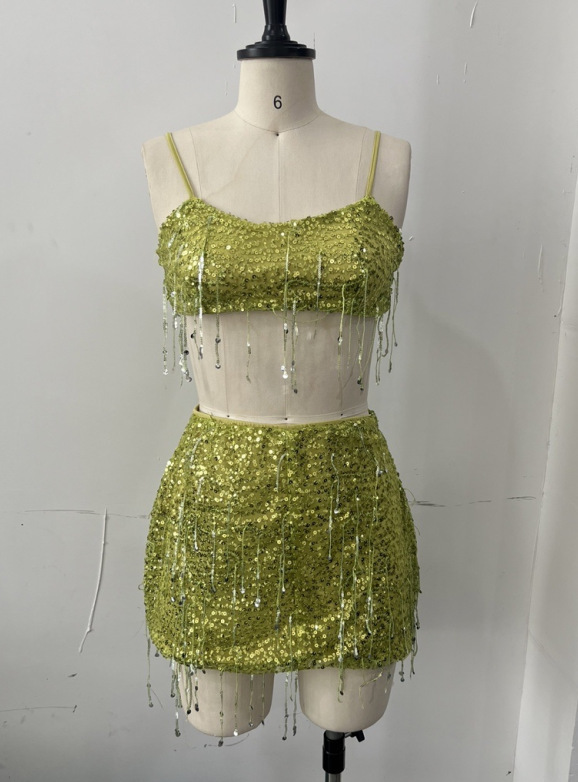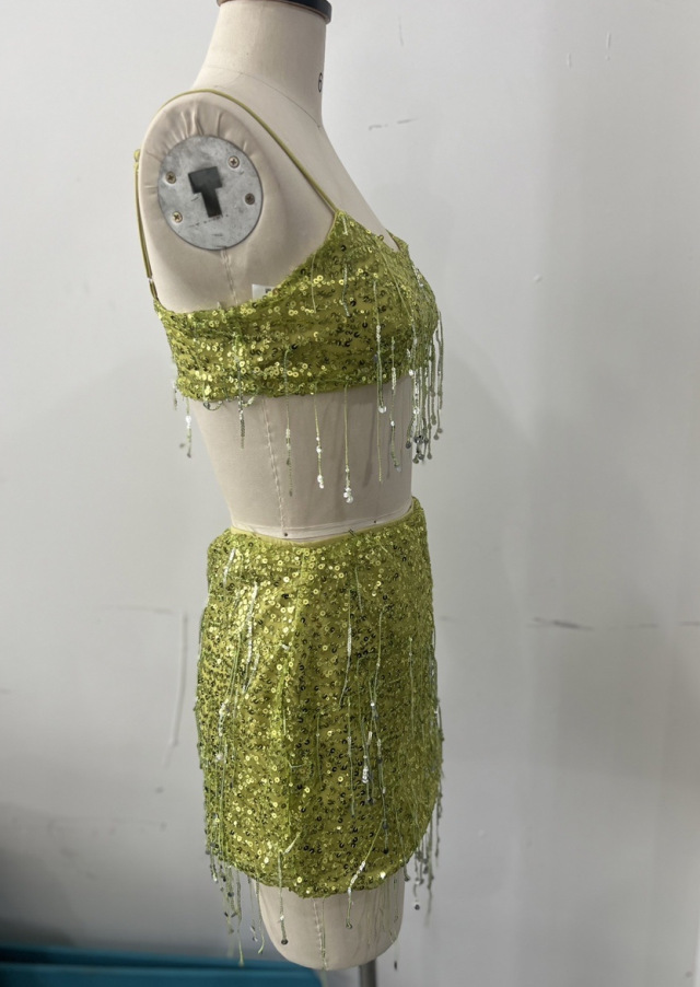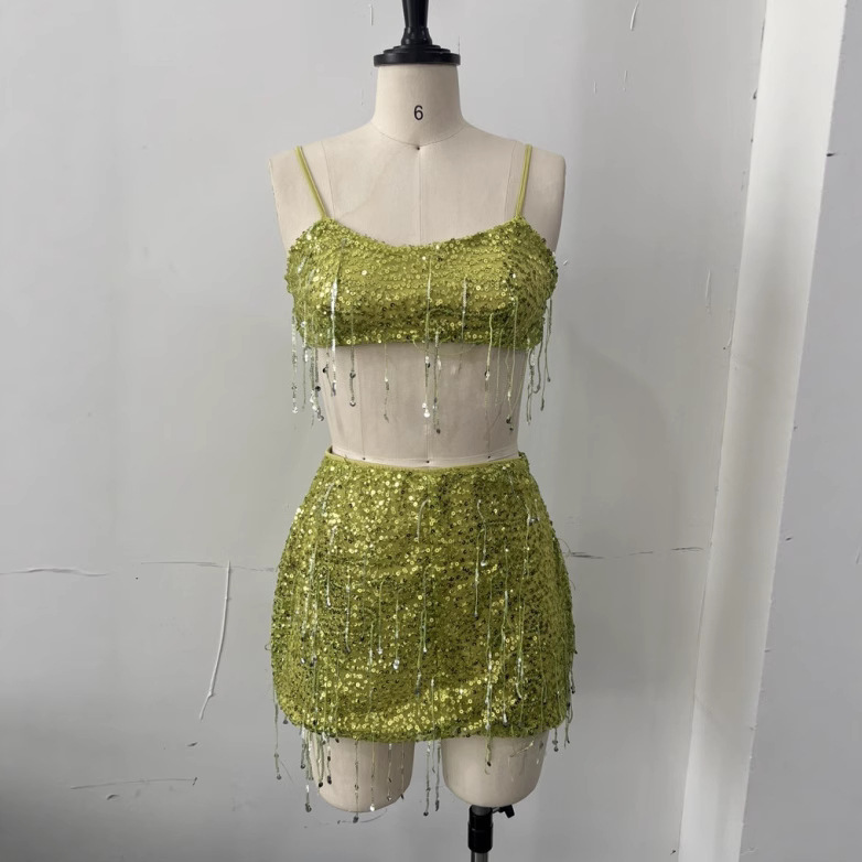 유럽과 미국의 국경 간 2025 새로운 여름 여성 의류 섹시한 프린지 스팽글 서스펜더 탑 스커트 정장 댄스 스커트 여성