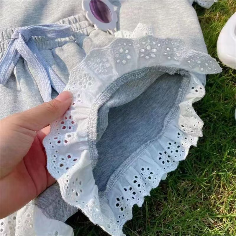 여자 여름 세트 아기 한국 스타일 캐주얼 레이스 반팔 티셔츠 어린이 반바지 투피스 서양식 세트