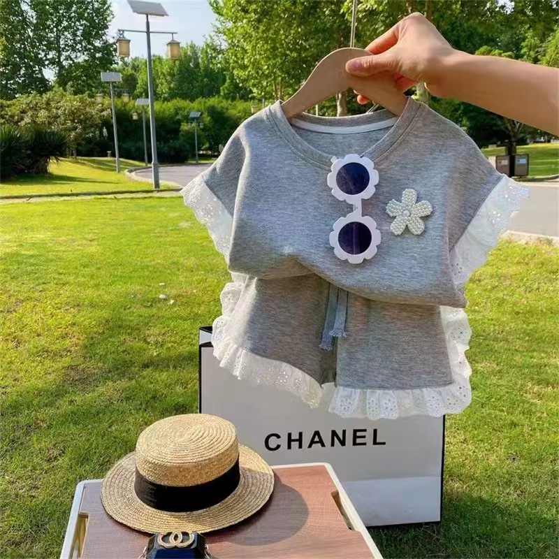 여자 여름 세트 아기 한국 스타일 캐주얼 레이스 반팔 티셔츠 어린이 반바지 투피스 서양식 세트스토어 가기