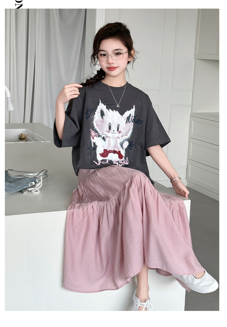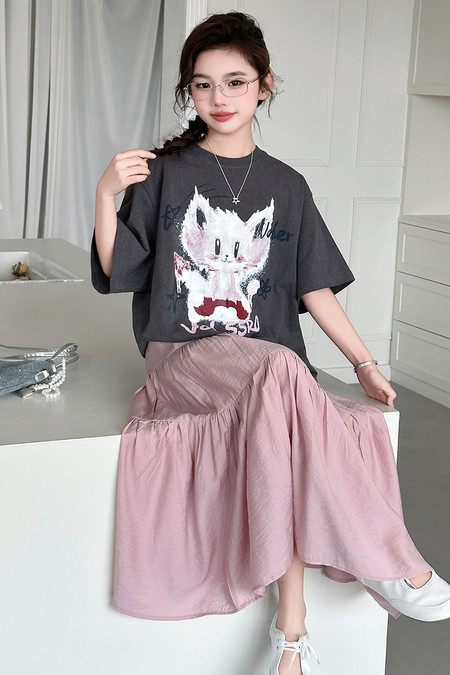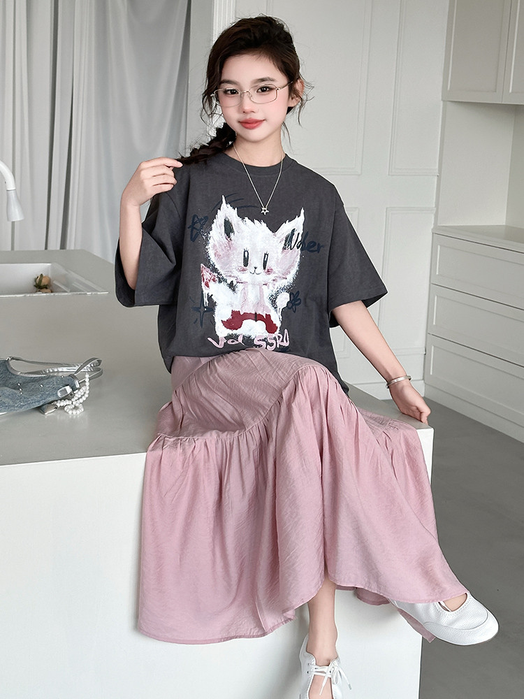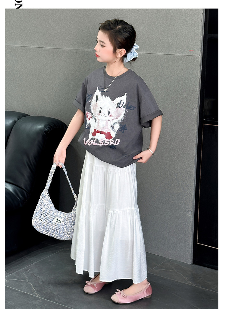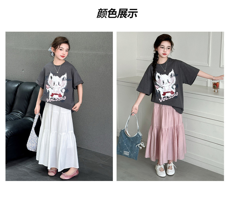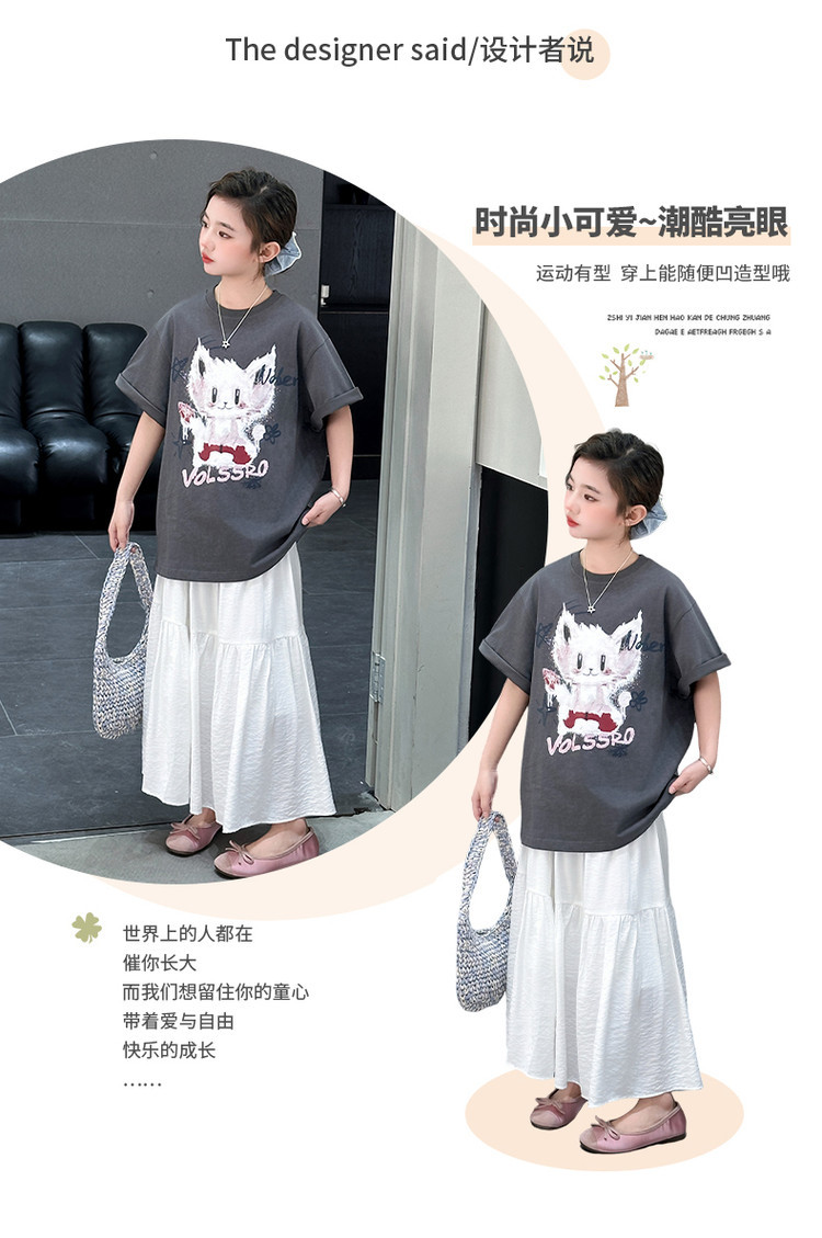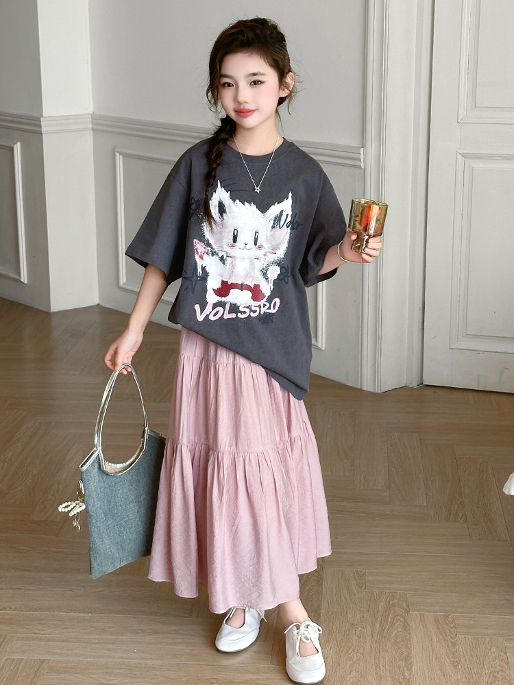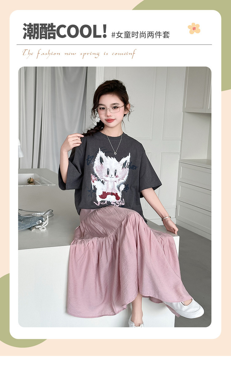 소녀 2025 새로운 여름 치마 세트 서양식 캐주얼 큰 어린이 만화 티셔츠 투피스 세트