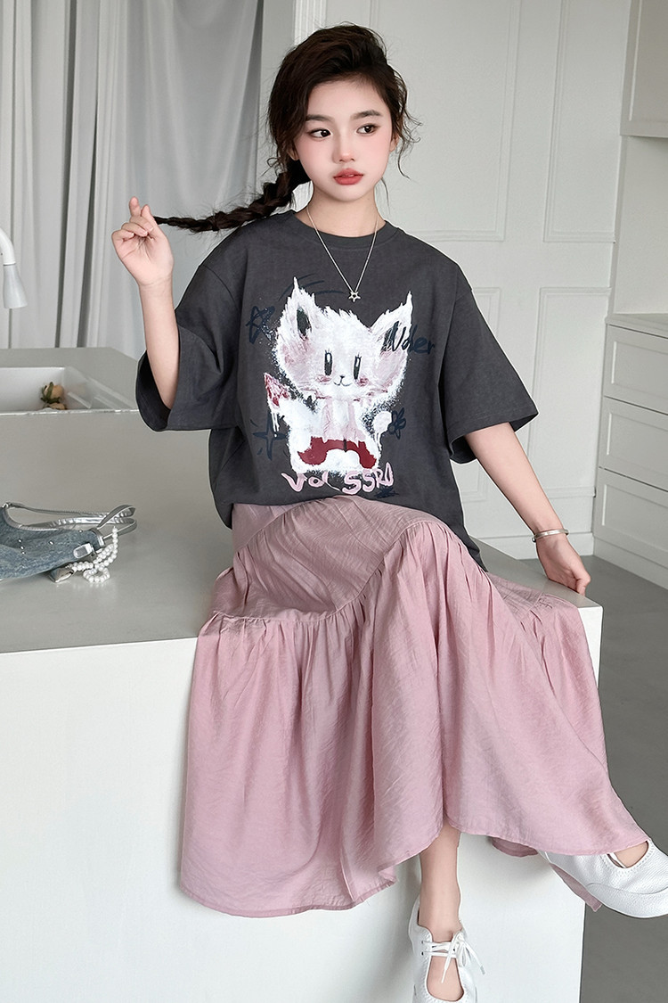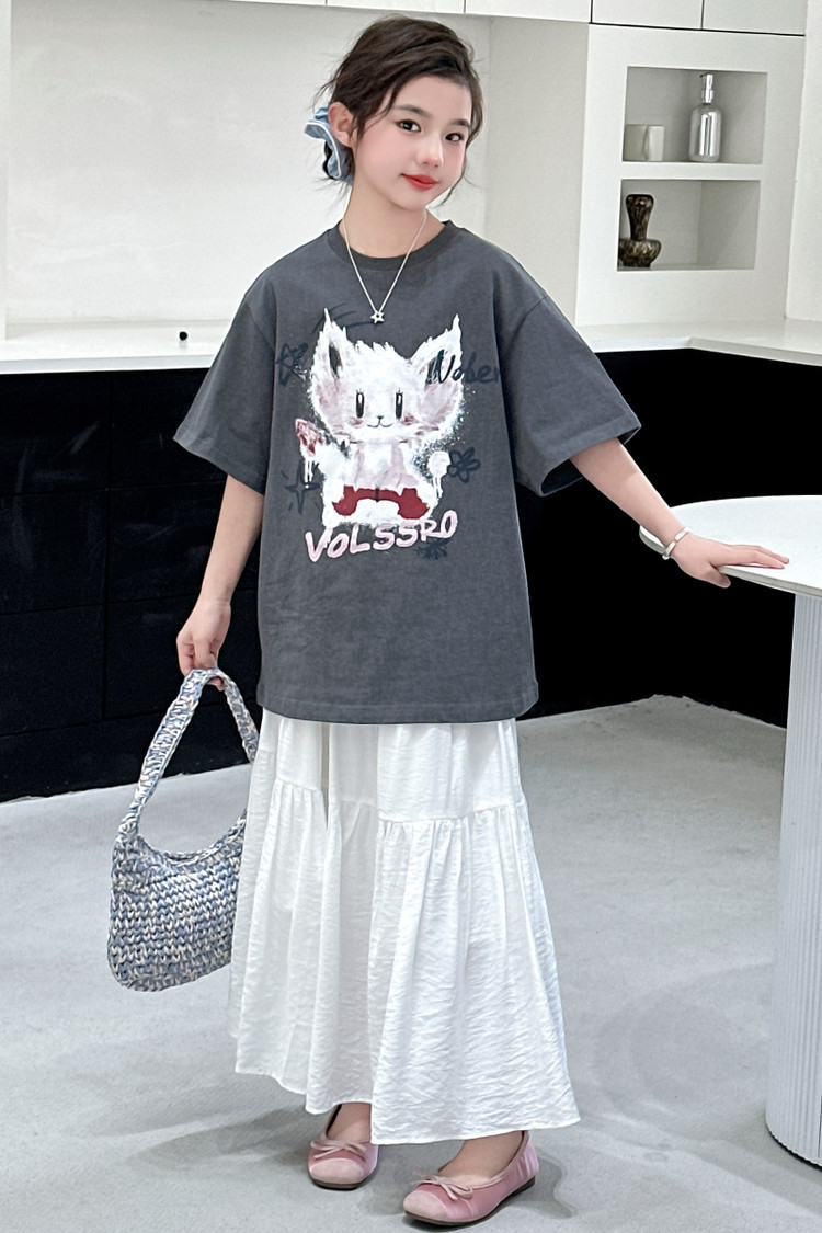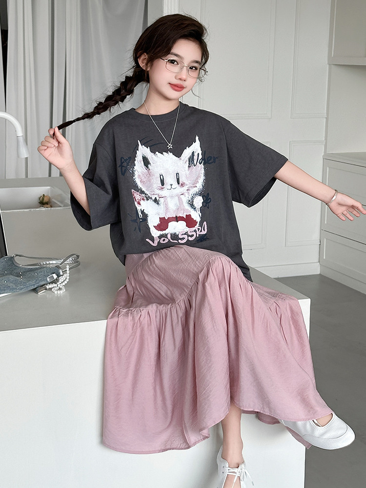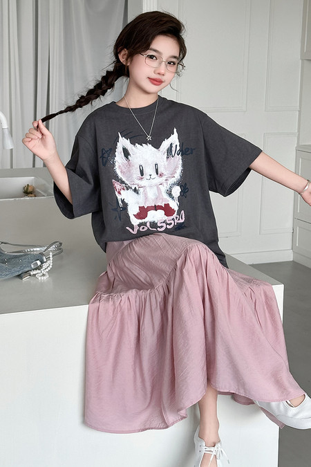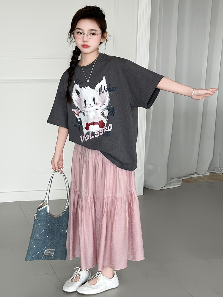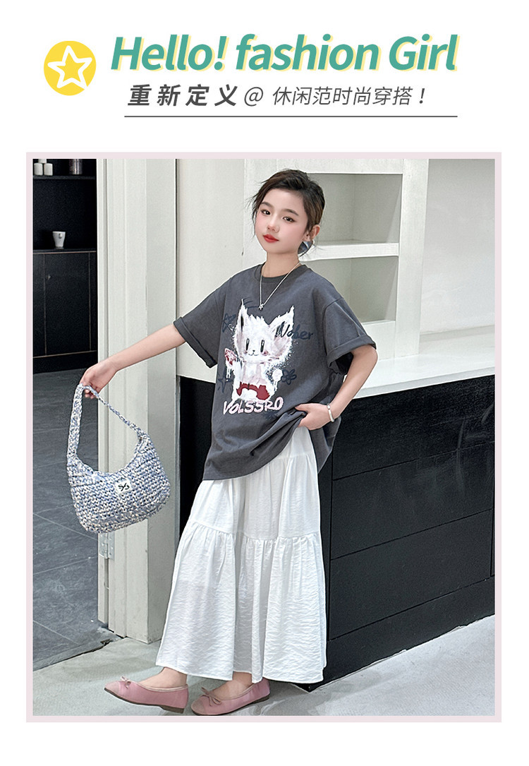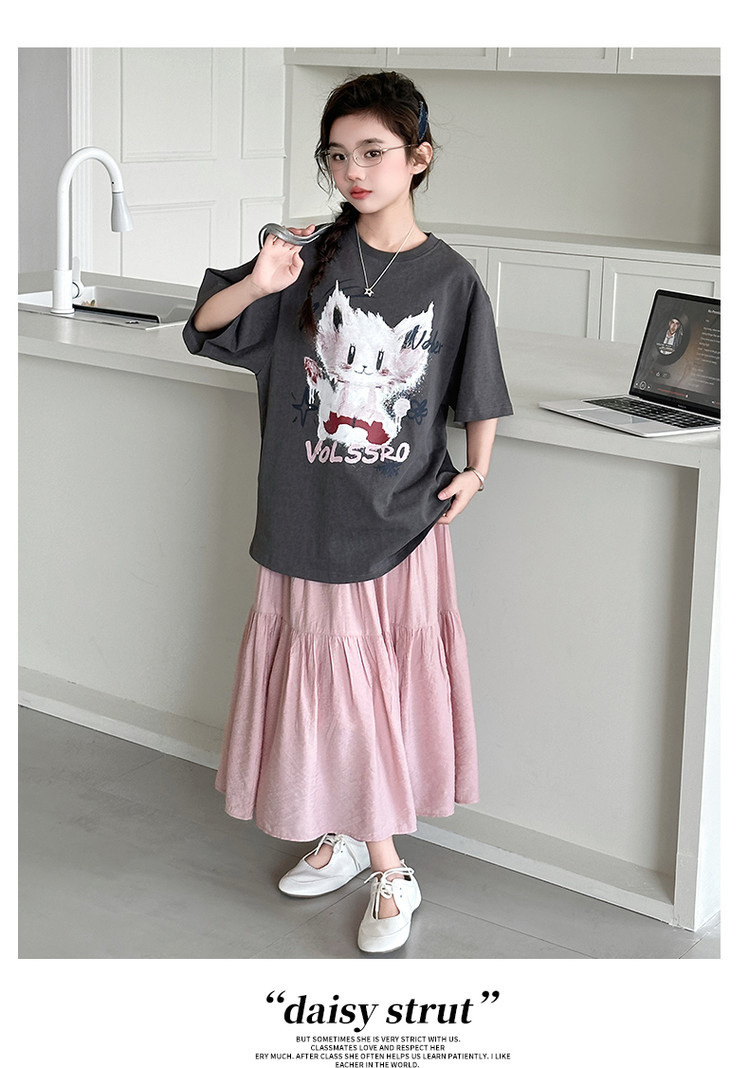 소녀 2025 새로운 여름 치마 세트 서양식 캐주얼 큰 어린이 만화 티셔츠 투피스 세트