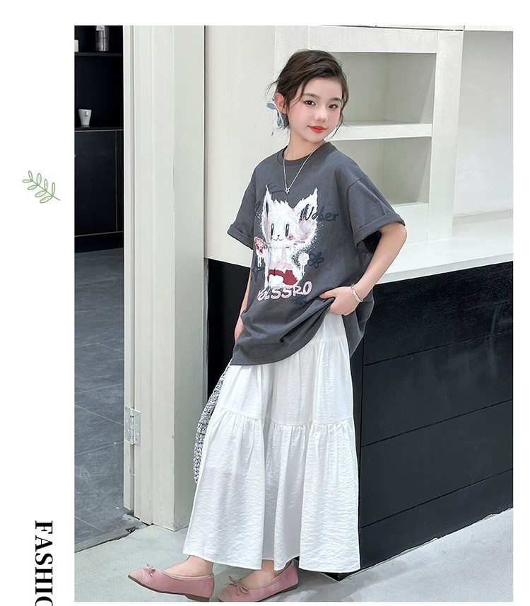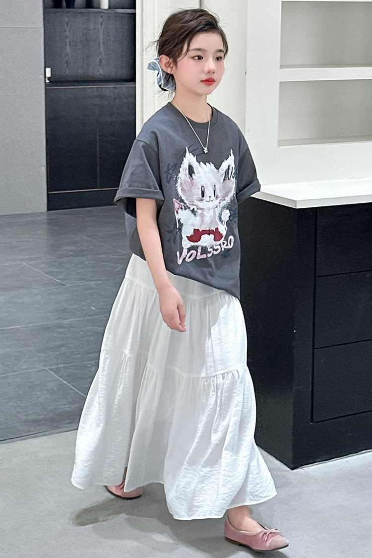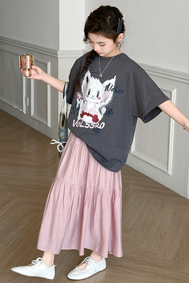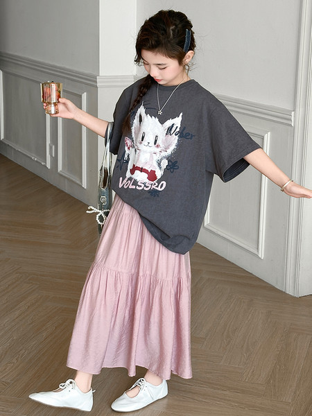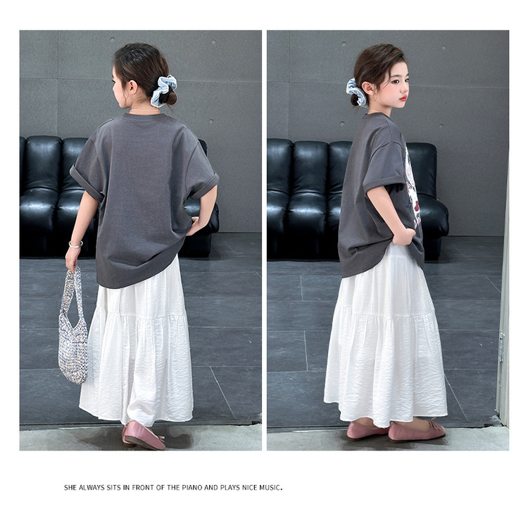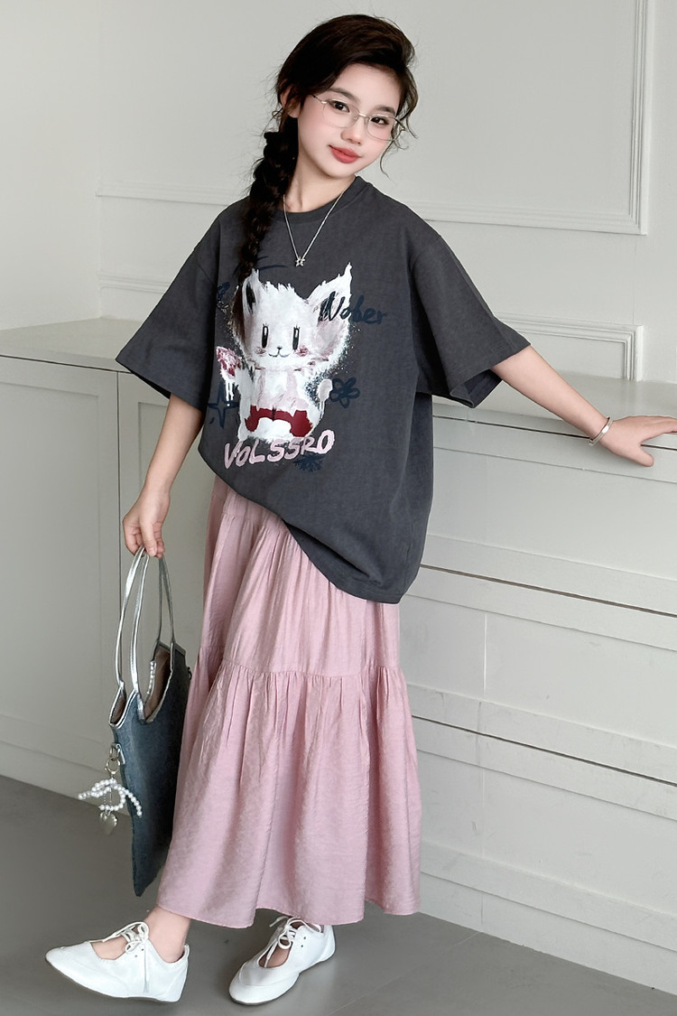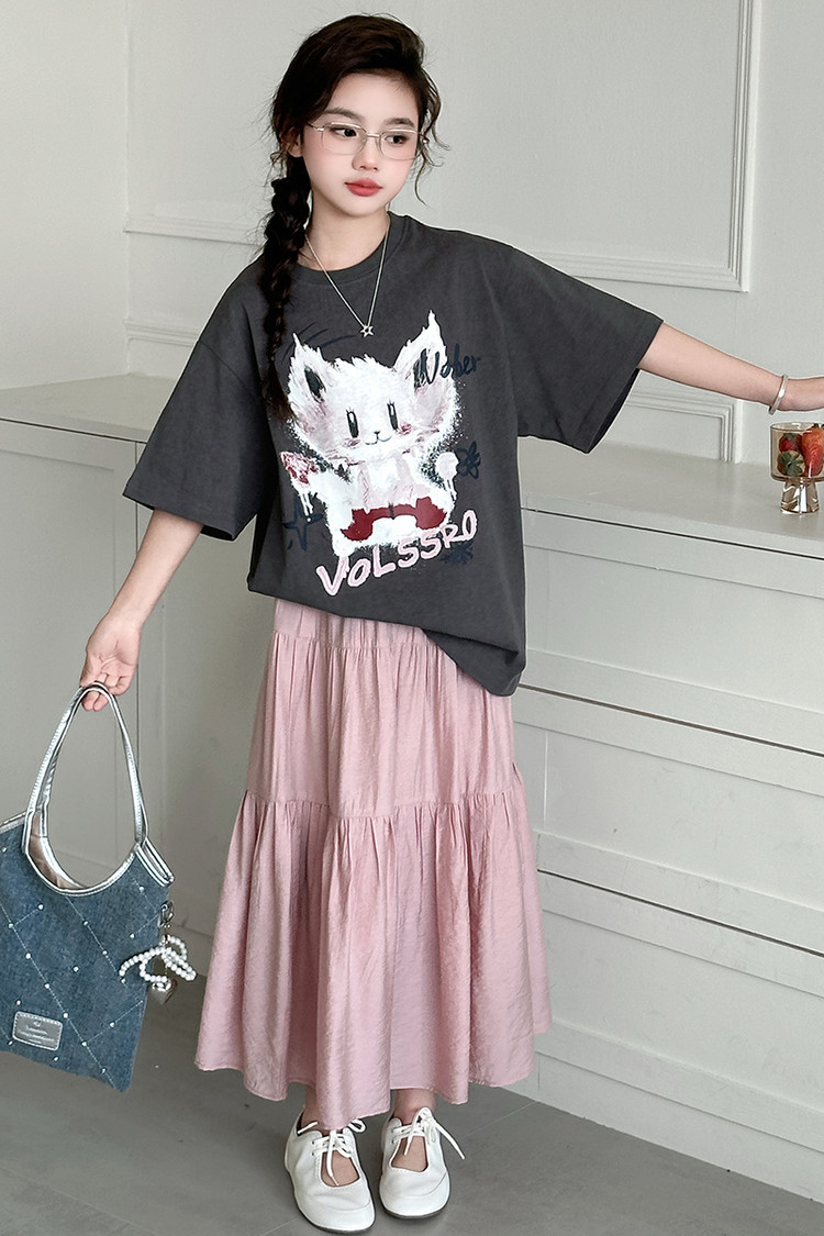 소녀 2025 새로운 여름 치마 세트 서양식 캐주얼 큰 어린이 만화 티셔츠 투피스 세트