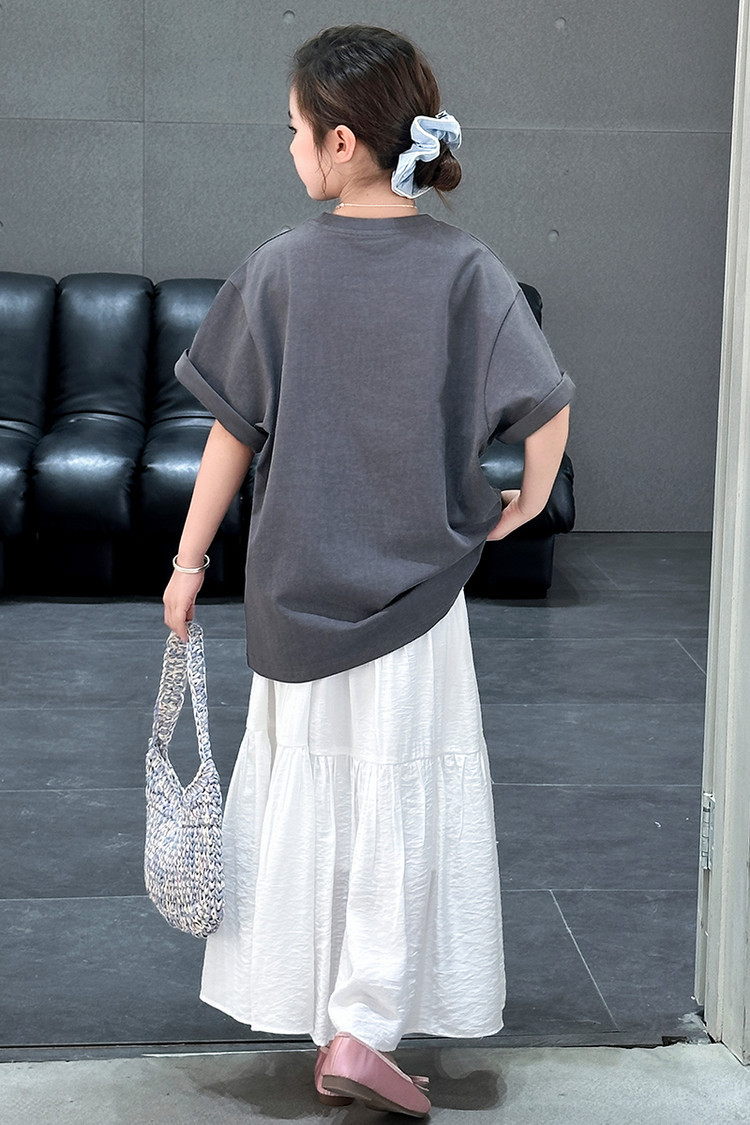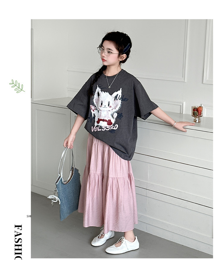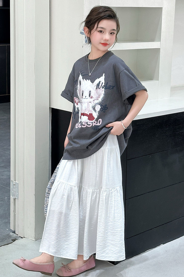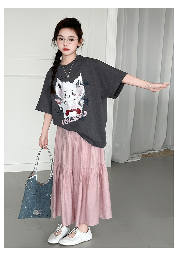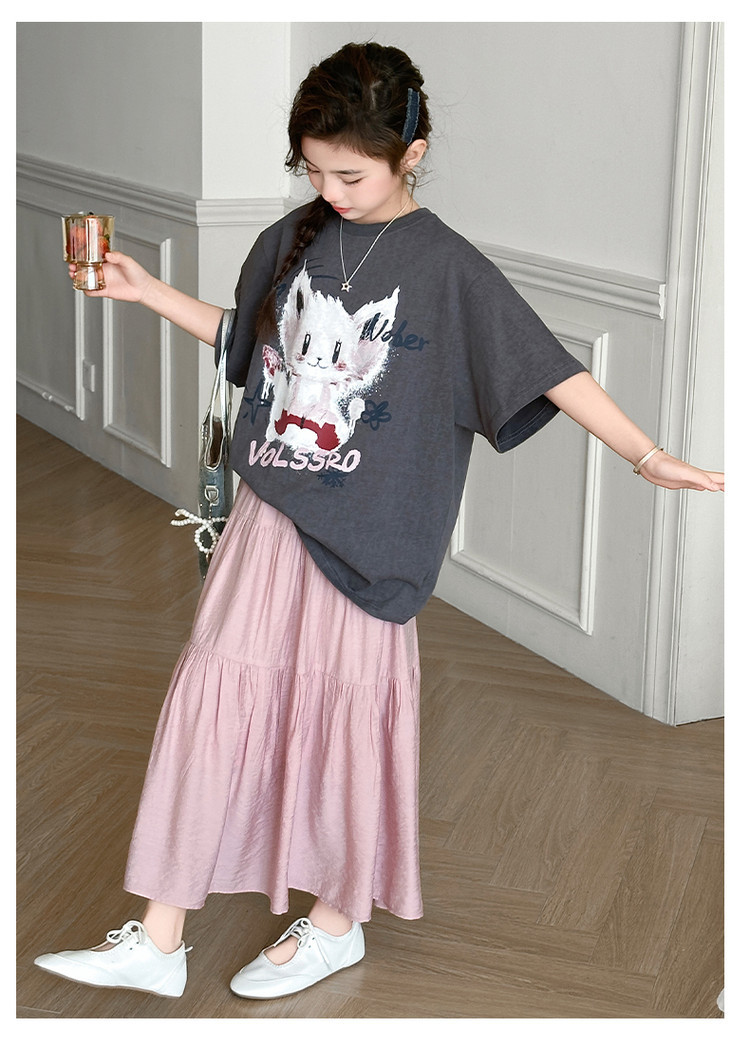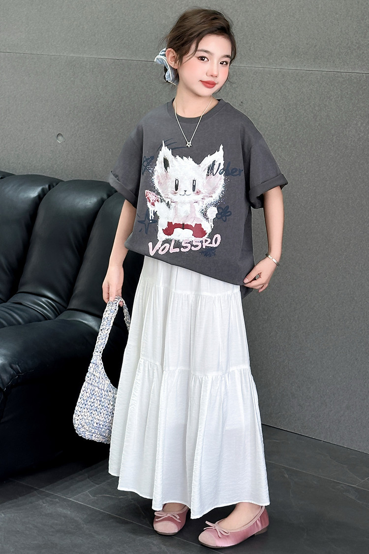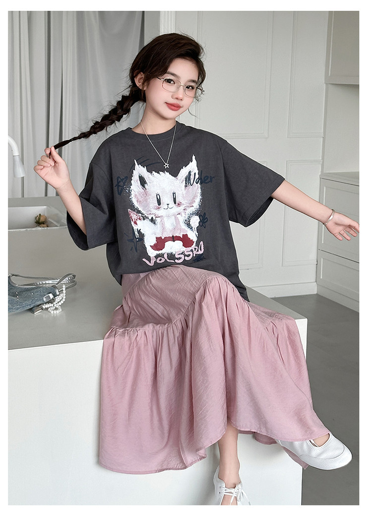 소녀 2025 새로운 여름 치마 세트 서양식 캐주얼 큰 어린이 만화 티셔츠 투피스 세트