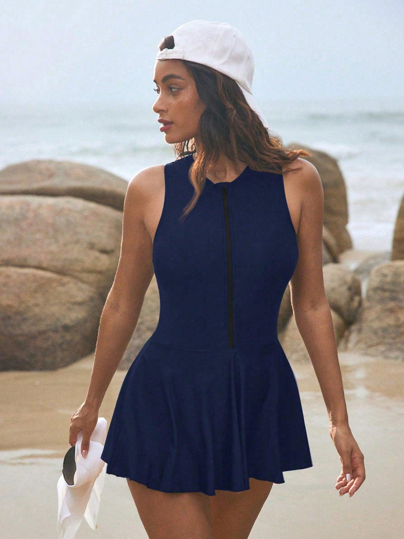 여성을 위한 새로운 국경 간 유럽과 미국의 원피스 수영복 단색 보수적인 스커트 스타일 슬림 슬리밍 민소매 짧은 스커트 대외 무역 수영복스토어 가기