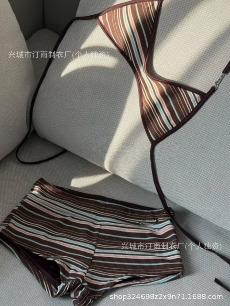 여성 분할 수영복 한국식 Ins 순수 프랑스 스타일 복고풍 섹시한 줄무늬 작은 가슴 수집 높은 허리 보수 수영복