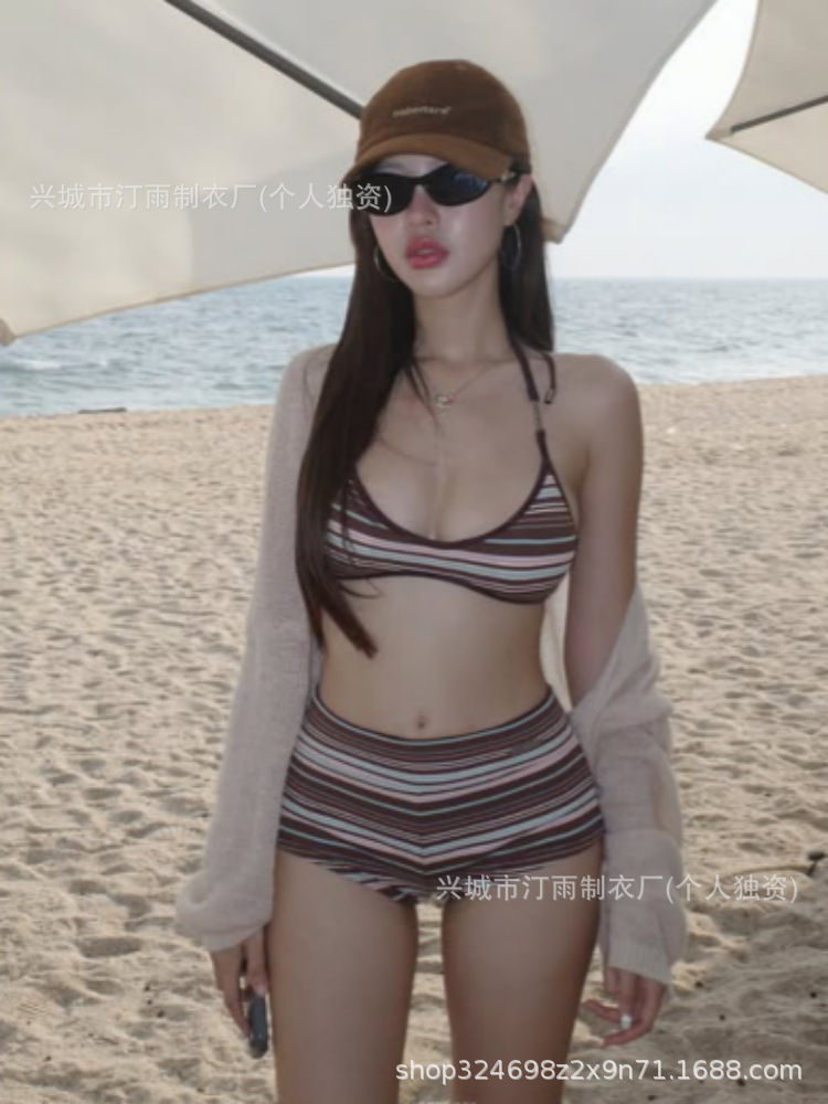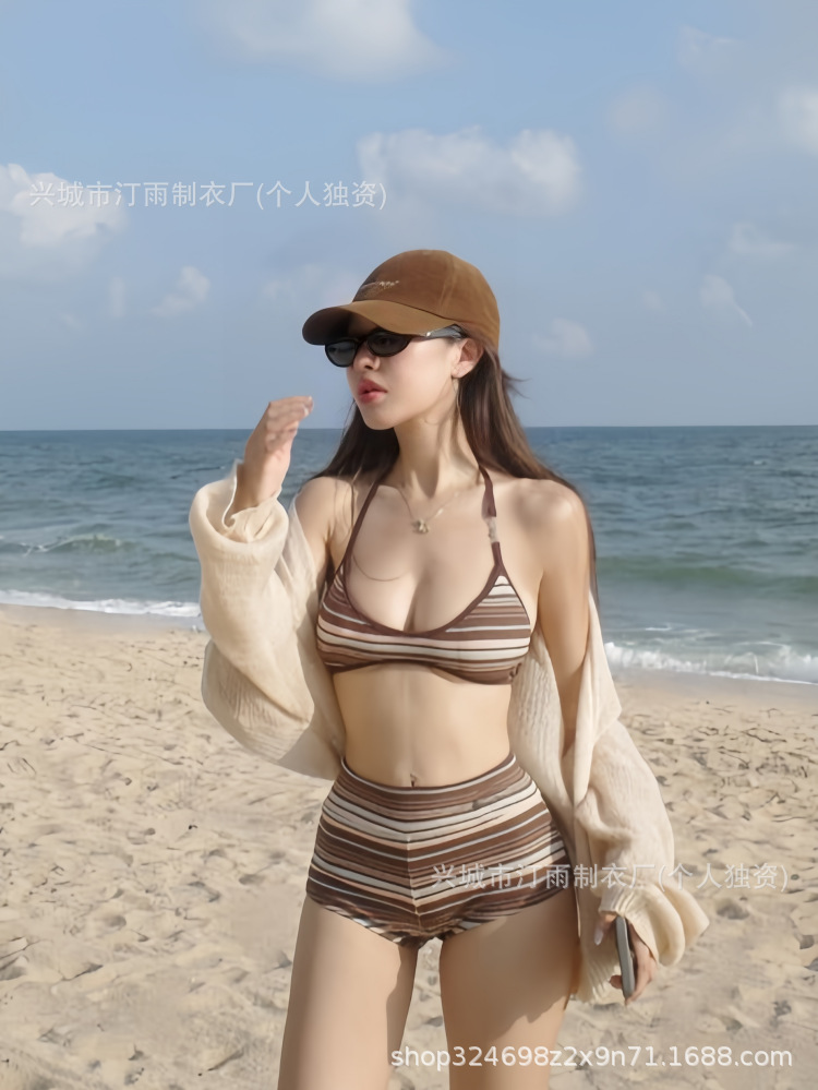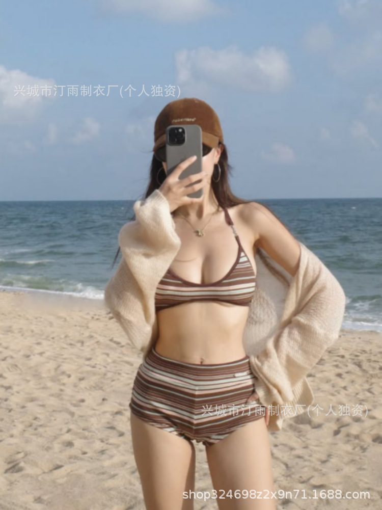 여성 분할 수영복 한국식 Ins 순수 프랑스 스타일 복고풍 섹시한 줄무늬 작은 가슴 수집 높은 허리 보수 수영복스토어 가기