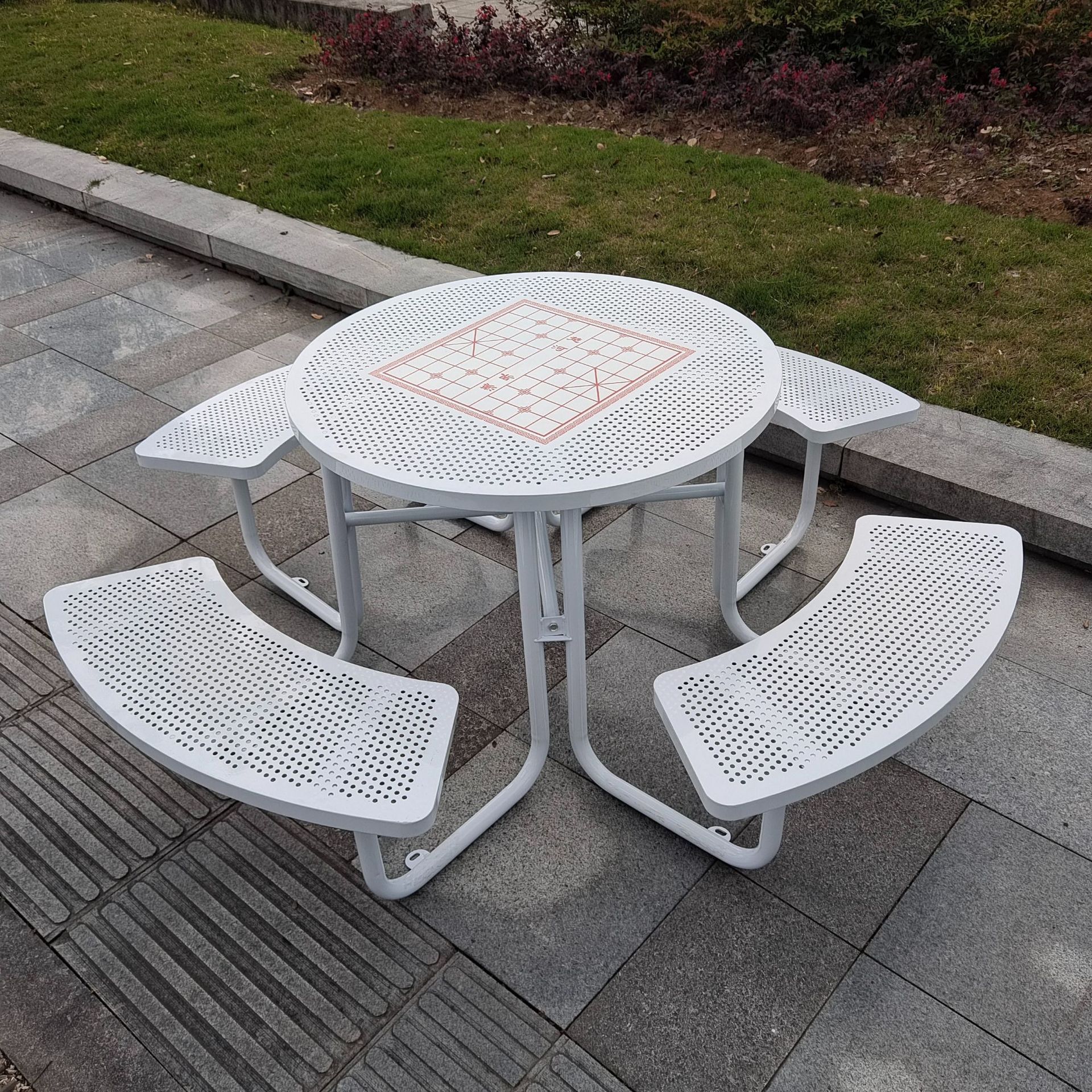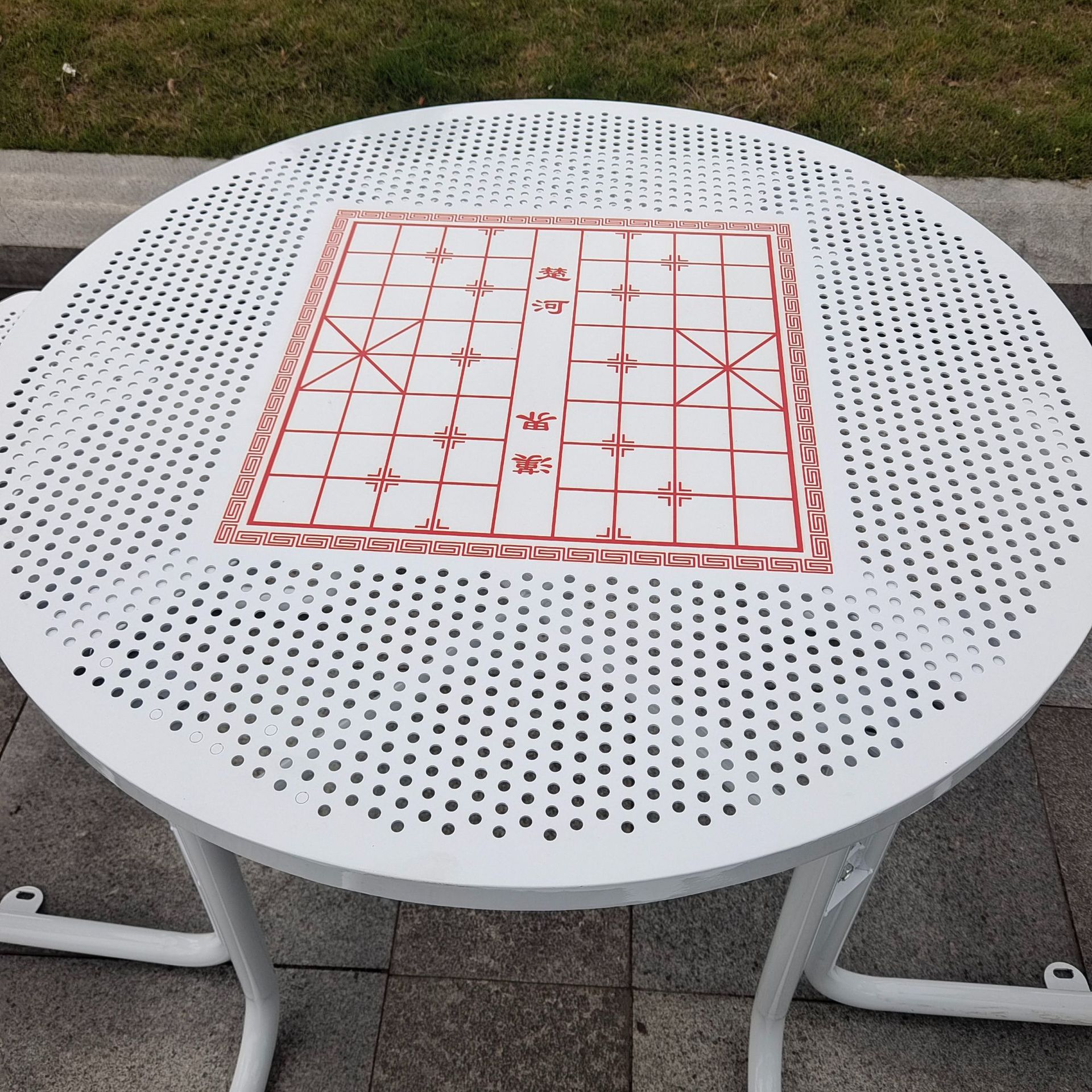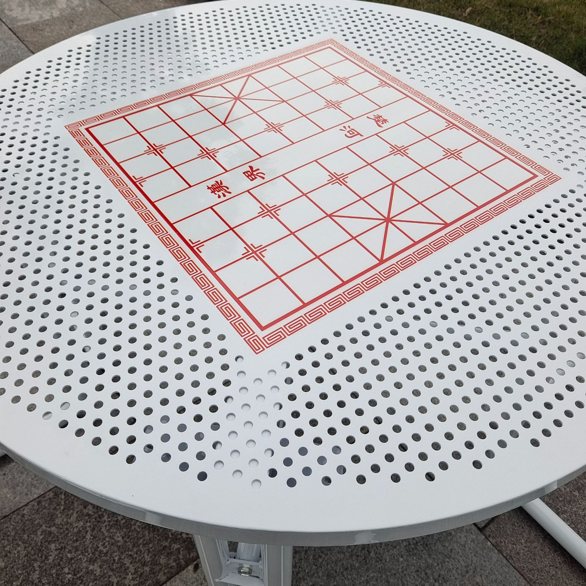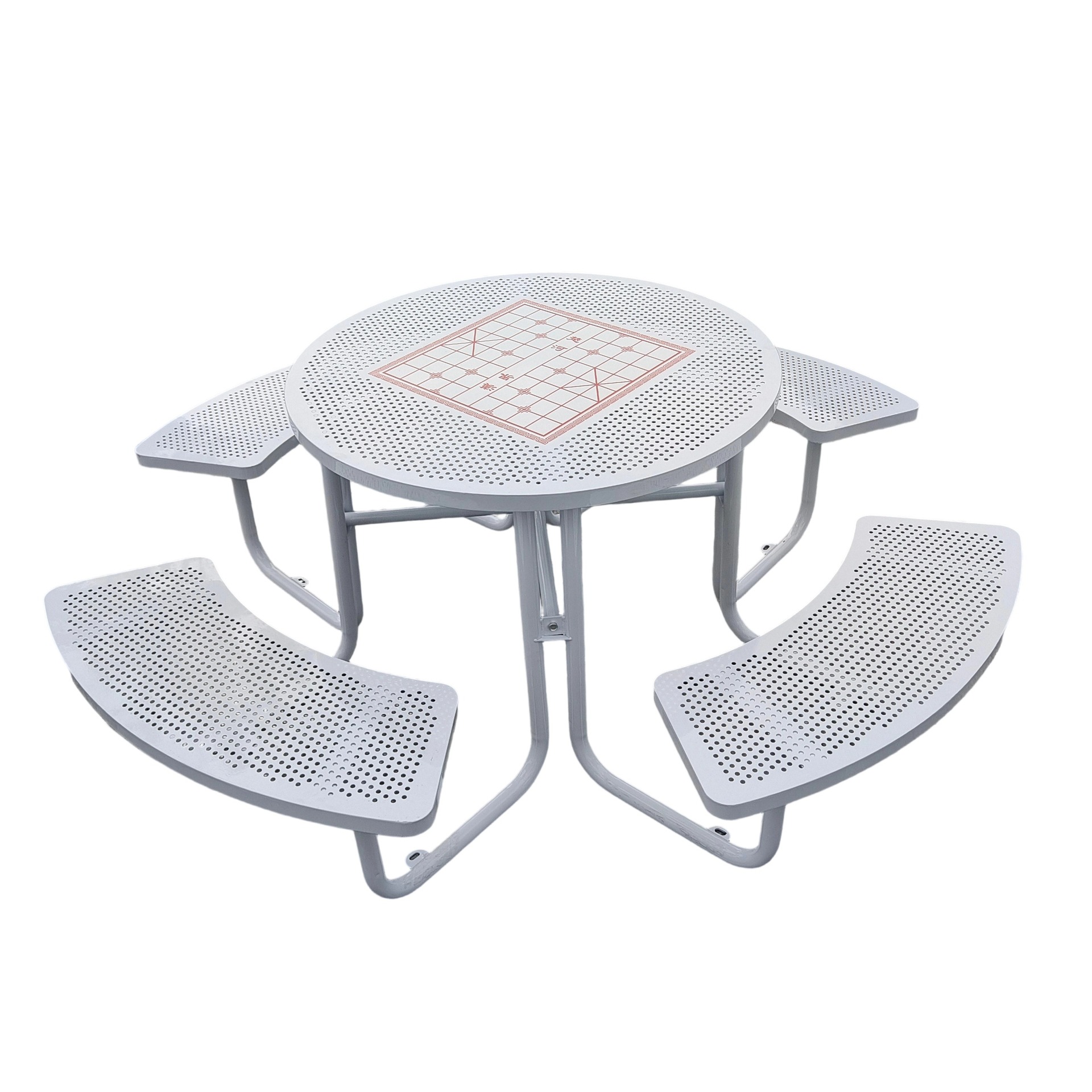 • 체커보드가 인쇄된 철제 흰색 원형 테이블