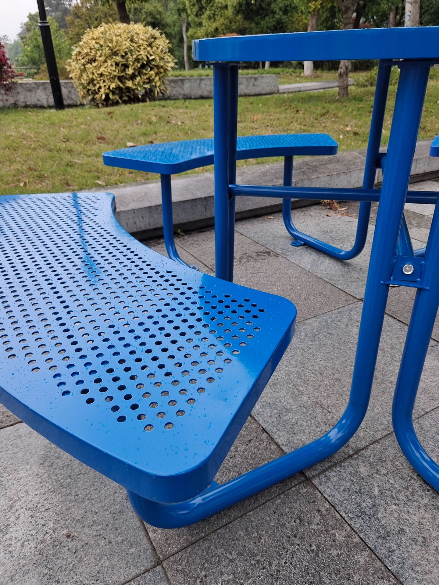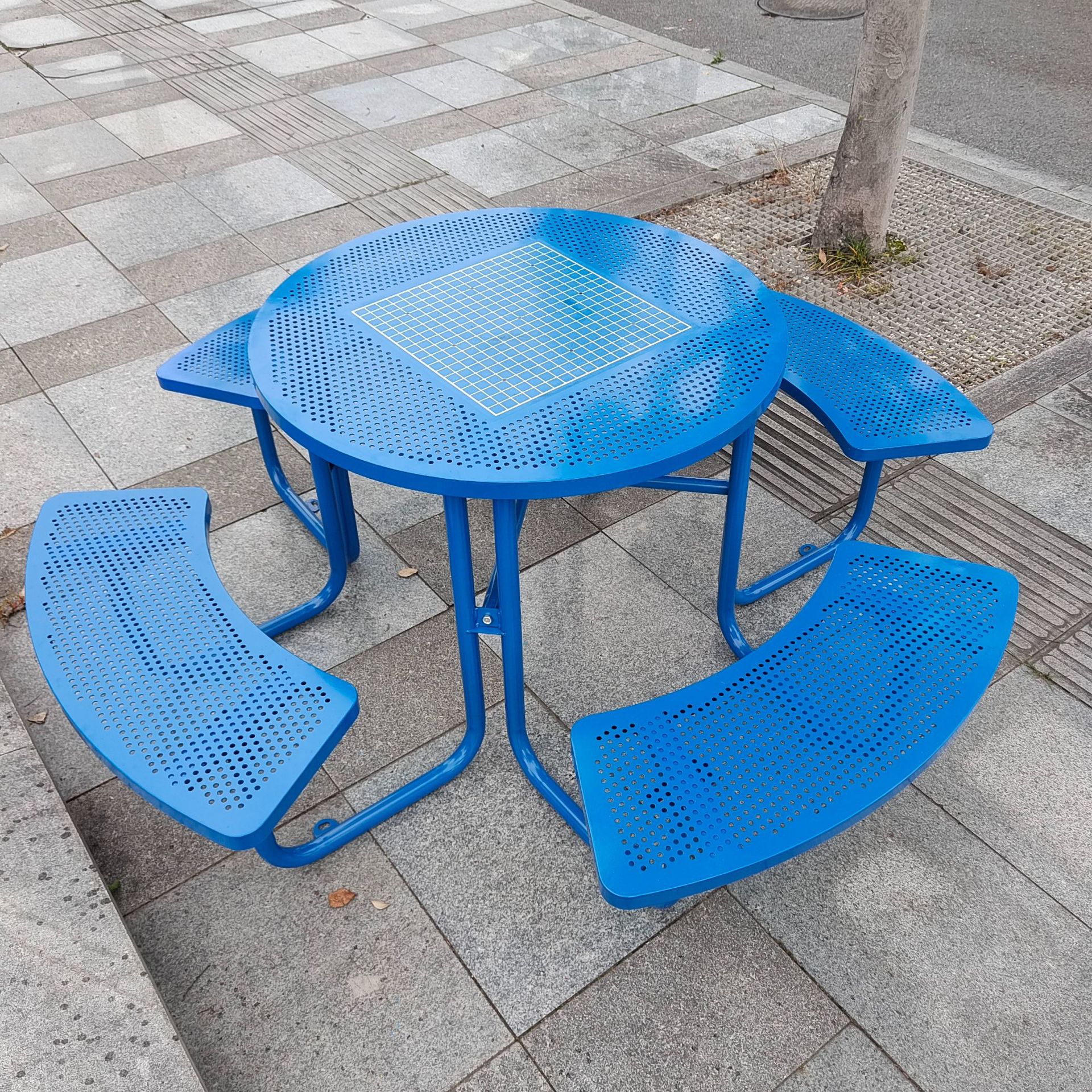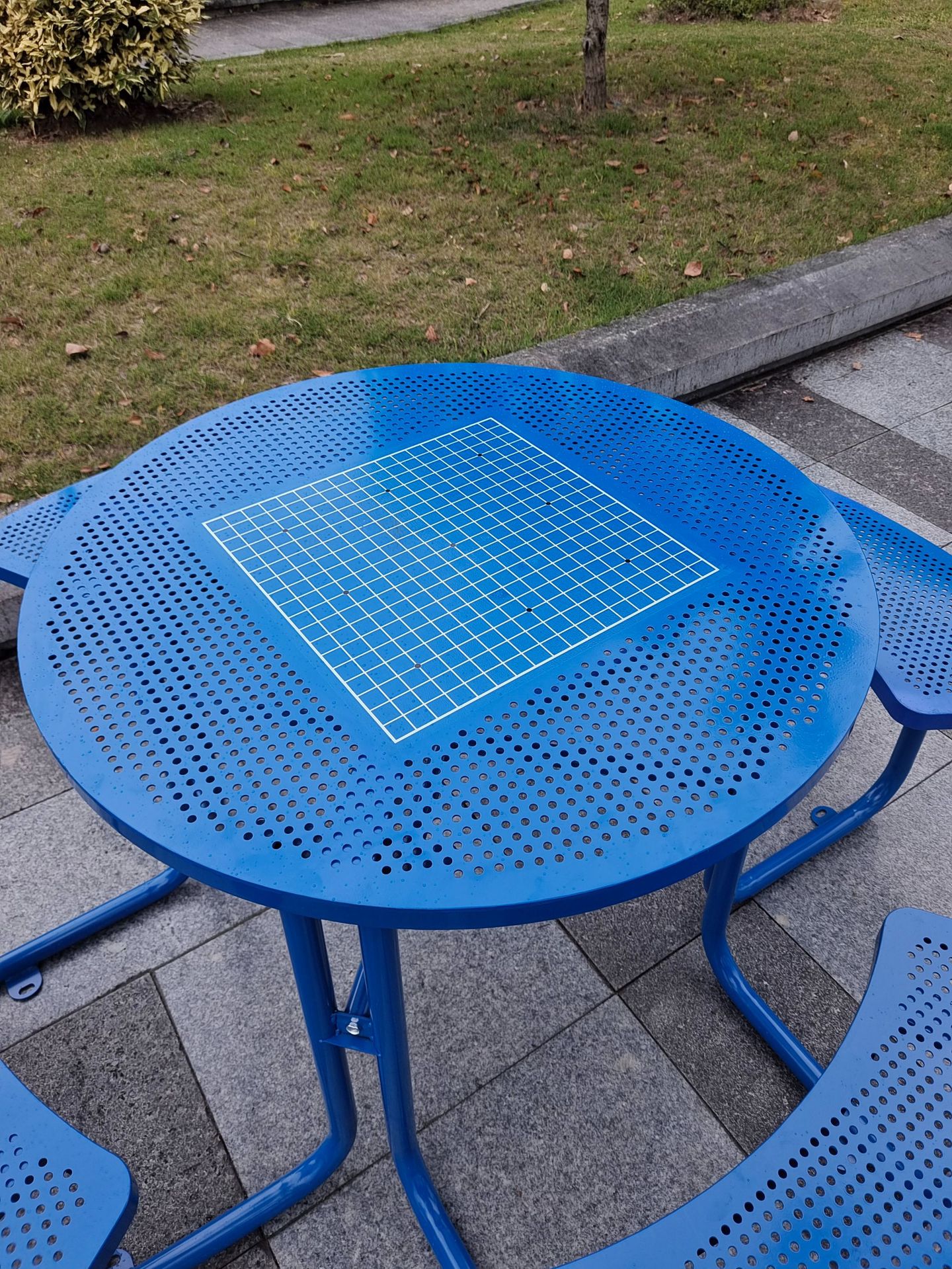 • 체커보드가 인쇄된 철제 파란색 원형 테이블