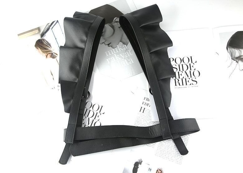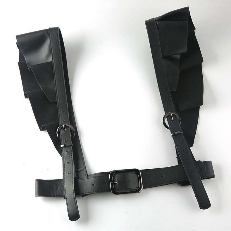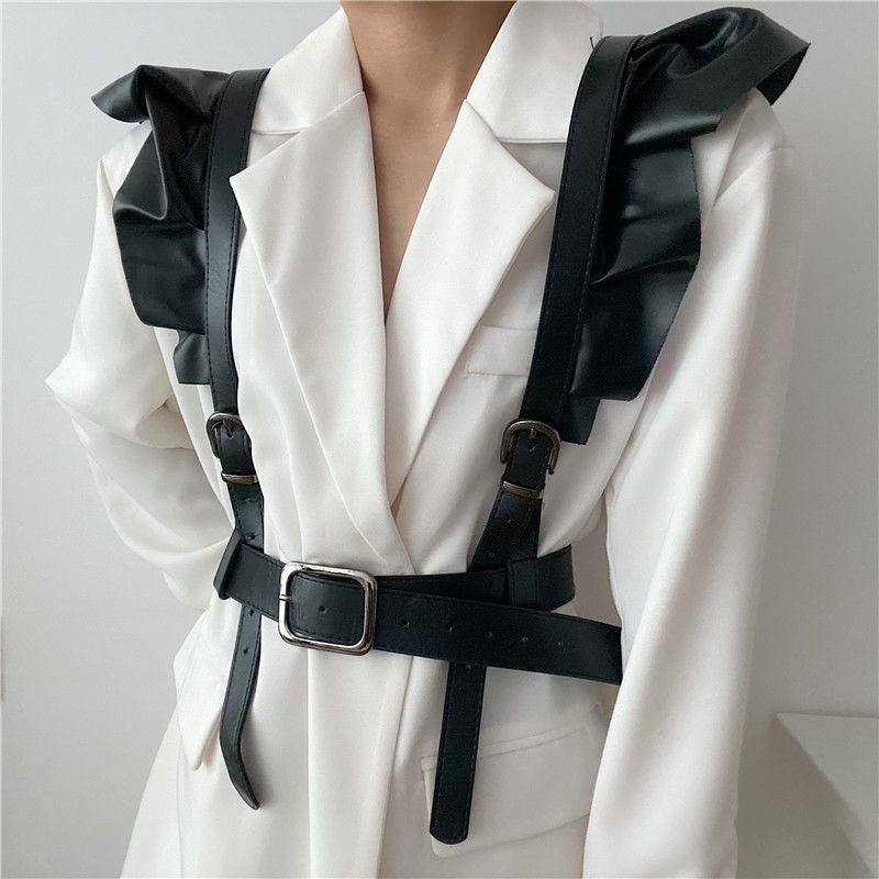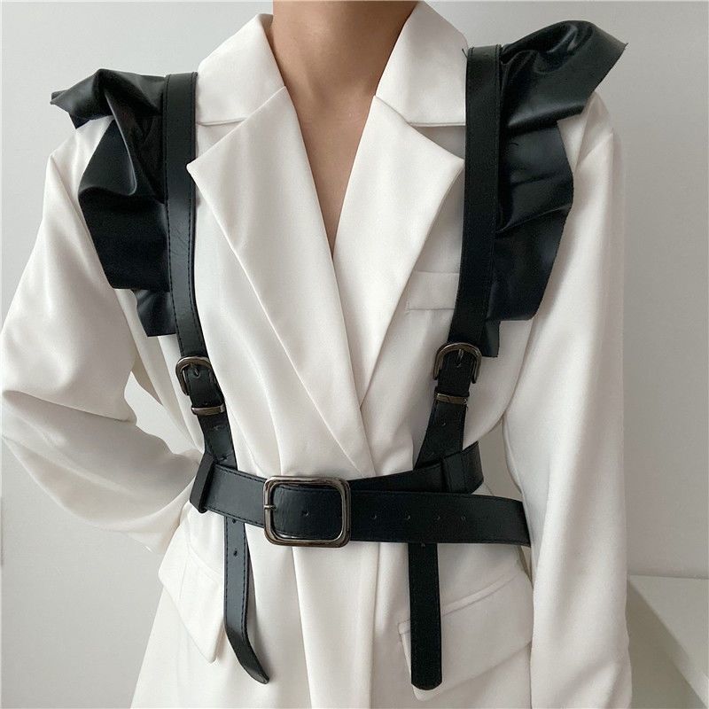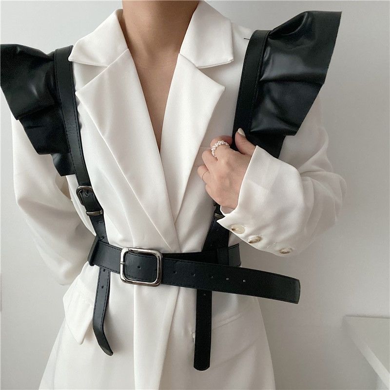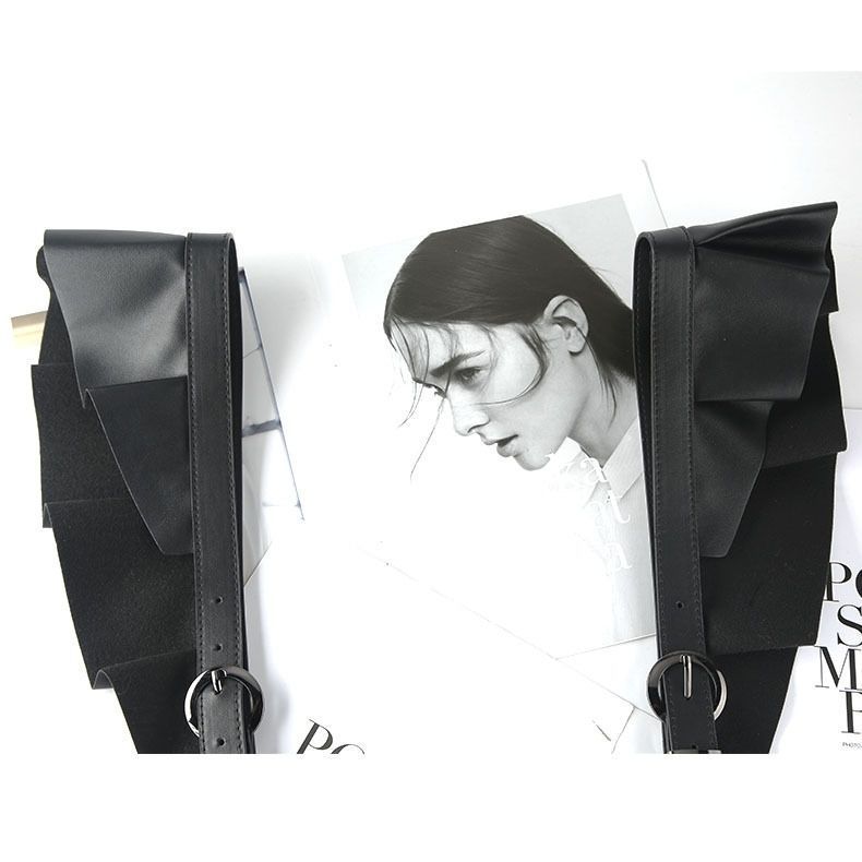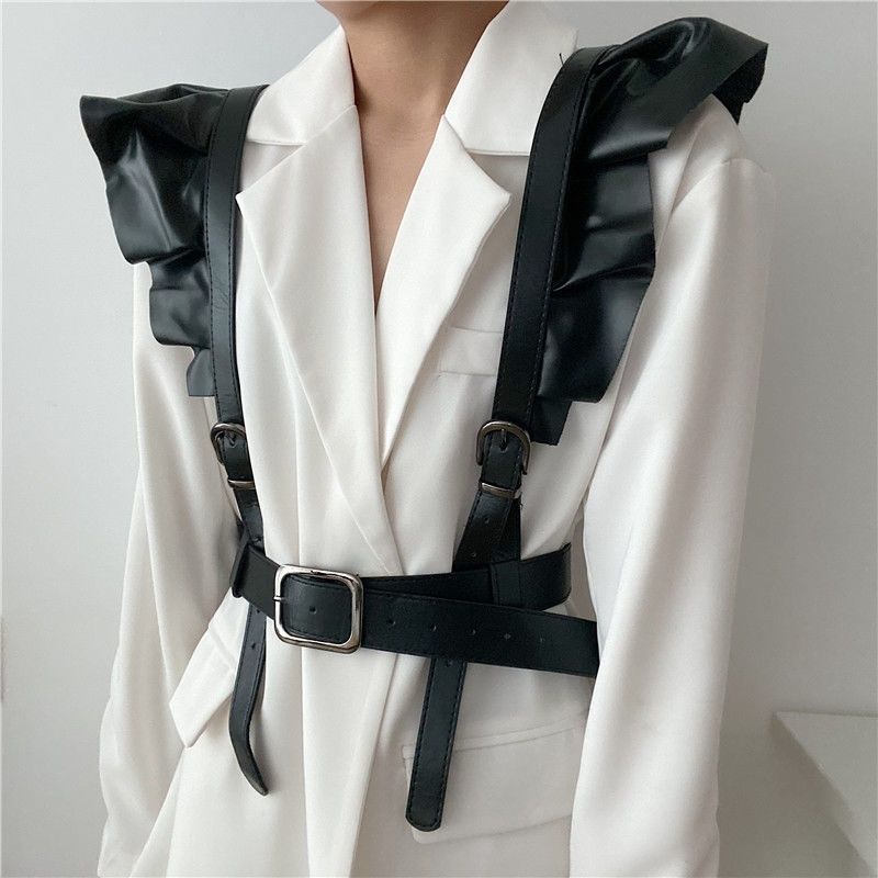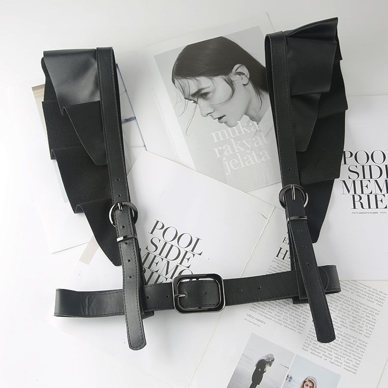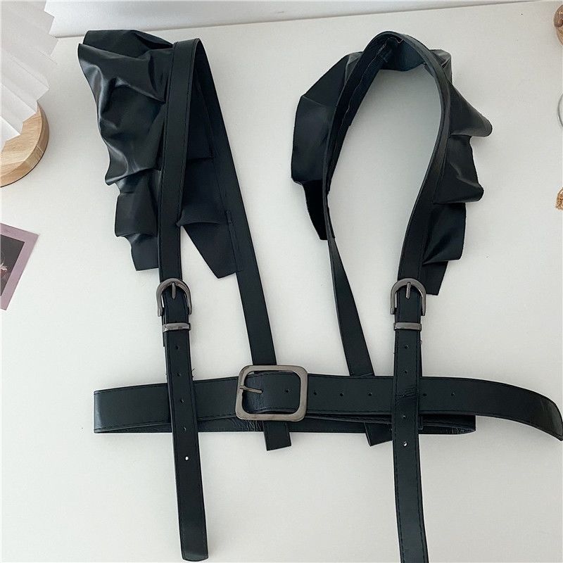 새로운 벨트과 어깨끈이 하나로 통합된 펑크 스타일 PU 블랙 복고풍 2열 레이스 장식 스트랩 스타일 여성용 외부 허리띠