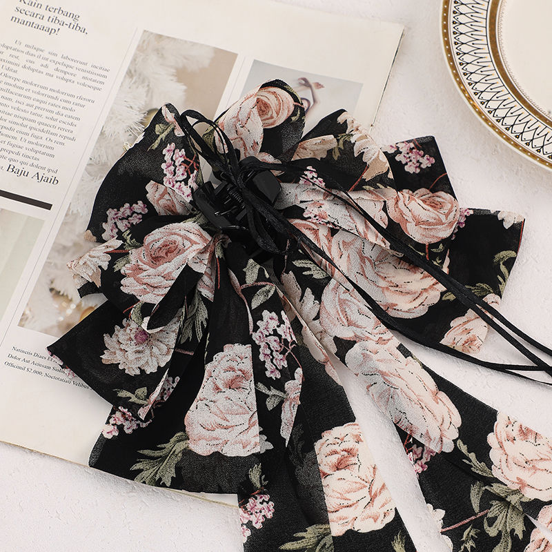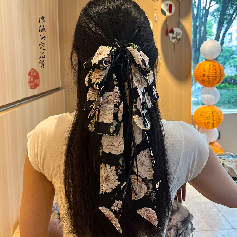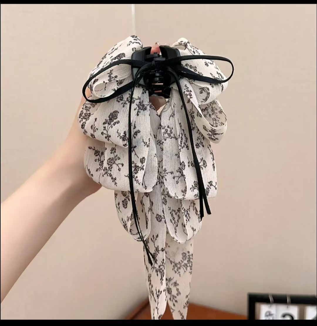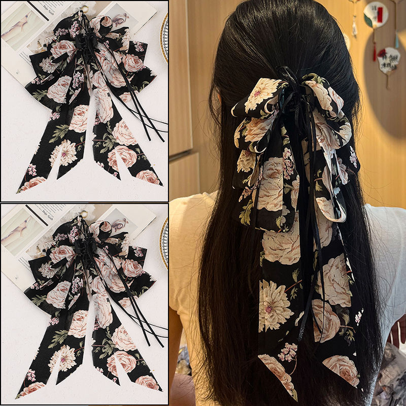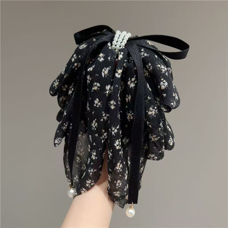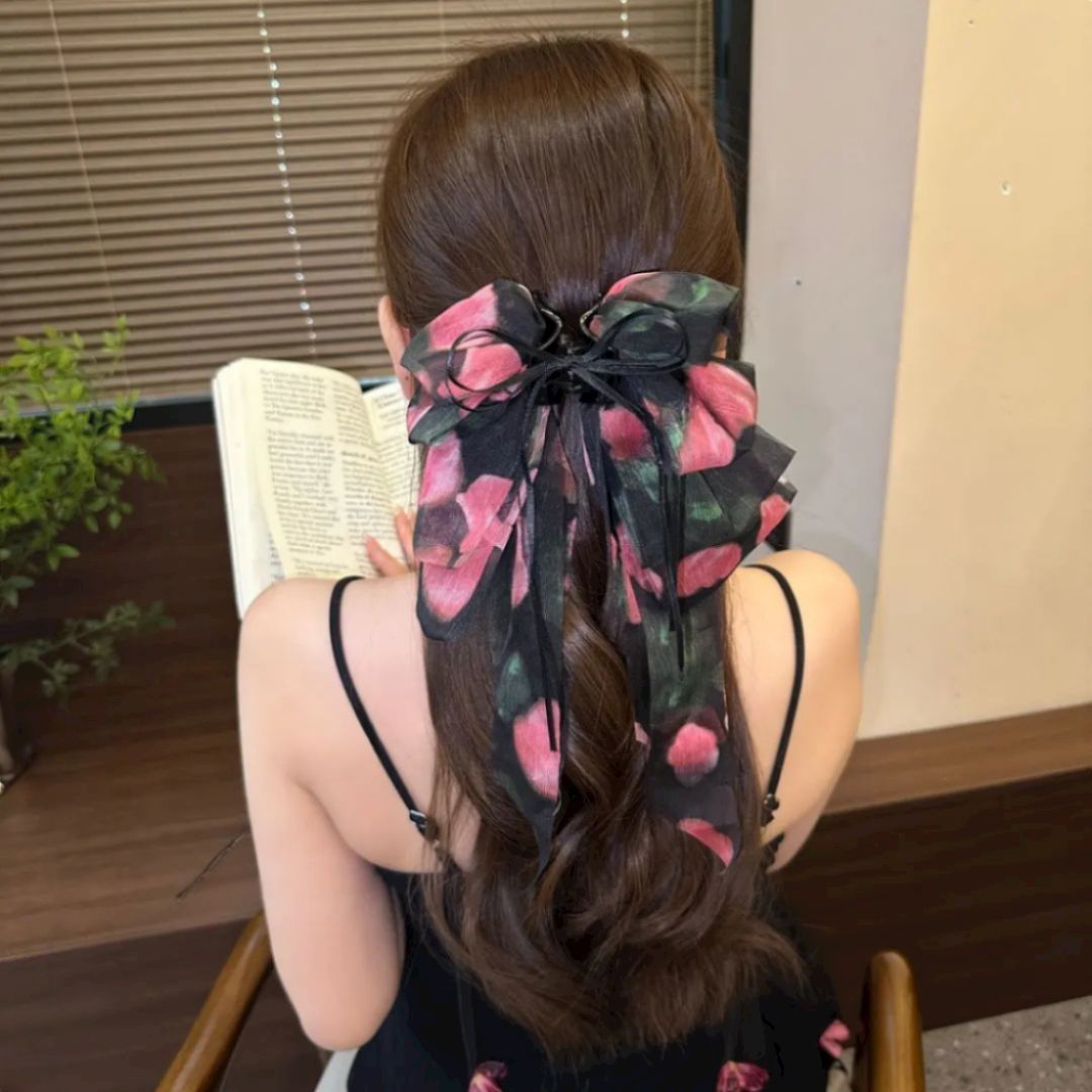 • 검정 플라워 롱 리본 집게핀