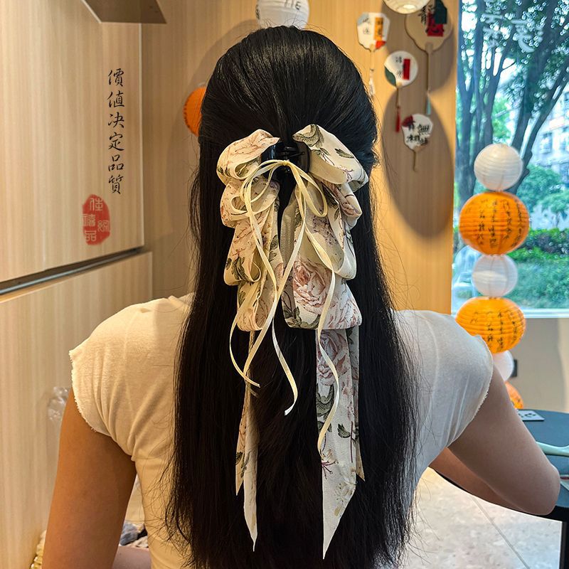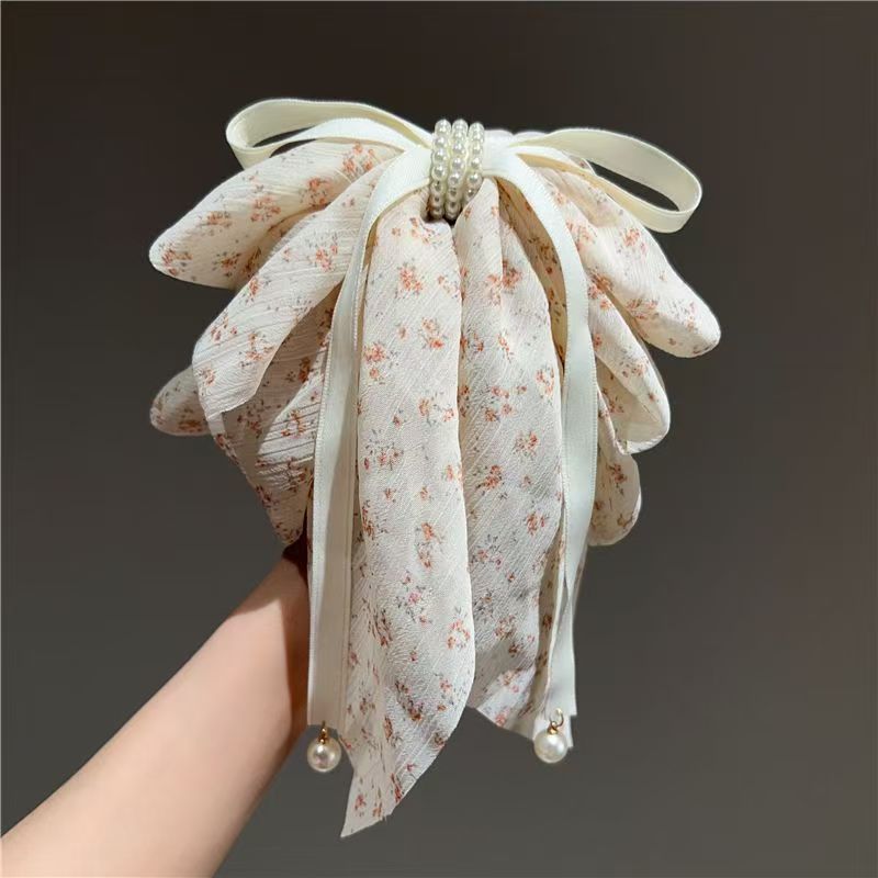 • 미색 플라워 롱 리본 집게핀