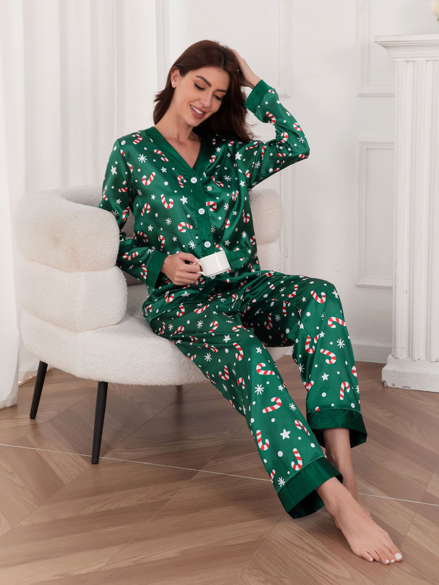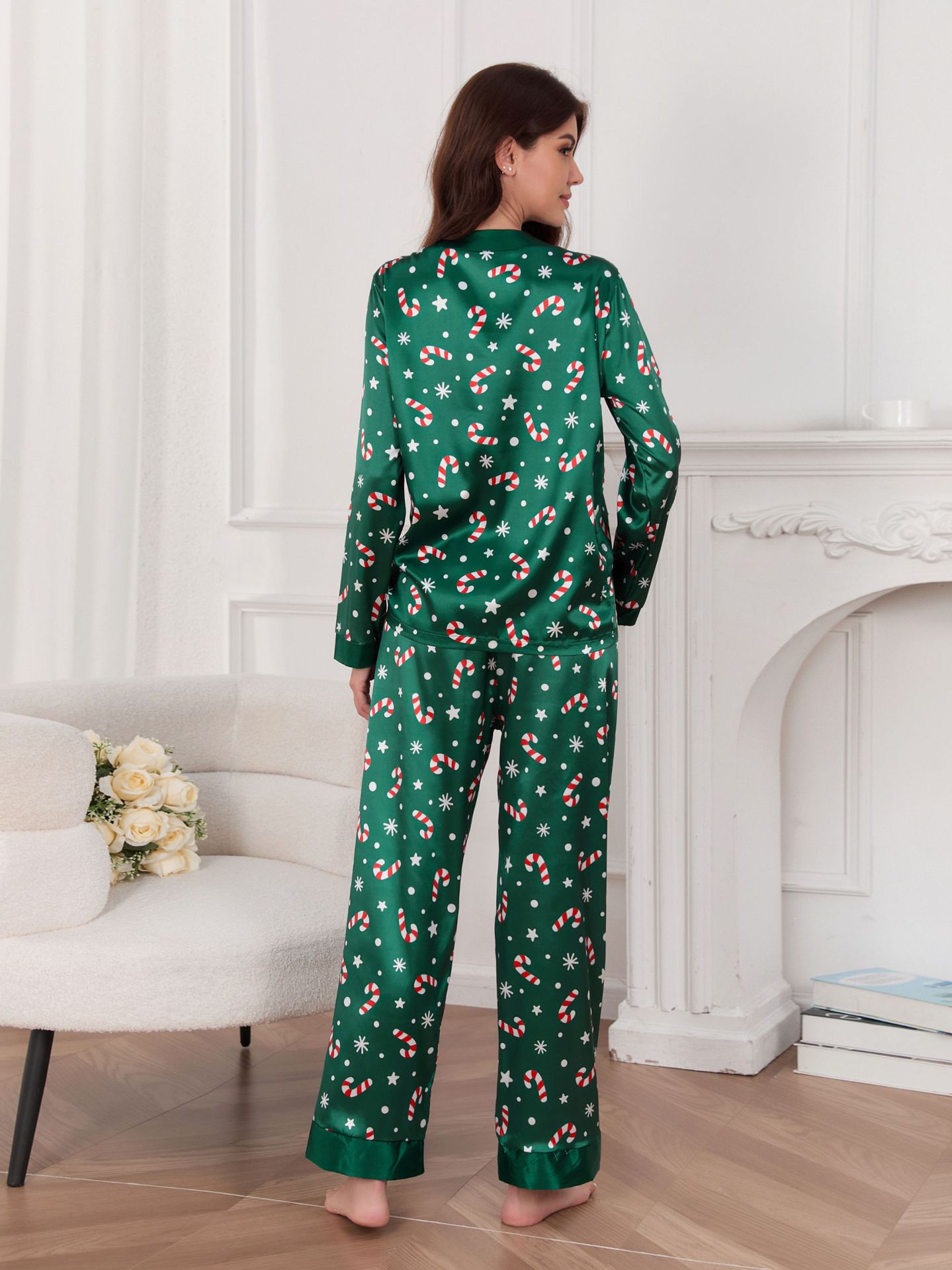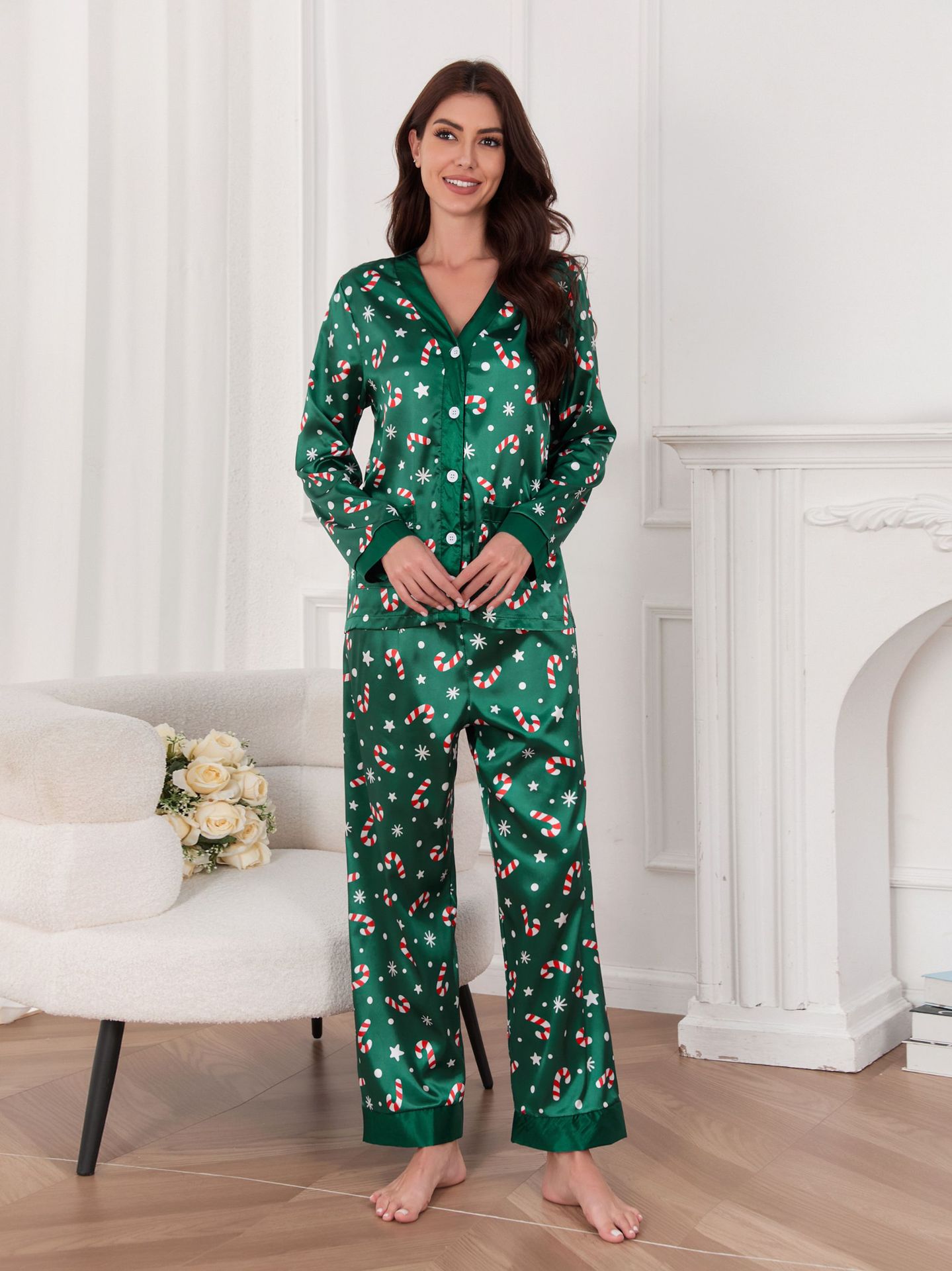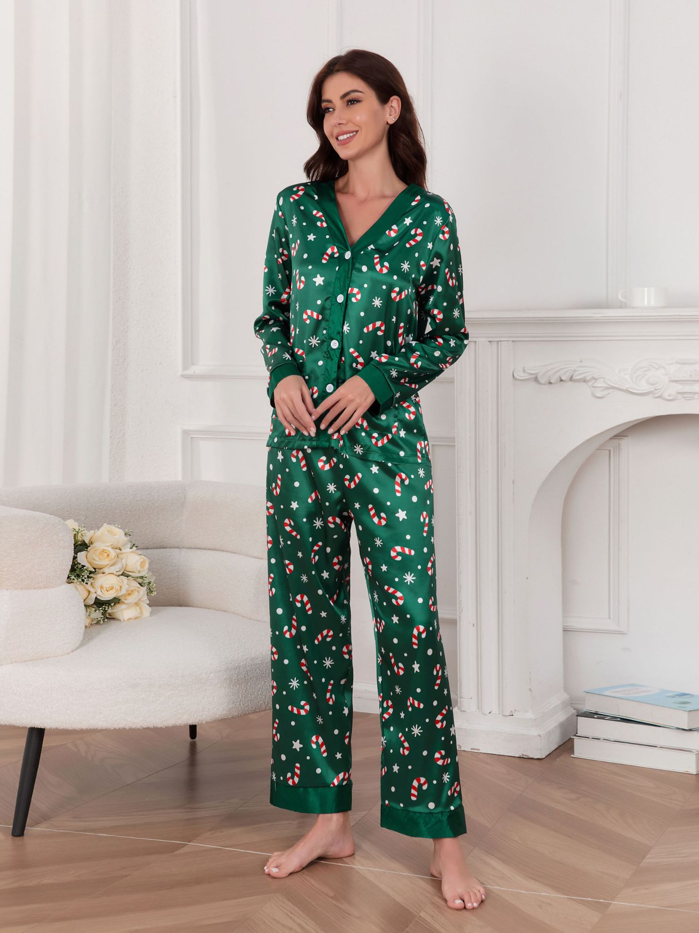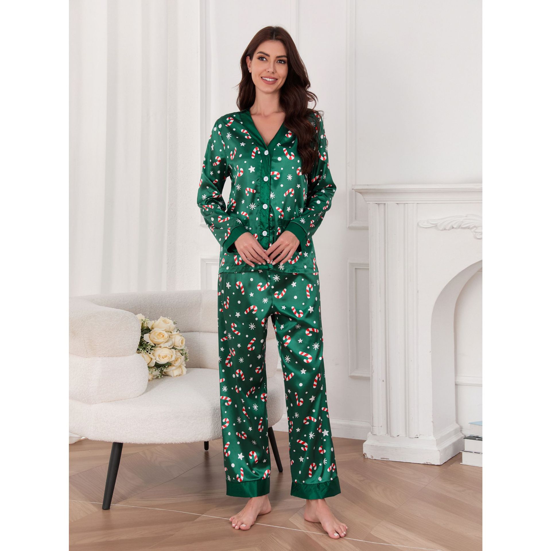 대외 무역 인기 판매 새로운 크리스마스 의류 봄, 가을 여성용 잠옷 얇은 얼음 실크 긴팔 v 넥 카디건 홈웨어 세트스토어 가기