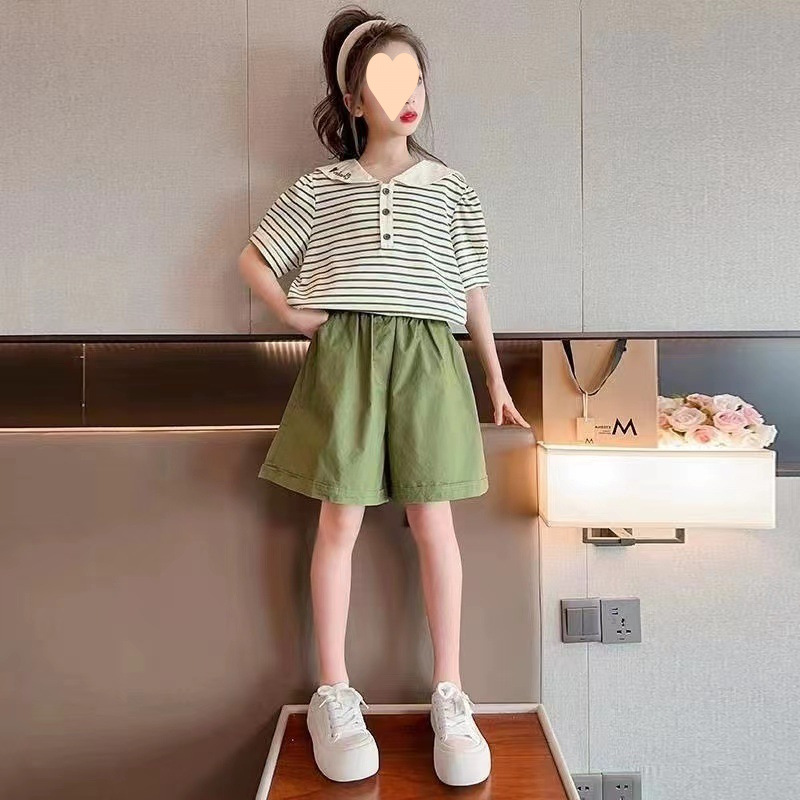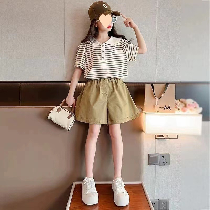 여자 여름 서양식 세트 2025 여름 원피스 중다 어린이 대학 캐주얼 스트라이프 반팔 와이드 레그 반바지 투피스 세트스토어 가기