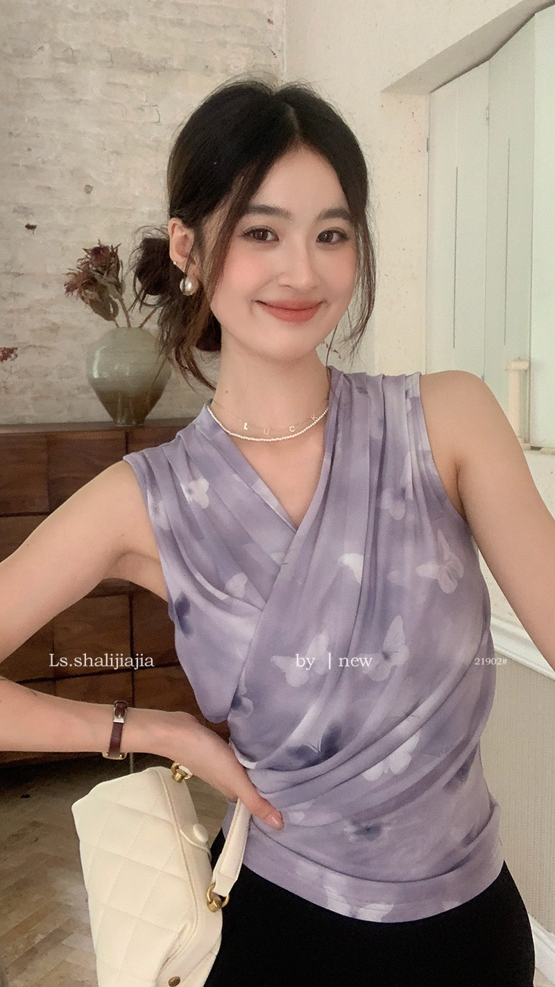LS 민소매 꽃 V넥 셔츠 광저우 13 라인 2024 여름 새로운 여성복 21902 # 패션 조커