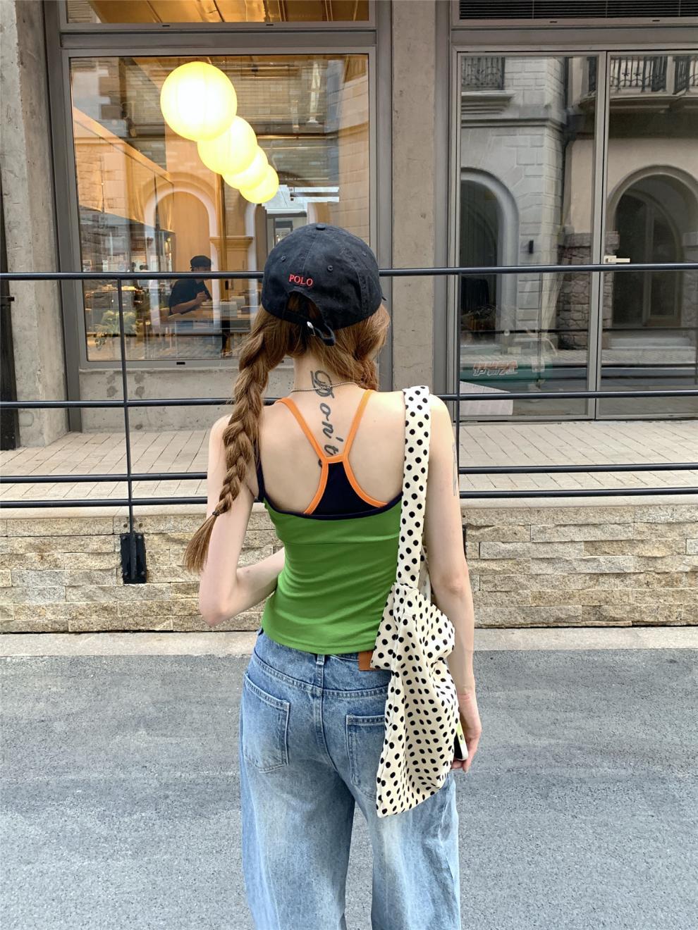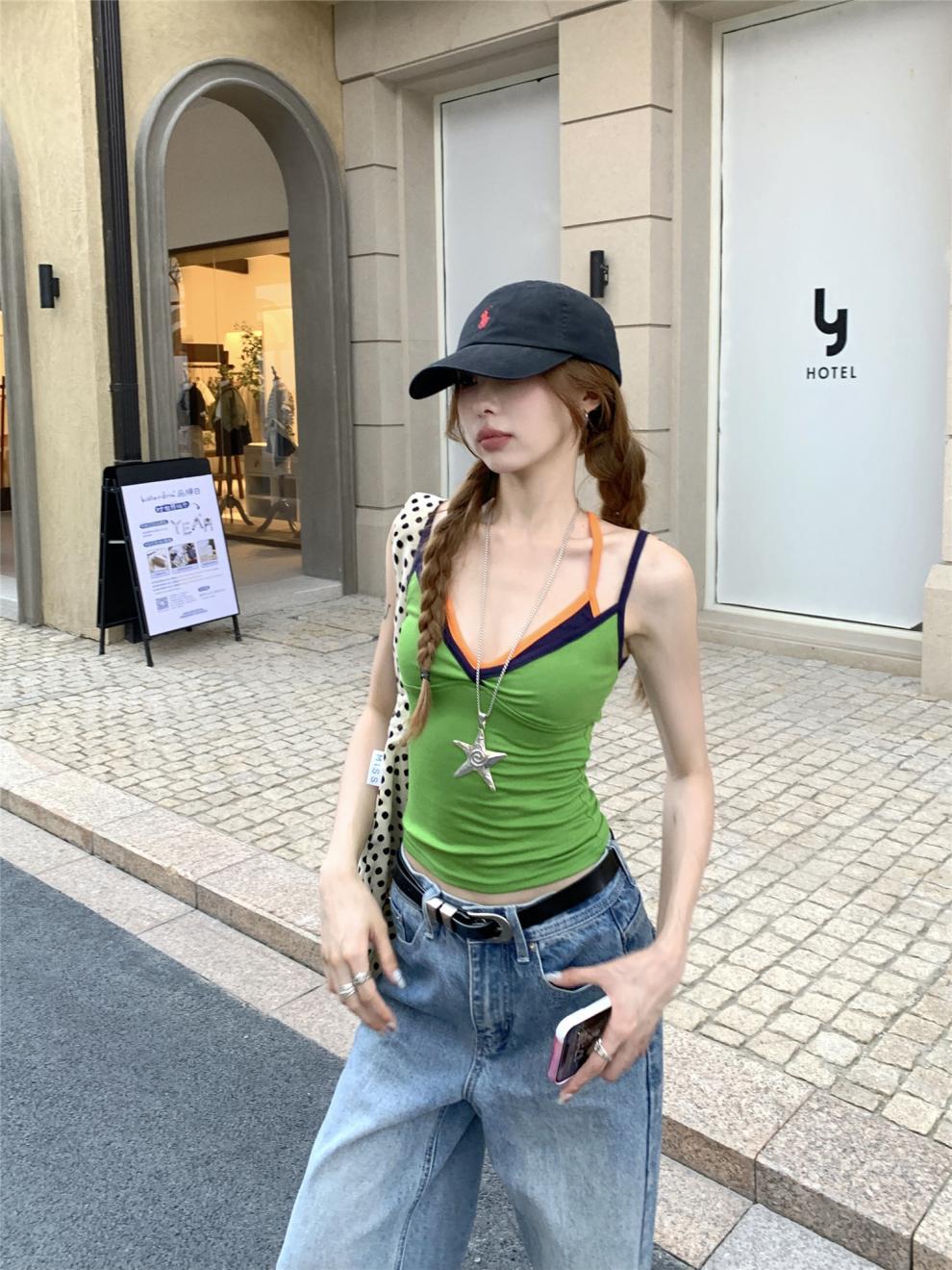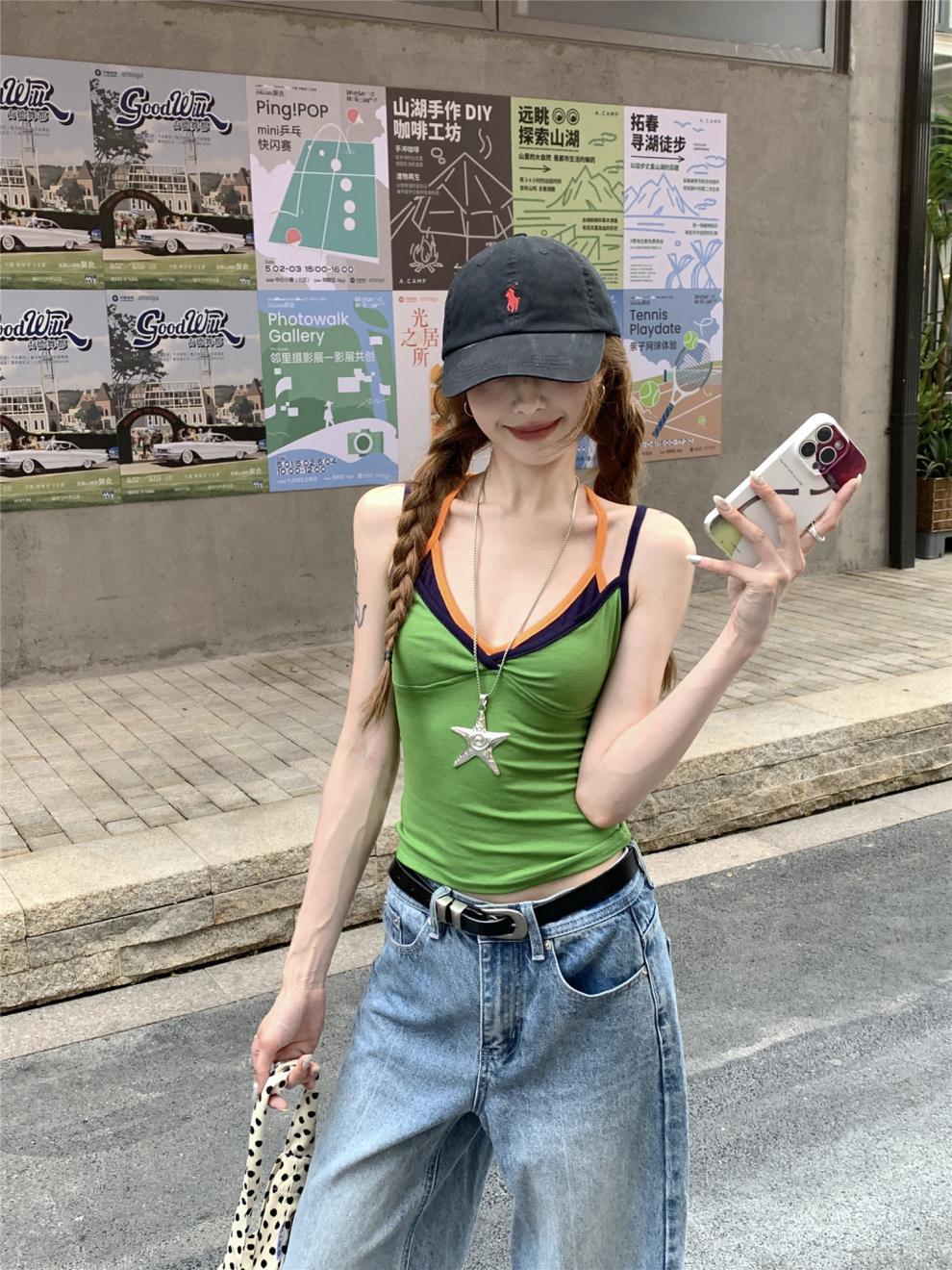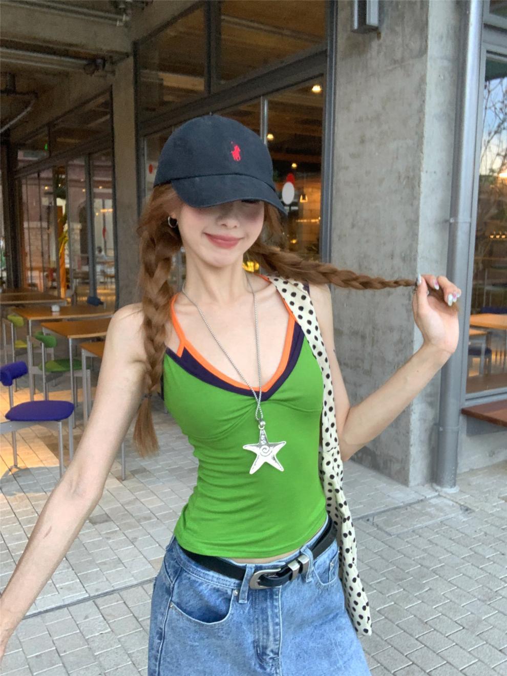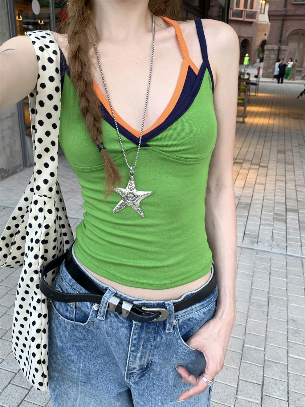 실제 샷 실제 가격 ~ 도파민 착용 녹색 가짜 투피스 캐미솔 여성 겉옷 슬림 쇼트 탑스토어 가기