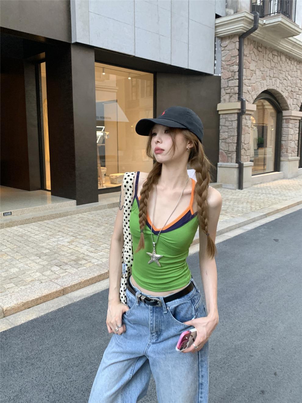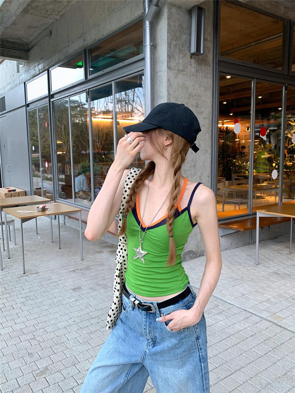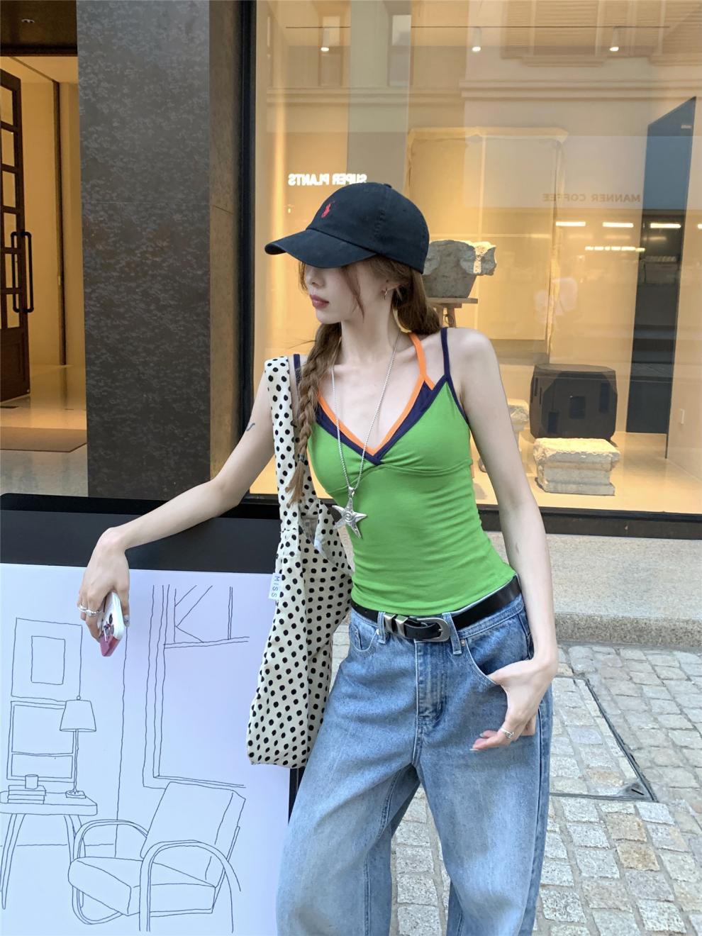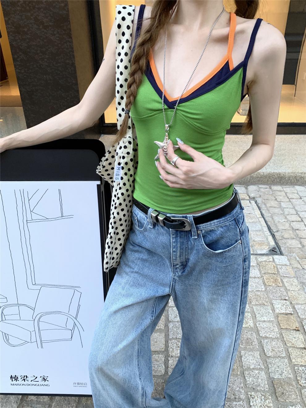 실제 샷 실제 가격 ~ 도파민 착용 녹색 가짜 투피스 캐미솔 여성 겉옷 슬림 쇼트 탑스토어 가기