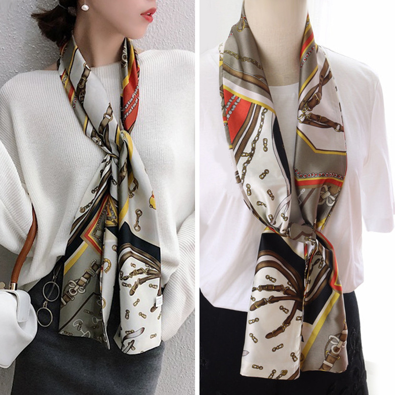 실크 스카프 새로운 스타일 2023 인기 가을, 겨울 유행 검은 한국 스타일 얇은 황금 가을 작은 긴 스카프 여성용